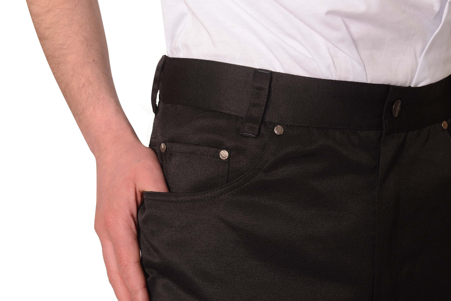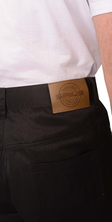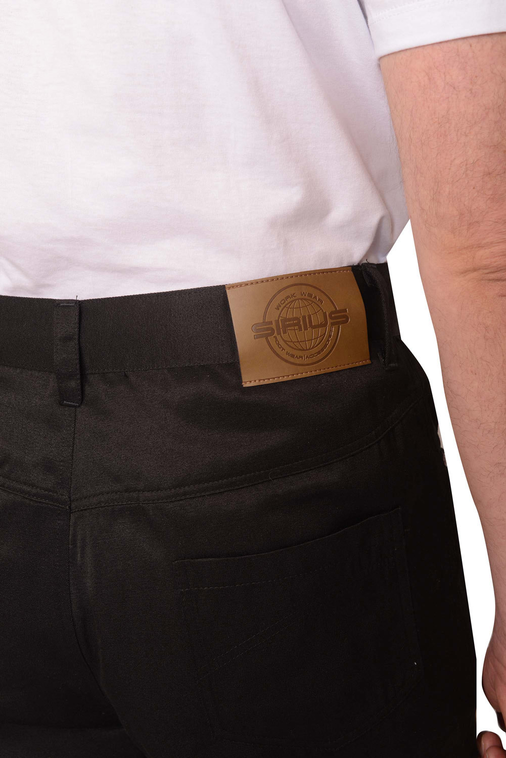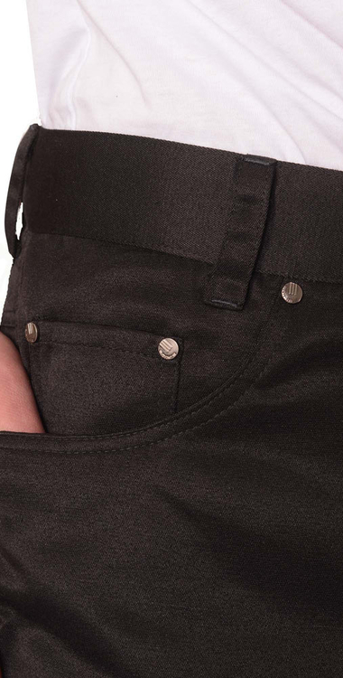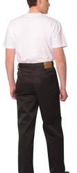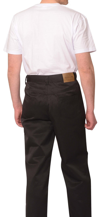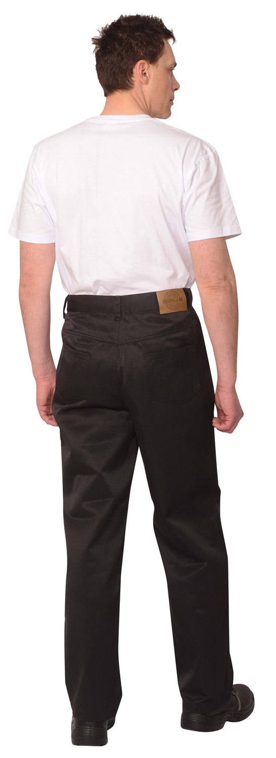 Брюки с застежкой спереди на тесьму "молния", боковыми внутренними карманами, отрезной кокеткой и двумя накладными карманами на задних половинках, с притачным поясом со шлевками, застегивающимся на петлю и пуговицу. Со стороны спинки справа на пояс настрачивается кожаная нашивка-логотип.