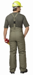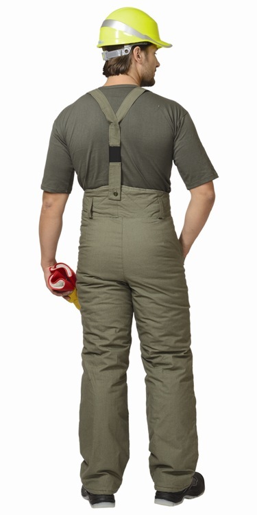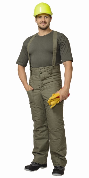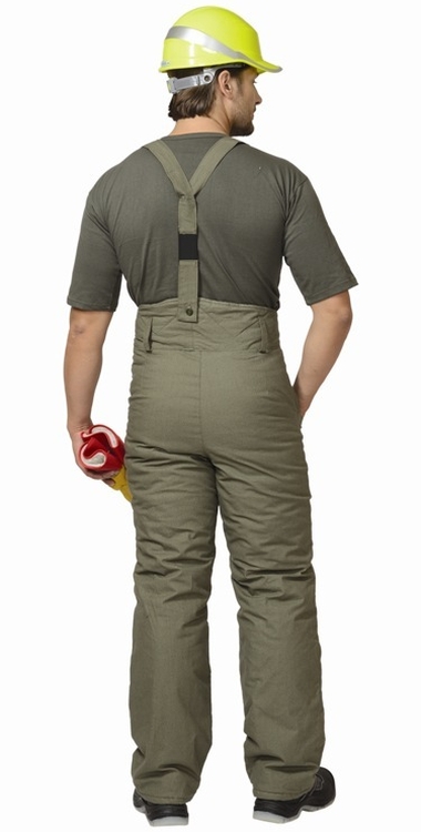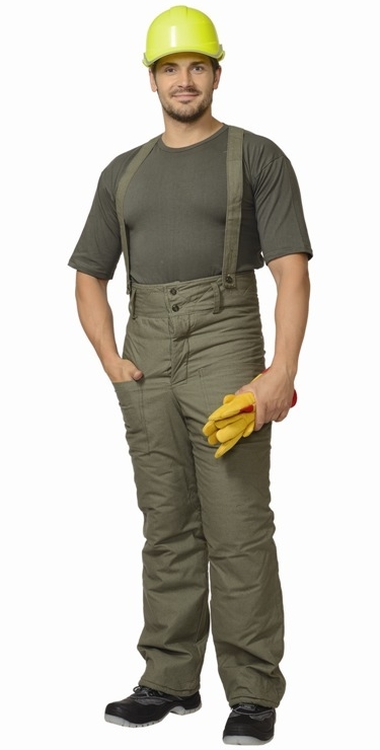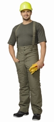 Полотно палаточное, 100% х/б. Утеплитель: ватин 600 г/кв.м. Подкладка: бязь. Застёжка высокого пояса и гульфика на пуговицы, бретели, карманы.