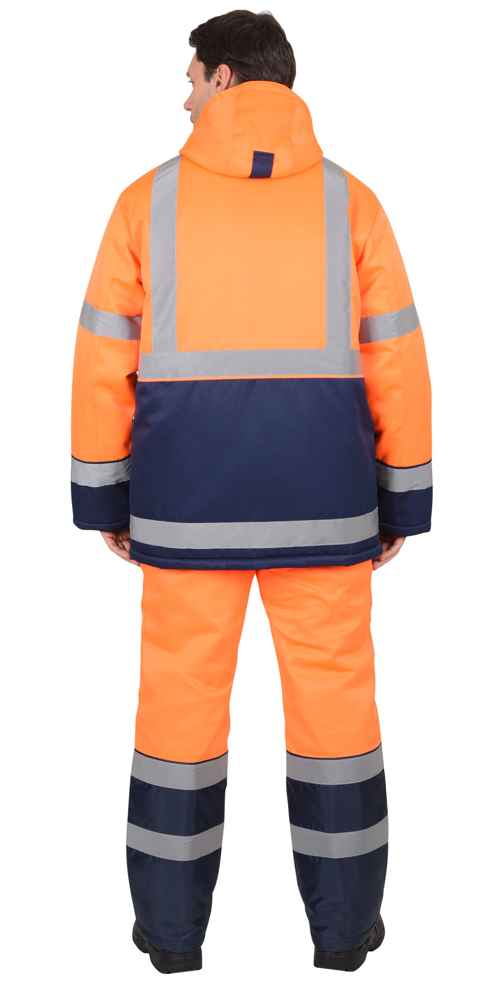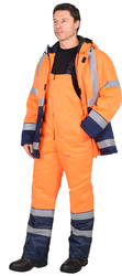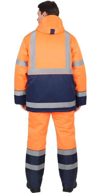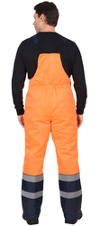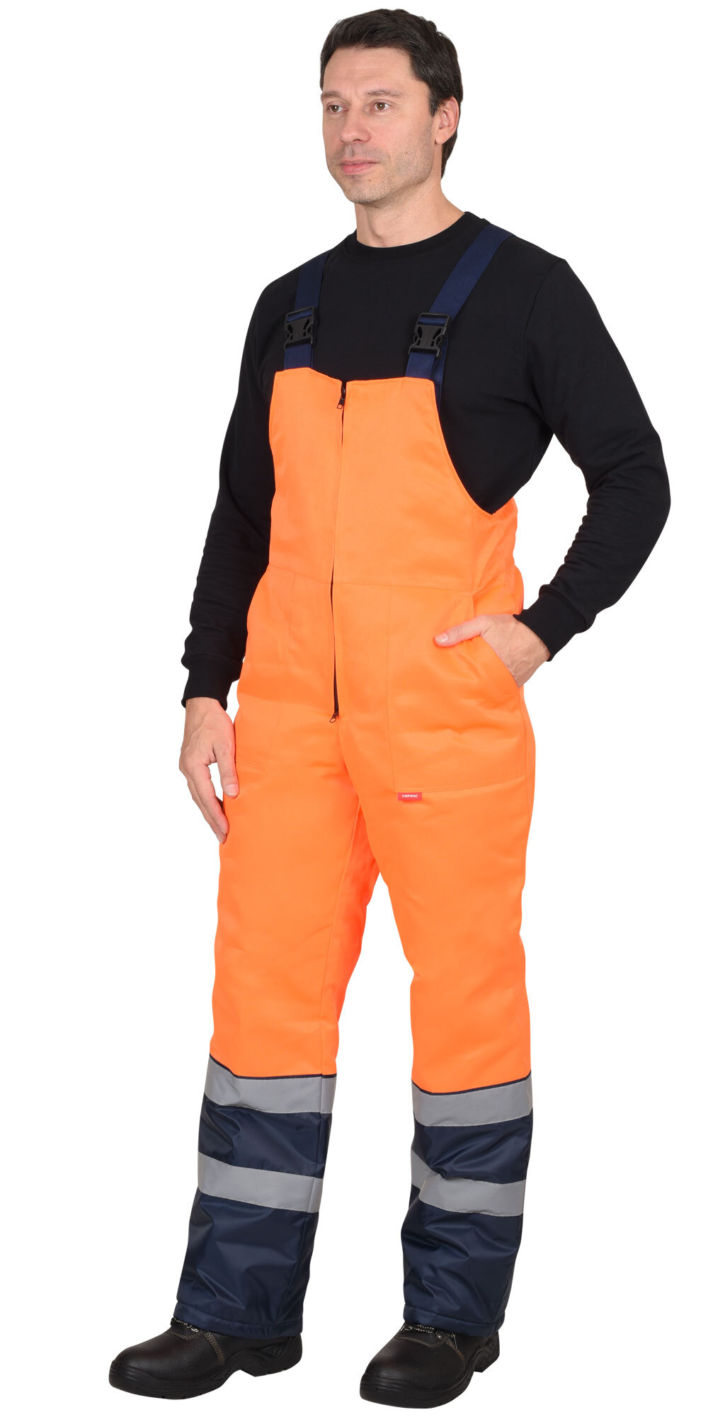 По полочкам, спинки в области груди, талии, низа и низа рукавов настрачивается СОП 50 мм для обозначения сигнальной видимости. Полукомбинезон прямой, с отрезной грудкой и спинкой, с центральной застёжкой на двухзамковую тесьму - «молния», с накладными боковыми карманами, с эластичной лентой по спинке, для лучшего прилегания. Бретели регулируются при помощи эластичной ленты и пряжек фастексов.