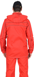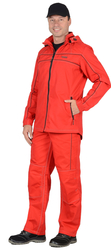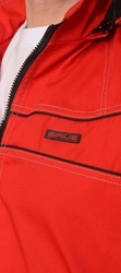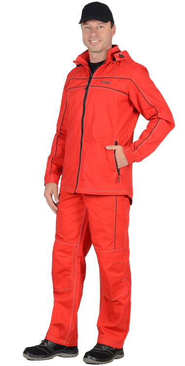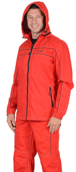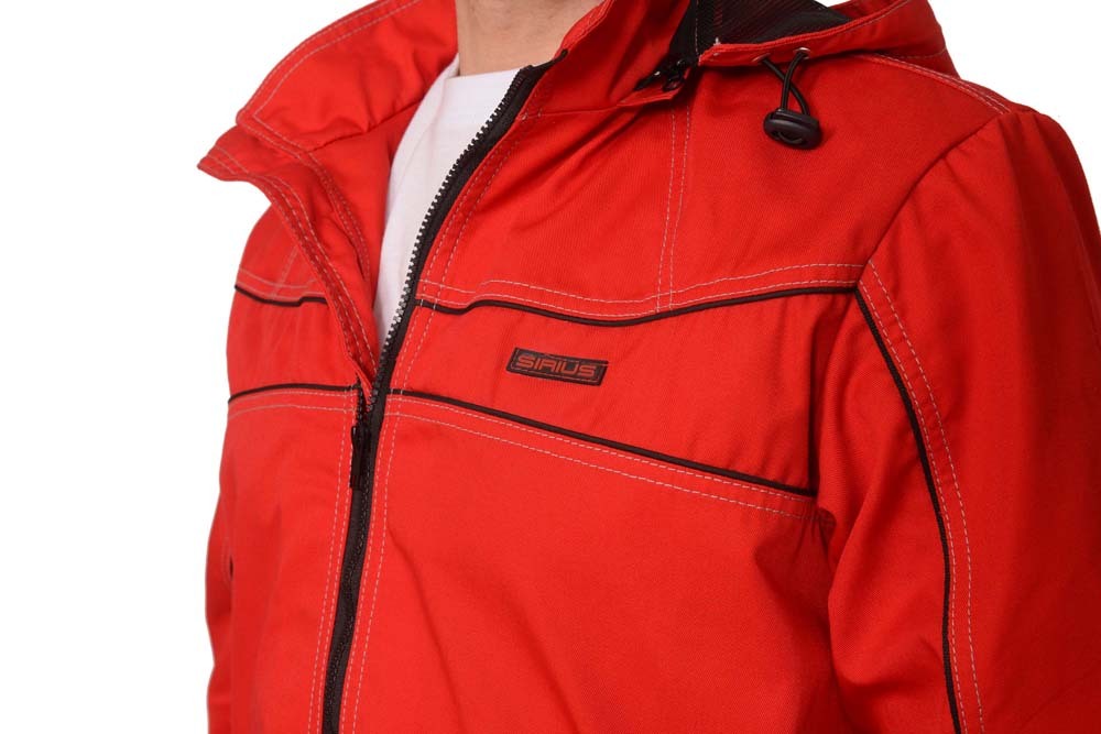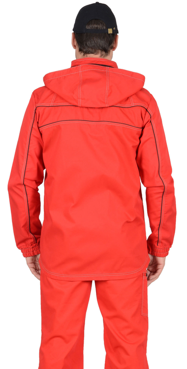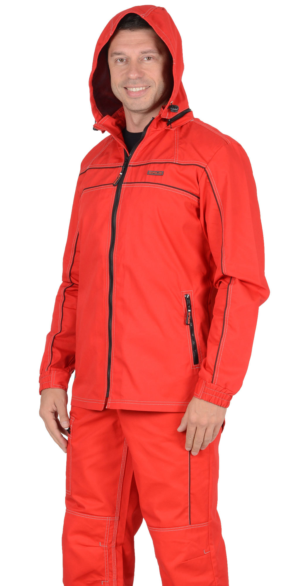 Куртка удлиненная, прямого силуэта, полочки и спинка на подкладке из материала сетка, с центральной бортовой застежкой на тракторную тесьму "молния", с внутренним укороченным ветрозащитным клапоном, с воротником стойка, с нижними прорезными карманами на "молнии". Рукава втачные с манжетами на резинке. Капюшон съемный на "молнии". Куртка отделана кантами контрастного черного цвета.