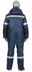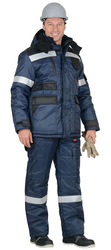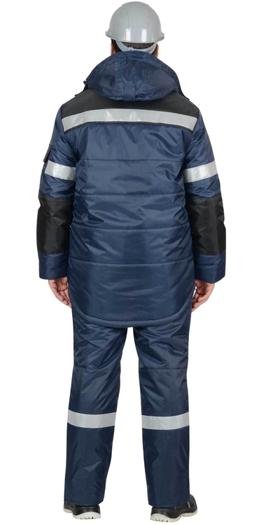 4 класс защиты по ГОСТ 12.4.303-2016, ТР ТС 019/2011Костюм зимний предназначен для особого климатического пояса 4 класса защиты, состоит из куртки и полукомбинезона. В костюме предусмотрены светоотражающие детали для обеспечения видимости работающего в тёмное время суток.Куртка на утеплённой подкладке, с дополнительной ветрозащитной прокладкой из ткани «ЛАКЕ», с воротником стойка, со съёмным капюшоном, с центральной застёжкой на молнию, которая закрыта ветрозащитным клапаном с липучками. Куртка с нагрудными карманами с клапанами и с нижними прорезными карманами с листочками. На подкладке с левой стороны накладной карман. Рукава куртки с налокотниками и с внутренними трикотажными манжетами, низ рукавов по ширине регулируется хлястиком на липучке. Внутренний воротник из флиса. Подкладка разрезная, верхняя часть из флиса. В области талии на подкладке кулиска с эластичным шнуром для регулирования объема.