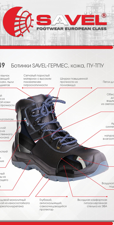 Обувь серии "SAVEL-ГЕРМЕС" предназначена для работы в нефтегазовой, горнодобывающей, энергетической, химической промышленности, на транспорте, в агропромышленном комплексе и сервисных службах.