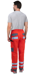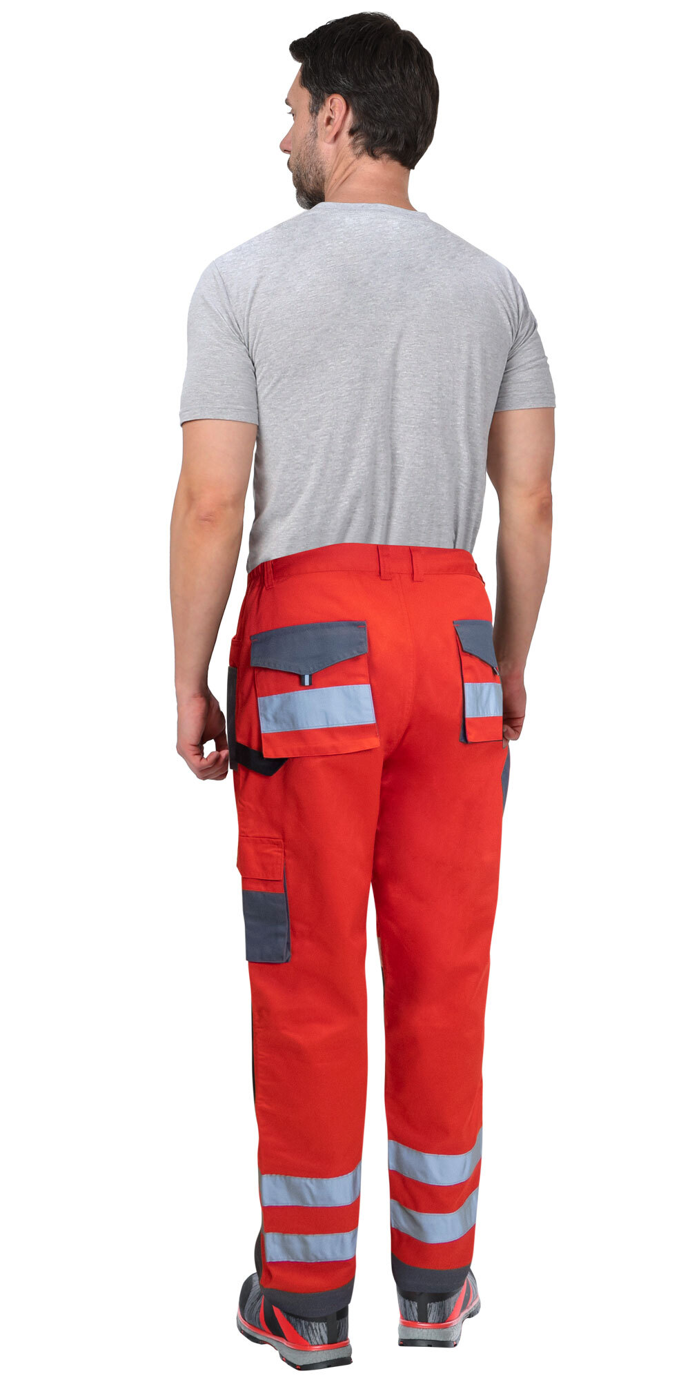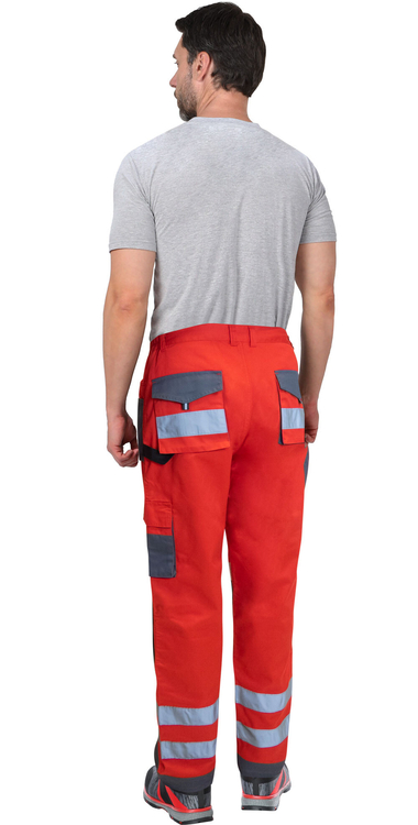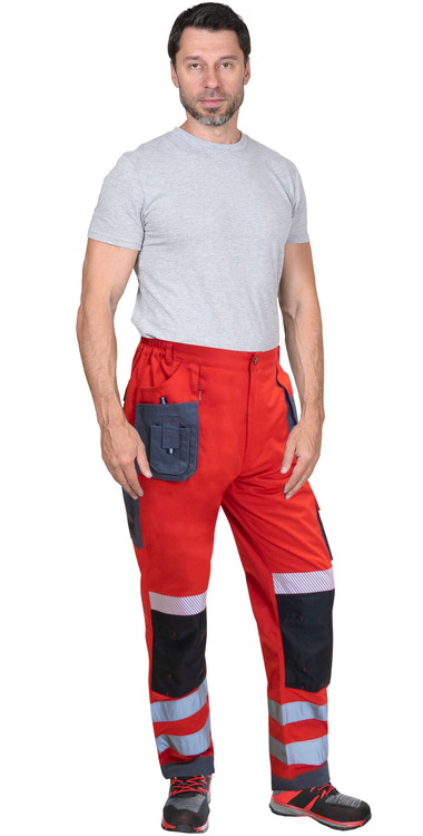 Брюки прямого кроя на поясе, с застёжкой гульфика на молнию, с накладными карманами спереди, сзади и на боковых швах. Брюки с усилительными накладками в области колен с нижним входом для амортизационного вкладыша.