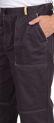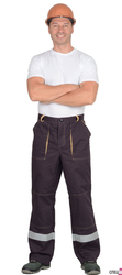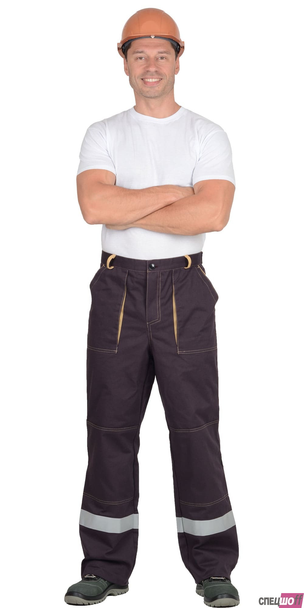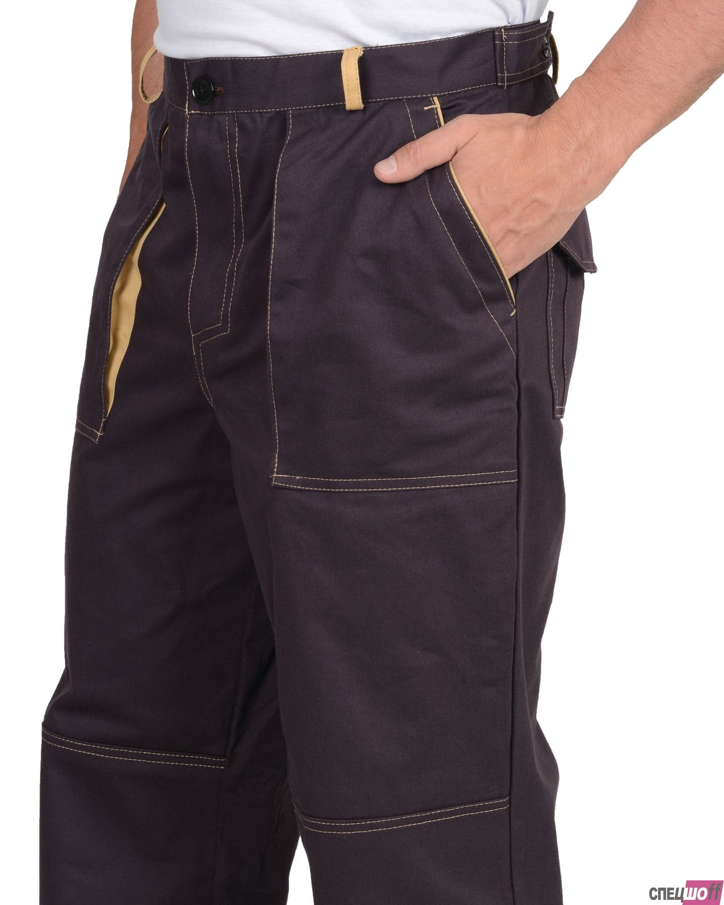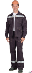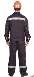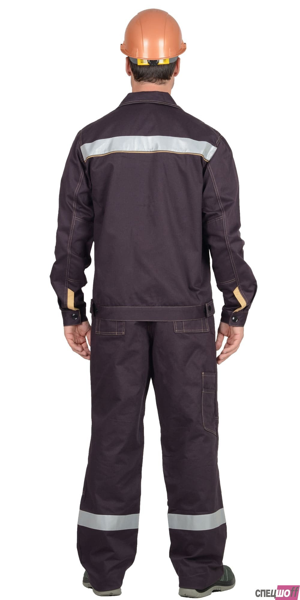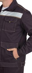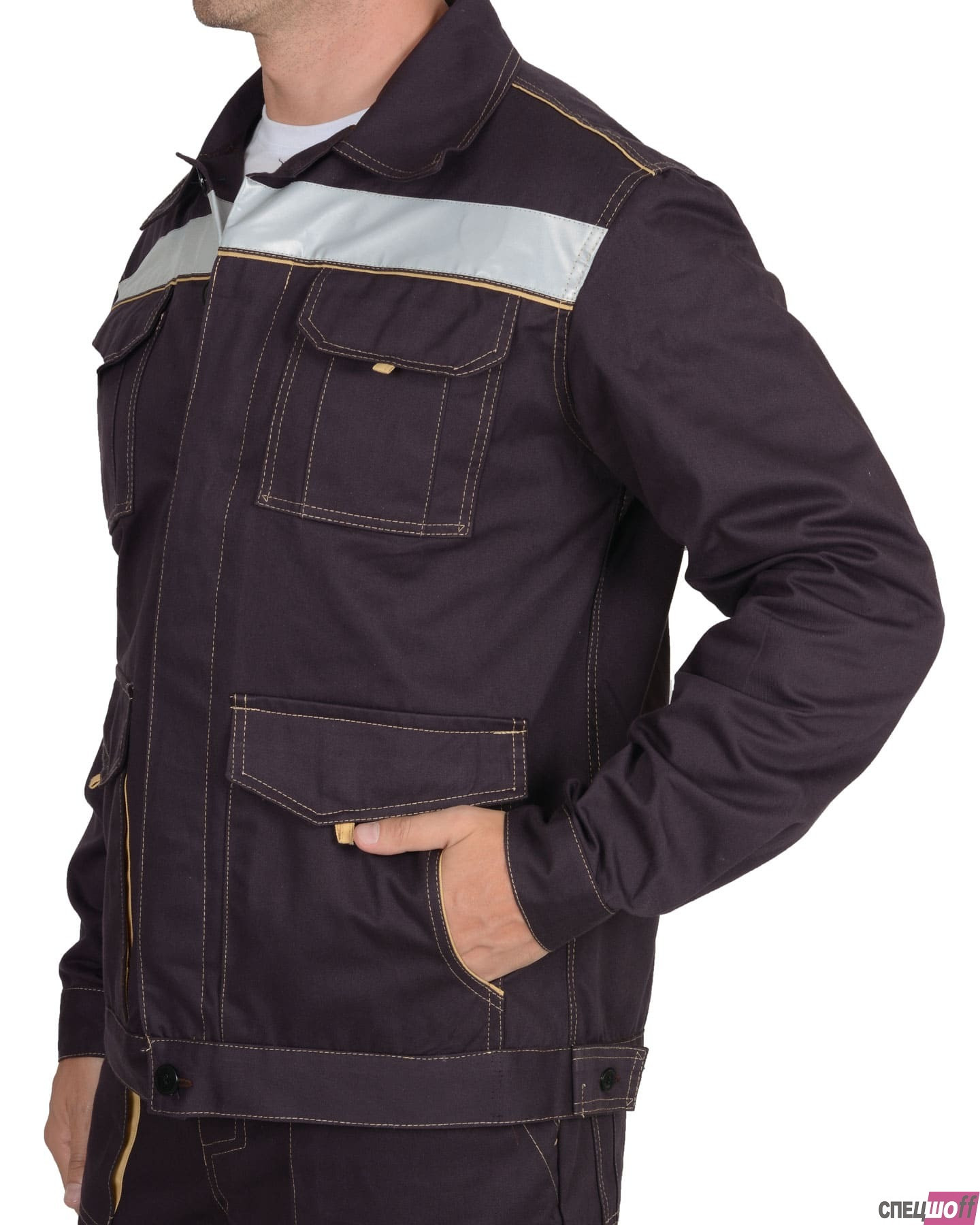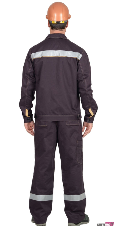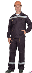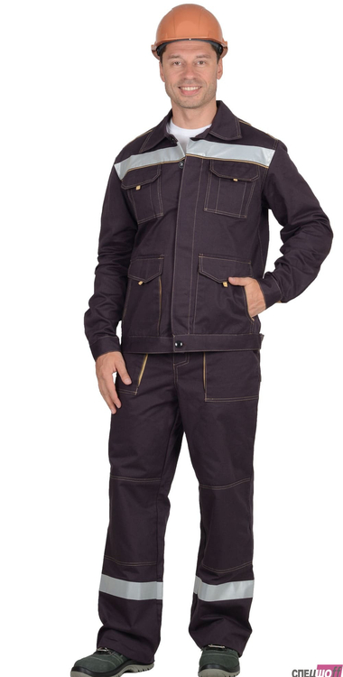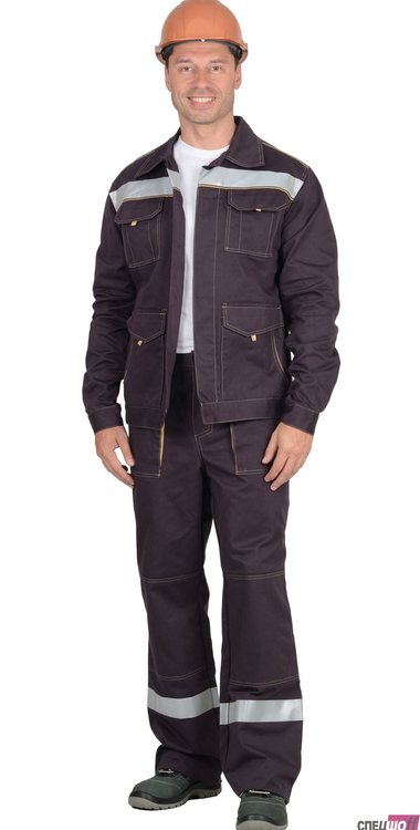 Куртка укороченная, с отложным воротником, с центральной потайной застежкой на пуговицы, пояс регулируется по ширине патами и пуговицами. Брюки с усилительными накладками в области колен. Костюм с контрастными строчками и СОП шириной 50 мм. ГОСТ 12.4.280-2014.