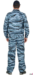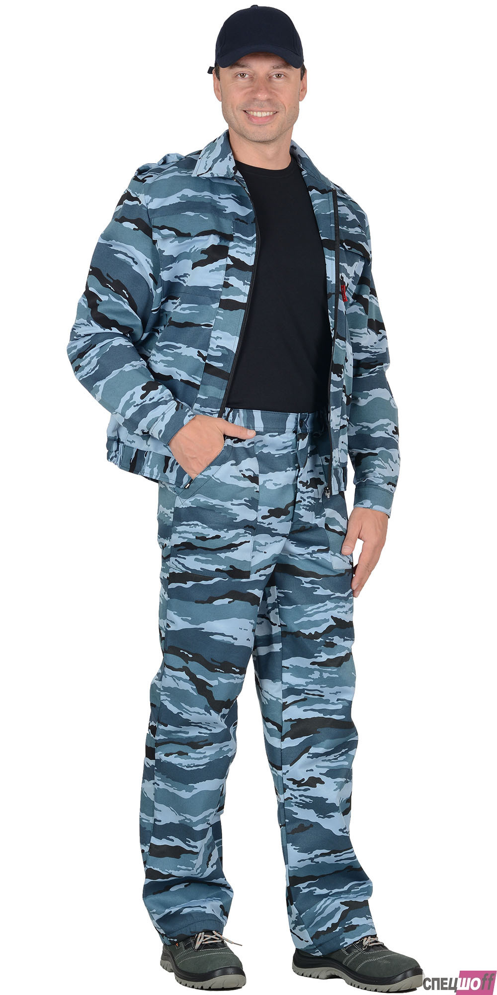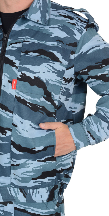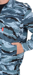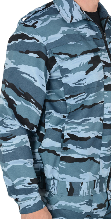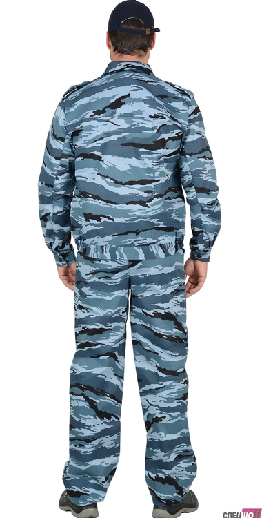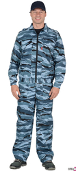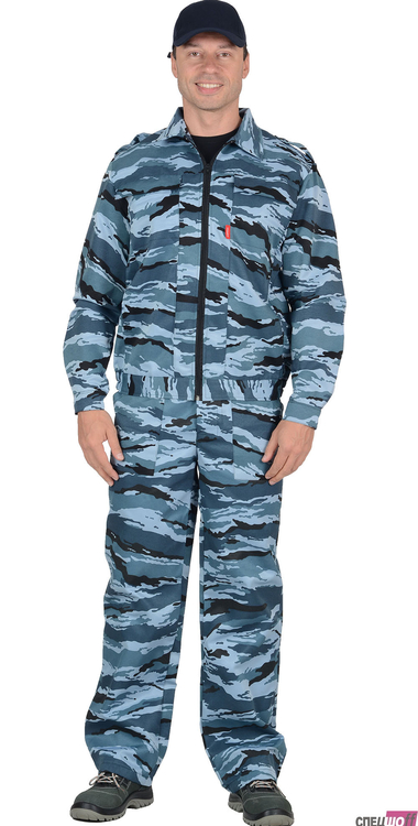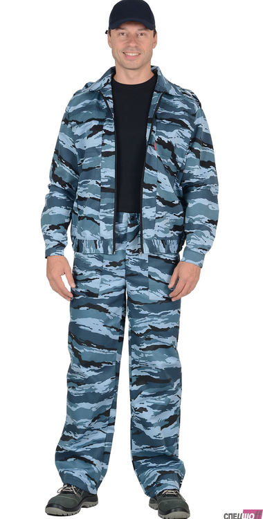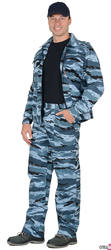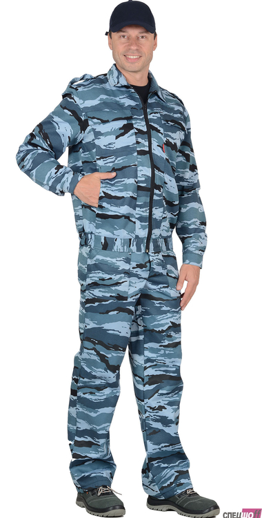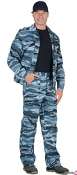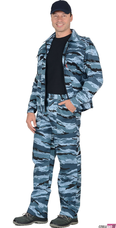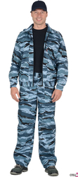 Куртка короткая, прямого силуэта, с отложным воротником, с центральной бортовой застежкой на молнию; с погонами по плечам на пуговицах, с притачным поясом, понизу частично стянутым резинкой; с нагрудными карманами, с боковыми карманами в вертикальных швах. Рукава, втачные, двухшовные с манжетами на пуговицах. Брюки с притачным поясом, застёгивающимся на 1 петлю и пуговицу; с 5 шлевками и резинкой ткацкой по боковым швам брюк; с застежкой гульфика на три петли и пуговицы; с двумя накладными боковыми карманами с наклонным входом. Ткань верха: смесовая с ВО пропиткой состав: 80% п/э, 20% х/б; пл. 220 г/м² ТУ 8550-001-81391241-2008