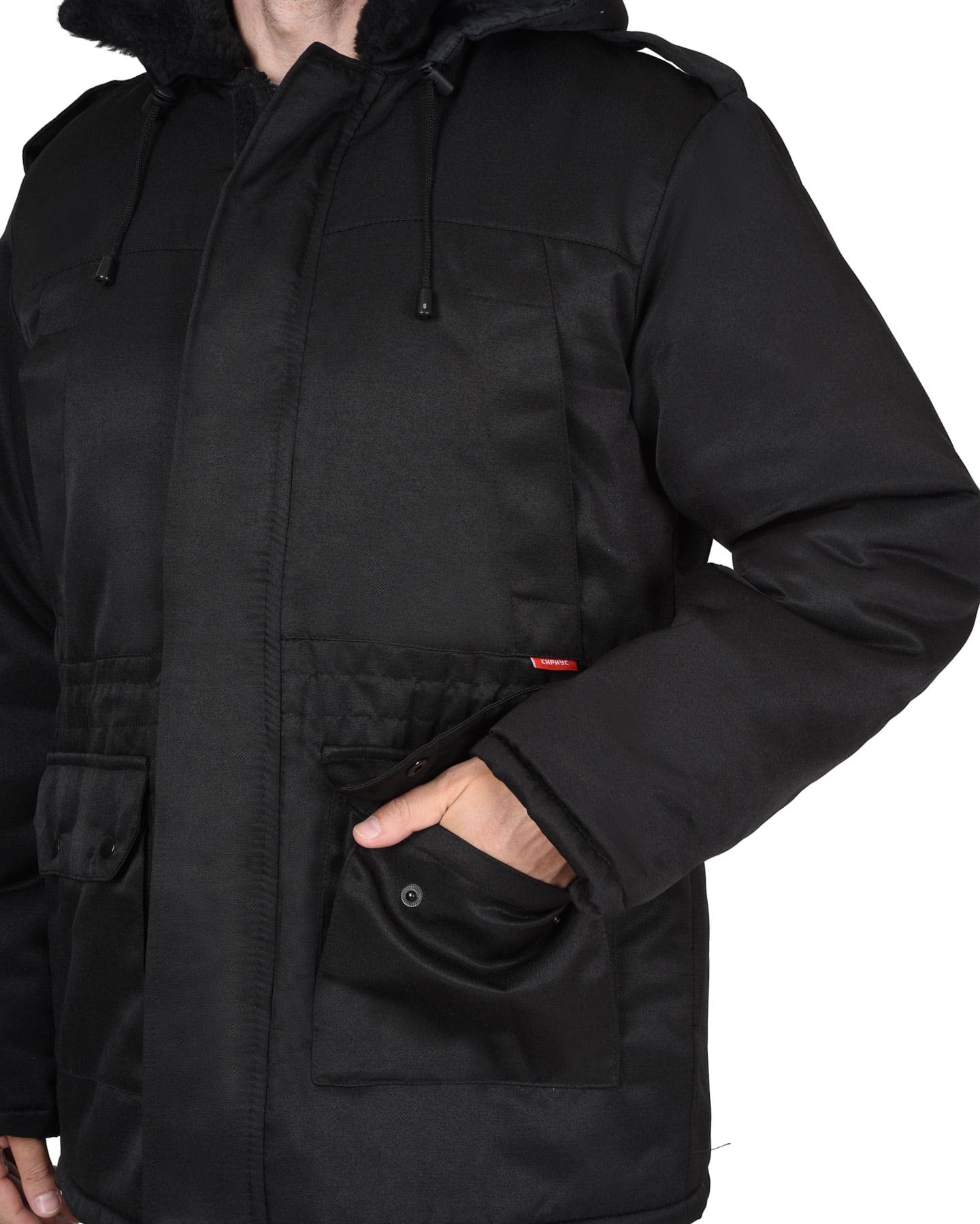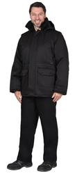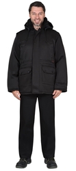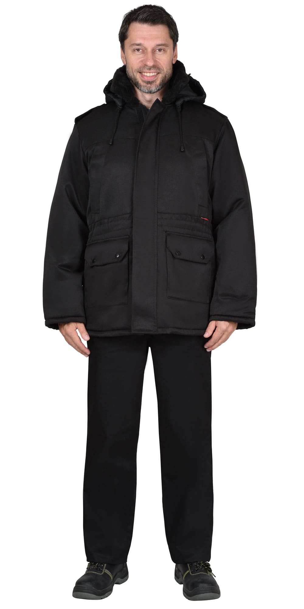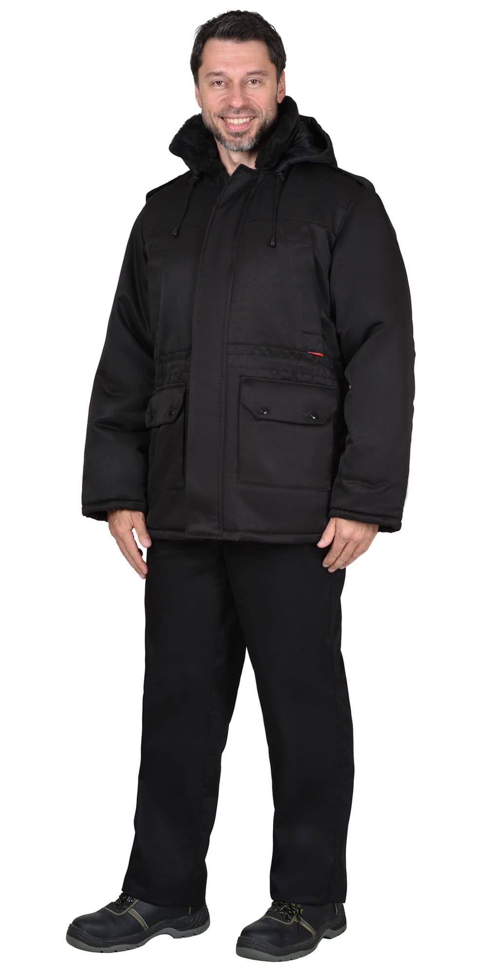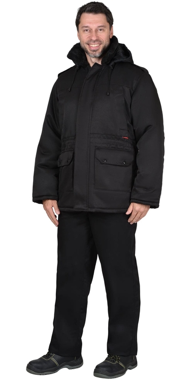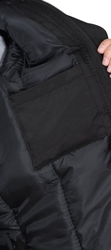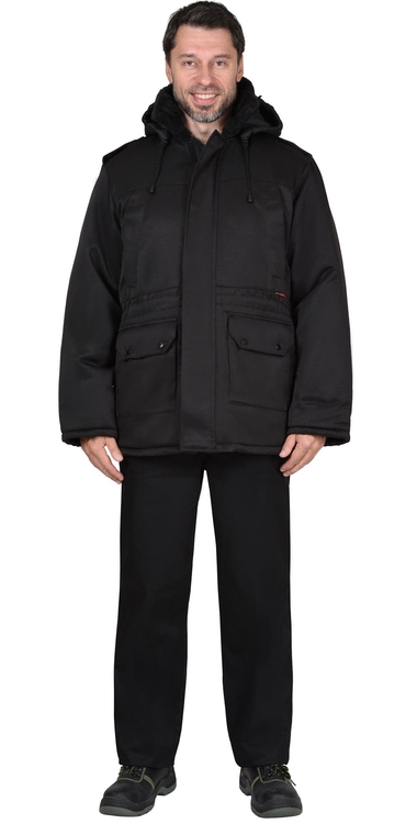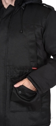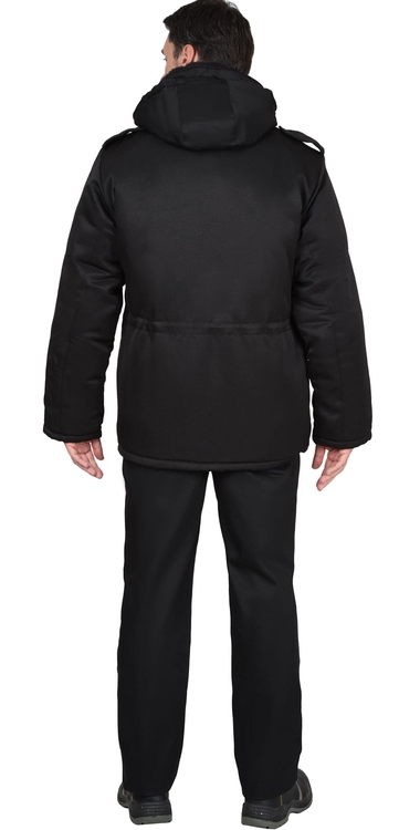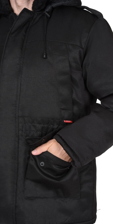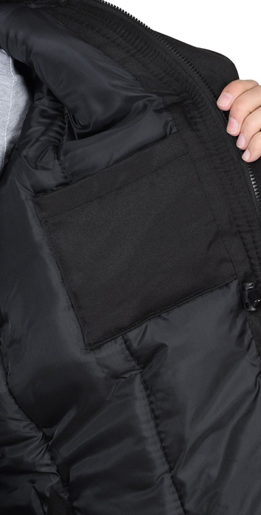 Куртка длинная утепленная прямого силуэта, с центральной застёжкой на тесьму - «молния» и внешним ветрозащитным клапаном на липучки. Изделие с отложным воротником, с пристёгивающимся капюшоном, верхними и нижними накладными карманами. Рукава втачные с внутренними трикотажными манжетами.