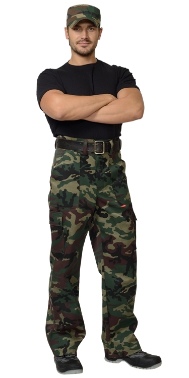Брюки прямые с застёжкой спереди на тесьму «молния»; с притачным широким поясом, застёгивающимся спереди на 2 петли и пуговицы; с 5-ю шлевками; с верхними боковыми накладными карманами с наклонным входом и нижними боковыми накладными карманами; с эластичной лентой в 2-ряда по боковым сторонам пояса брюк. Ткань: «Кроун Принт» смесовая с ВО пропиткой состав: 80% п/э, 20%х/б; пл.220 г/м2,ТУ 8550-001-81391241-2008.