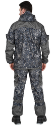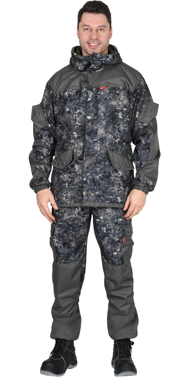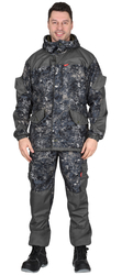Куртка удлиненная, прямого силуэта, с центральной супатной застежкой на петли и пуговицы, нижняя петля сквозная, с карманами листочка и фигурным клапанами на пуговице и с внутренним карманом. Рукава с полуобъемными накладными карманами и фигурными клапанами, которые застегиваются на потайную липучку, имеют притачную нижнюю деталь на резинке и налокотники. Капюшон с козырьком, двумя кулисами для регулировки, застежкой на 2 петли и пуговицы. В области талии резинка для частичной стяжки. Низ куртки регулируется шляпной резинкой. Брюки с центральной застежкой гульфика на три петли и пуговицы, пояс цельнокроеный с застежкой на одну петлю и пуговицу, с пятью узкими шлевками, с эластичной тесьмой по всей ширине цельнокроеного пояса, со съёмными бретелями, с карманами в боковых швах, с задними накладными карманами, застегивающимися на пуговицу, с накладными карманами с объёмом на боковых швах с фигурными клапанами застегивающиеся на пуговицу и наколенниками. По низу брюк пуфта с завязками. Ткань верха: "Полофлис", состав: 100 % п/э, пл. 280 г/м2. Ткань отделочная: "Дюспа", состав: 100 % п/э, пл. 90 г/м2.