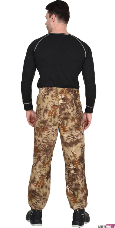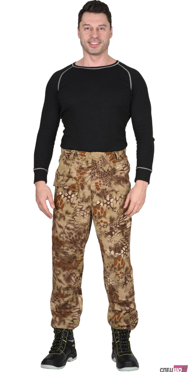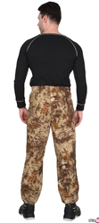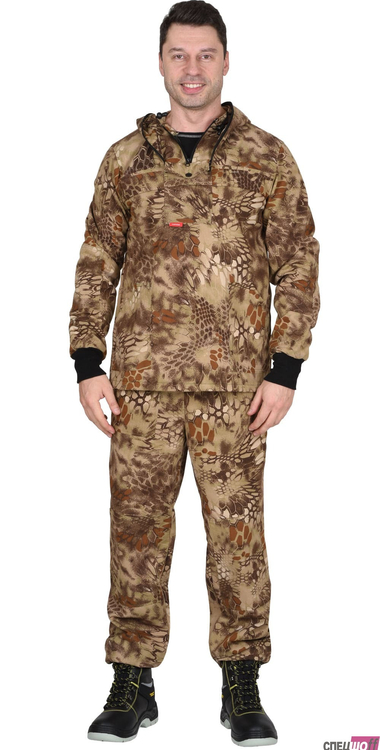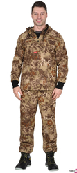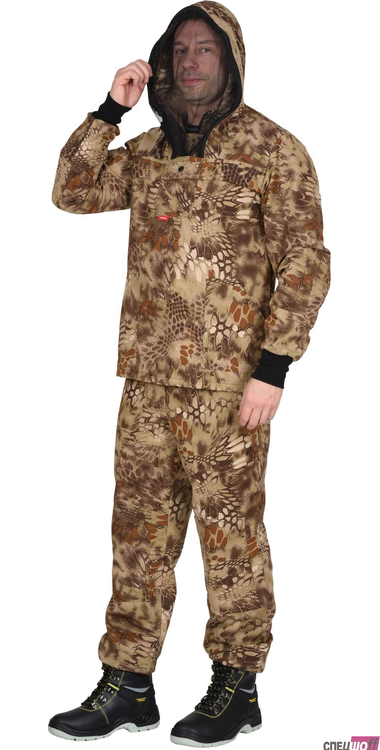 Куртка с притачным капюшоном с противомоскитной сеткой и накладным нагрудным карманом, в который при необходимости можно спрятать противомоскитную сетку. Рукава с трикотажной манжетой, ширина куртки внизу регулируется.Брюки с цельнокроеным поясом, стянутым эластичной лентой, с 4-мя шлёвками, с наколенниками, с накладным карманом с клапаном, застёгивающимся на ленту "контакт", низ брюк с трикотажными манжетами.