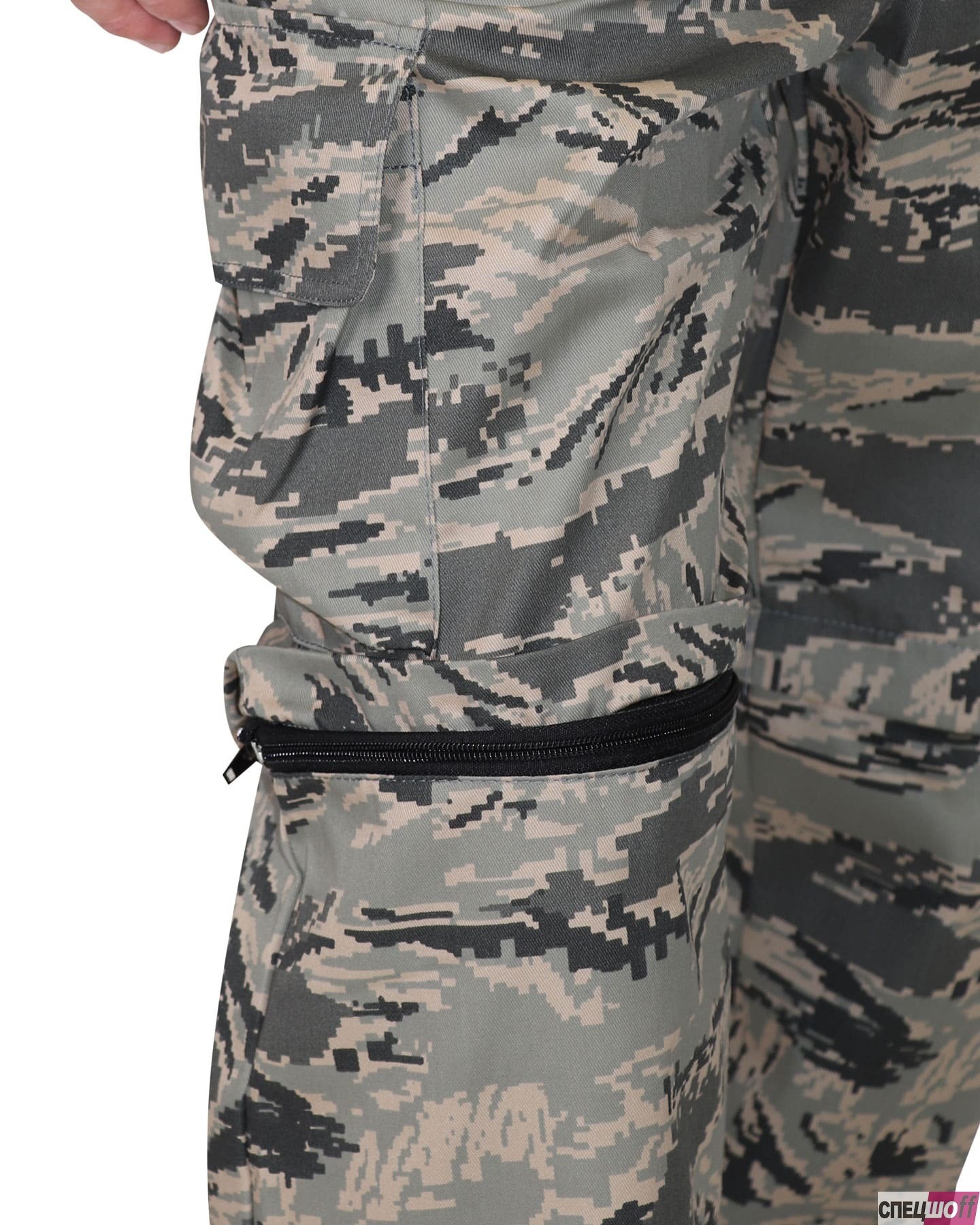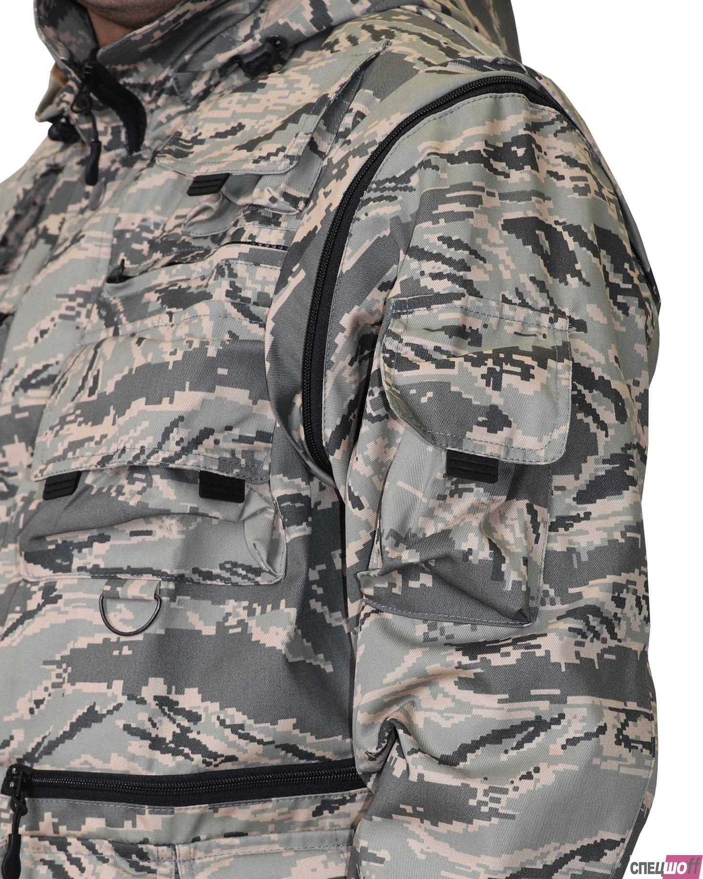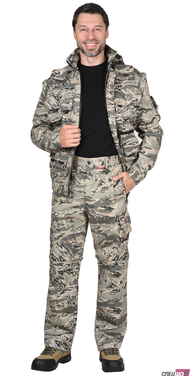 Костюм "Тигр" состоит из куртки и брюк. Куртка короткая прямого силуэта, с центральной застёжкой на молнию, накрытую ветрозащитным клапаном на кнопки. Изделие с воротником стойка и со съёмным капюшоном, с различными многофункциональными карманами с молнией и с клапанами на «липучках». Рукава съёмные, пристёгиваются на молнию, манжеты рукавов с патой регулирующие ширину при помощи липучки. Низ куртки с притачным поясом частично стянутым, резинкой. Брюки прямые с застёжкой гульфика на тесьму «молния», с различными многофункциональными карманами, с притачным поясом частично стянутым резинкой и застёгивающимся на пуговицу, пояс с 5-ю шлёвками. Низ брюк отстёгивается для трансформации брюк в шорты.