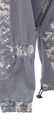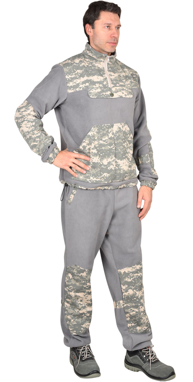 Куртка прямого силуэта; удлиненная; с центральной застежкой в верхней части куртки; с воротником - «стойка»; с кокеткой переда; с внутренним нагрудным карманом по центру полочки с клапаном, с одним нижним накладным фигурным карманом с вертикальным делением по центру на два кармана. Рукава цельнокроеные с фигурными настрочными налокотниками; по низу рукава от рукавно-бокового шва по передней части рукава до налокотника стяжка на ткацкую резинку, По низу куртки притачной пояс со сгибом, с разрезами по боковым швам и вставленной шляпной резинкой с фиксаторами по бокам. Брюки прямого покроя; с притачным поясом, с прорезными боковыми карманами с притачными манжетами (из отделочной ткани) по низу брюк со стяжкой на резинку ткацкую и проложенной посередине отделочной строчкой. Брюки со съемным поясом из помочной резинки с закрепленной на концах застежкой-фастекс.Ткань верха: «Флис» состав: 100% п/э, пл. 280 г/м2. Цвет: серый. Ткань отделочная: : «Рип-Стоп», состав: 80% п/э 20% х/б. Детали отделки: кокетки полочек и спинки, внешний воротник, клапан нагрудного кармана куртки, нижний накладной карман, налокотники, притачной пояс куртки, наколенники брюк, манжеты куртки, манжеты брюк, «листочки» прорезных карманов брюк, кулиски для стяжки низа рукавов, кулиски для стяжки низа задних половинок брюк, лея брюк на задних половинках, пояс брюк, шлевки брюк. ГОСТ 25295-2003