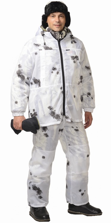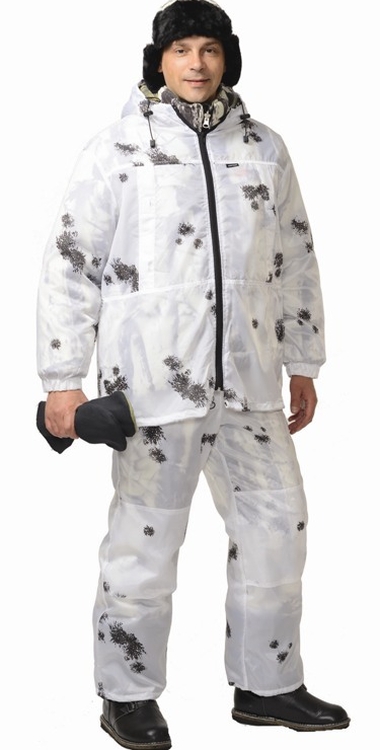 Тк. 100% п/э. Куртка с центральной застёжкой на "молнию", притачным капюшоном, низ рукавов стянут резинкой, низ куртки по ширине регулируется эластичным шнуром и фиксаторами.Брюки с притачным поясом стянутым резинкой, с боковыми прорезными карманами на "молнии", с наколенниками, низ брюк стягивается эластичным шнуром и фиксаторами.Внешний маскиров. костюм. ТУ 8550-001-81391241-2008.