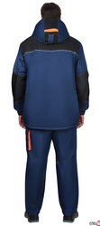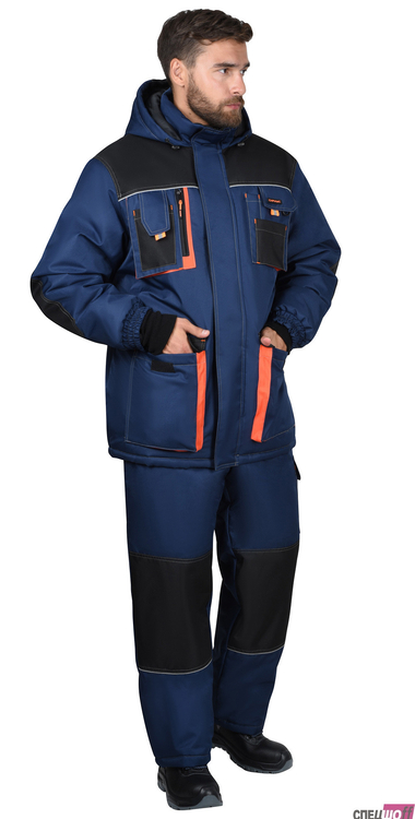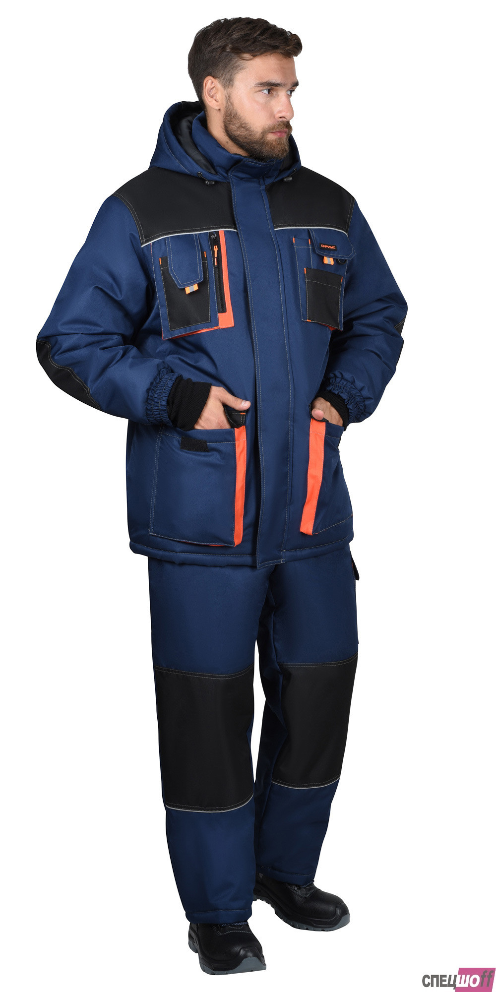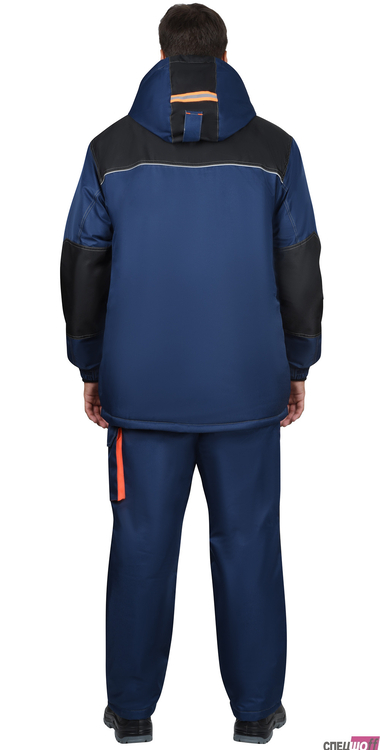 Куртка прямого силуэта, удлинённая, на утеплённой подкладке, с втачным воротником стойка и втачным капюшоном, центральной застёжкой на молнию и внешним ветрозащитным клапаном с липучкой от края воротника, втачными рукавами с отрезной манжетой частично стянутой резинкой и внутренней трикотажной манжетой. Внутренний воротник и подкладка куртки из полиэфирного трикотажного полотна - Флис. Подкладка куртки с ветрозащитной юбкой. Куртка с верхними и нижними накладными карманами, внутренним карманом с молнией на подкладке и карманом с молнией под ветрозащитным клапаном на левой половинке для документов размером А-4. Размер капюшона предусматривает возможность надевания его на каску. В куртке предусмотрено крепление бейджа.
