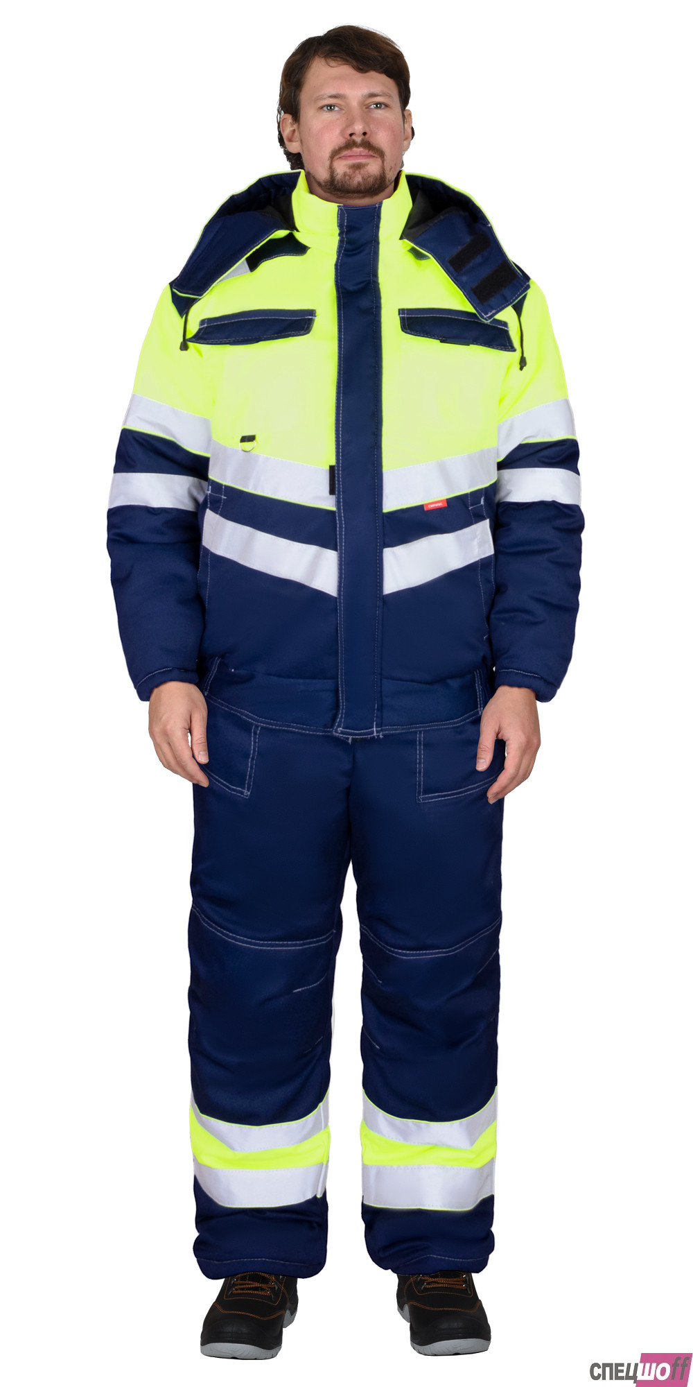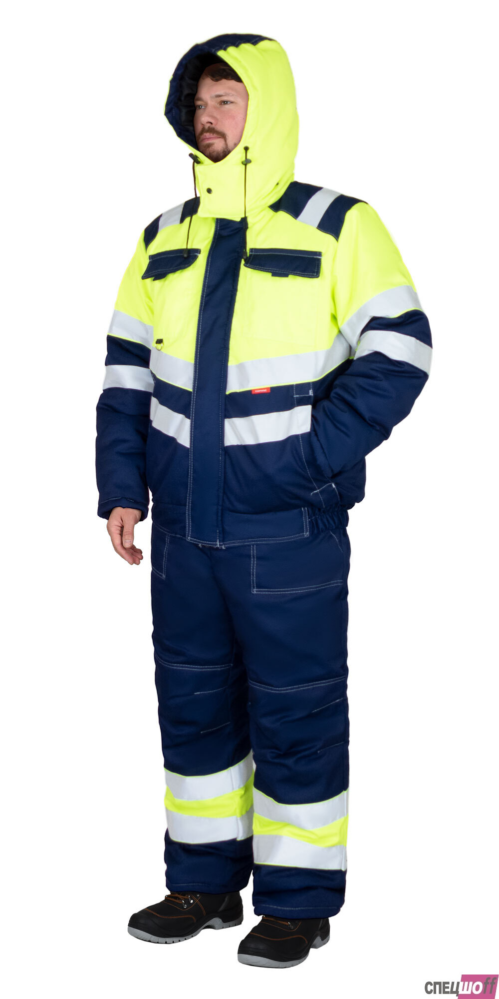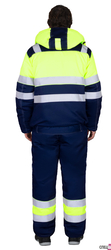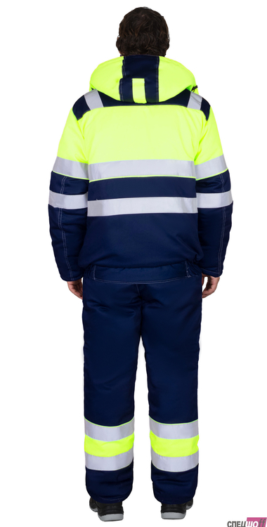 Куртка прямого силуэта, укороченная, на утеплённой подкладке, с воротником стойка, с отрезным поясом по низу куртки частично стянутым резинкой, с застёжкой на молнию, накрытую внешним ветрозащитным клапаном, застёгивающимся на липучку, с втачными рукавами с внутренней трикотажной манжетой, с верхними, нижними накладными карманами, и карманом на подкладке с липучкой. Куртка со съёмным капюшоном на молнии. В куртке предусмотрена лента светоотражающая ш.50 мм для обеспечения сигнальной видимости при любом освещении и крепление для бейджа.