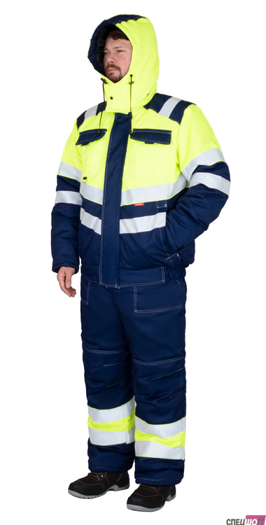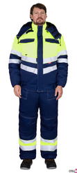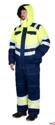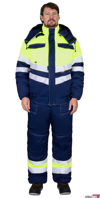 Полукомбинезон прямой, с утеплённой подкладкой, с регулируемыми по длине бретелями, с центральной застёжкой на 2-х замковую молнию, с двумя нагрудными карманами и боковыми карманами спереди, с резинкой по линии талии спинки для лучшего прилегания. Для обозначения сигнальной видимости в полукомбинезоне предусмотрена светоотражающая полоса на вставке контрастного цвета.