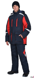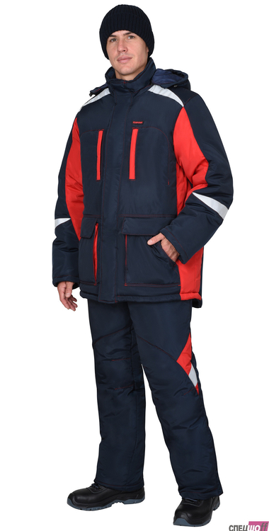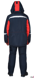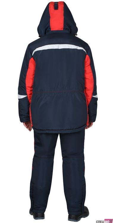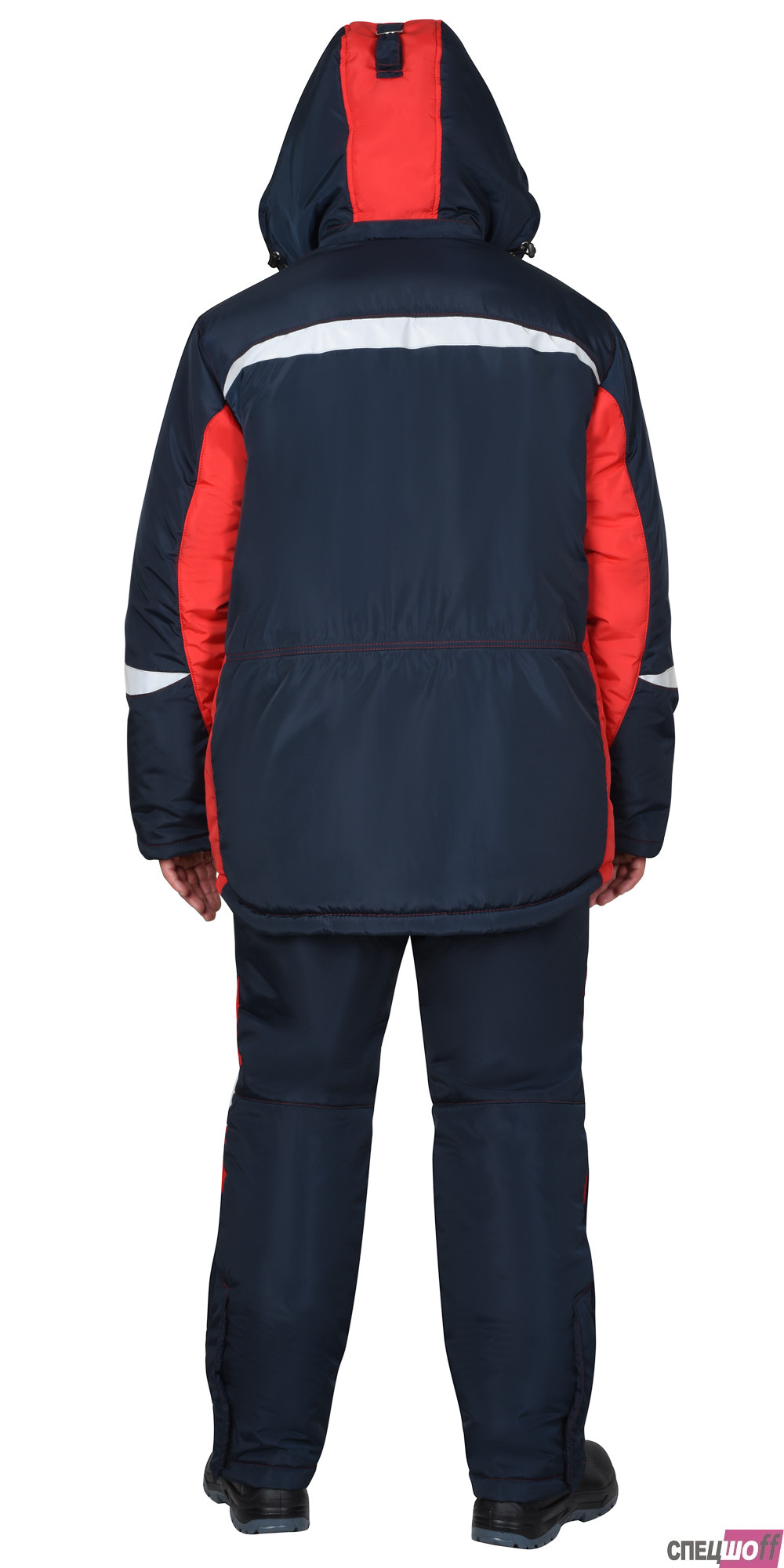 Куртка с верхними прорезными и нижними двойными накладными карманами с клапанами на липучке, с втачными рукавами, с внутренним карманом, застегивающимся на молнию и малым объемным карманом и кулисой по линии талии подкладки. Боковые детали полочки и спинки, передние и локтевые части рукава, листочка кармана, нижние большие карманы, средняя часть капюшона из отделочной ткани красного цвета.