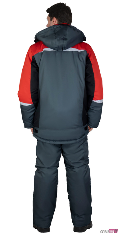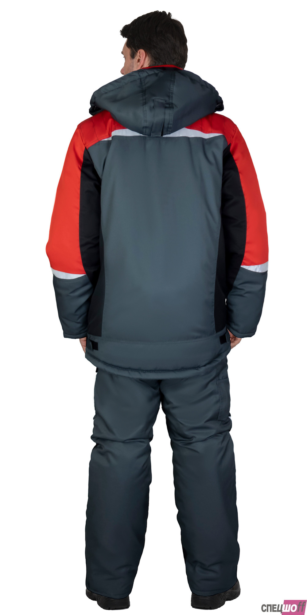 Куртка удлинённая, утеплённая, с дополнительной ветрозащитной прокладкой для защиты от ветра. Куртка с застёжкой на молнию под ветрозащитным клапаном с липучкой, с воротником стойка, со съёмным утеплённым капюшоном, с нагрудными накладными карманами с клапанами с липучкой и нижними прорезными карманами с молнией. Рукава втачные с внутренними трикотажными манжетами, ширина по низу рукавов регулируется хлястиками с липучкой. Объём по низу куртки регулируется хлястиками с липучкой. Подкладка куртки с внутренним карманом. В куртке предусмотрено крепление бейджа.