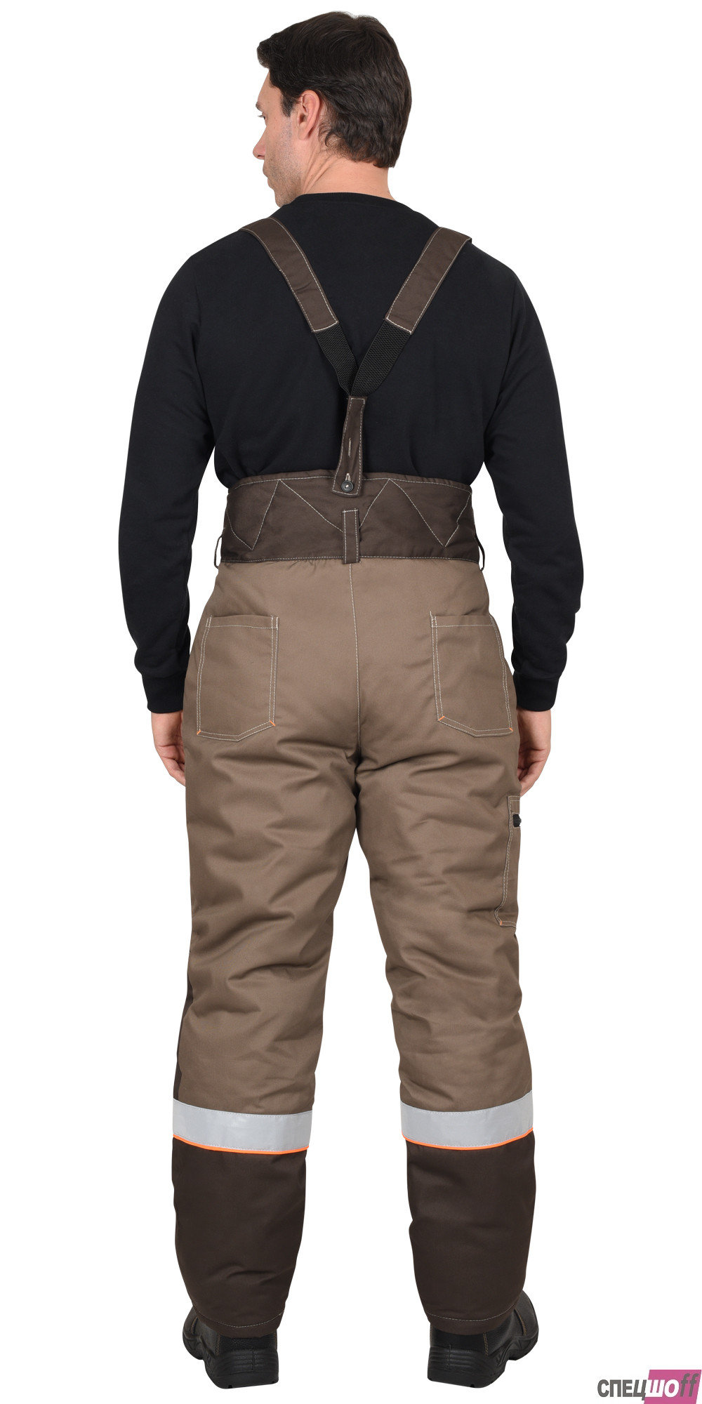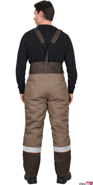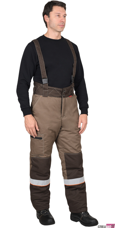 Брюки прямые, с притачной утеплённой подкладкой, центральной застежкой гульфика на молнию, широким фигурным поясом, с застежкой на пуговицы, с узкими шлевками на задних половинках и шлёвками-держателями фастексов на передних половинках, внутренними боковыми карманами с наклонным входом, накладным карманом на правом боковом шве, с застежкой на молнию, накладными задними карманами, наколенниками на передних половинках, со съемными бретелями.