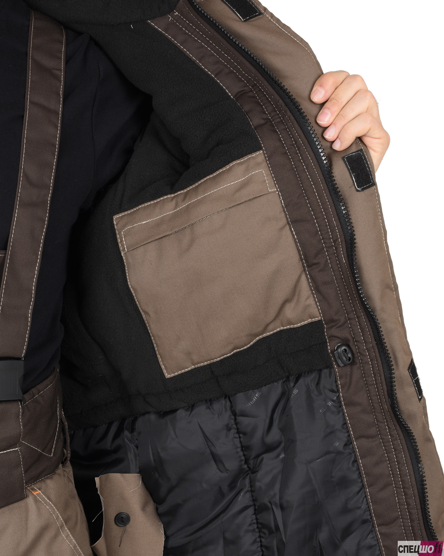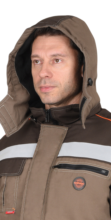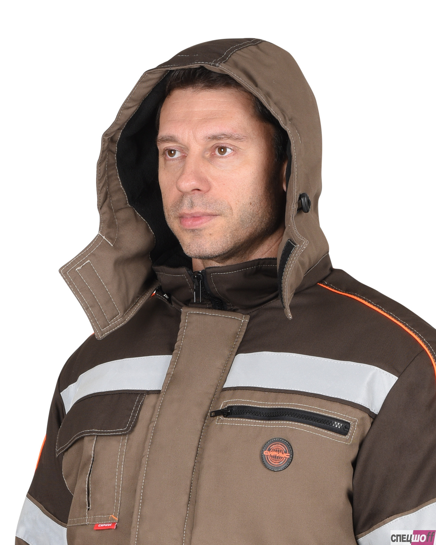 Куртка прямого силуэта, удлиненная, с притачной утепленной подкладкой, ветрозащитной прокладкой, центральной застежкой на молнию до верха, внешней ветрозащитным клапаном, застегивается на потайные липучки, воротником стойка, с различными функциональными карманами. Рукава втачные с отрезной манжетой, с частичной стяжкой на резинку. Куртка со съёмным капюшоном, с возможностью надевания на каску. В куртке предусмотрено крепление бейджа.