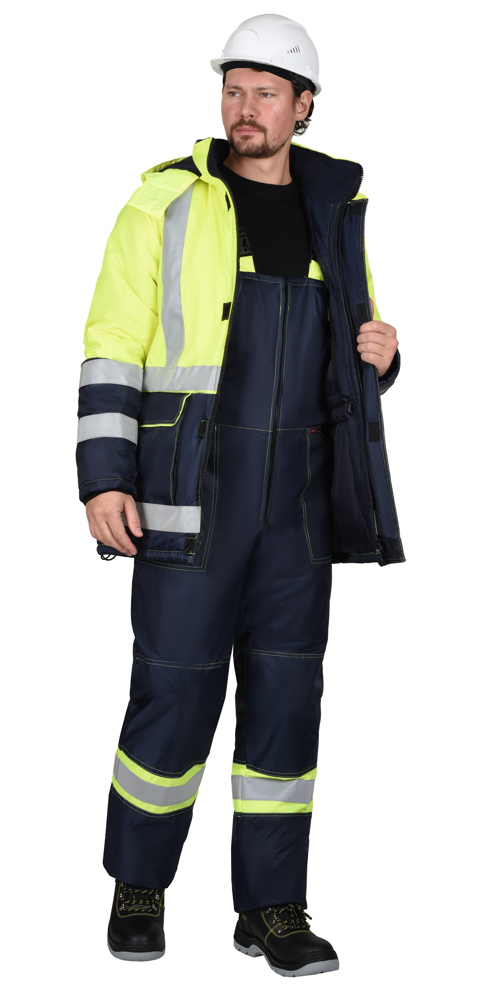 Куртка прямого силуэта; с притачной утепл.нной подкладкой, с центральной заст.жкой на двухзамковую т.сьму - «молнию» и ветрозащитным клапаном застегивающийся на липучку, воротником – стойка, верхним и нижними накладными карманами с клапанами на текстильную застежку - «липучку». С кулисой по линии талии, с внутренним карманом на «молнии». По кокеткам полочек, спинке в области талии и рукавов настрачивается СОП ш.50мм для обозначения сигнальной видимости.Полукомбинезон прямой, с центральной заст.жкой на двухзамковую тесьму - «молния», с накладными боковыми карманами, с наколенниками, с эластичной лентой по спинке, для лучшего прилегания. Бретели регулируются при помощи эластичной ленты и пряжек фастексов.По низу полукомбинезона настрачивается СОП ш.50мм для обозначения сигнальной видимости.