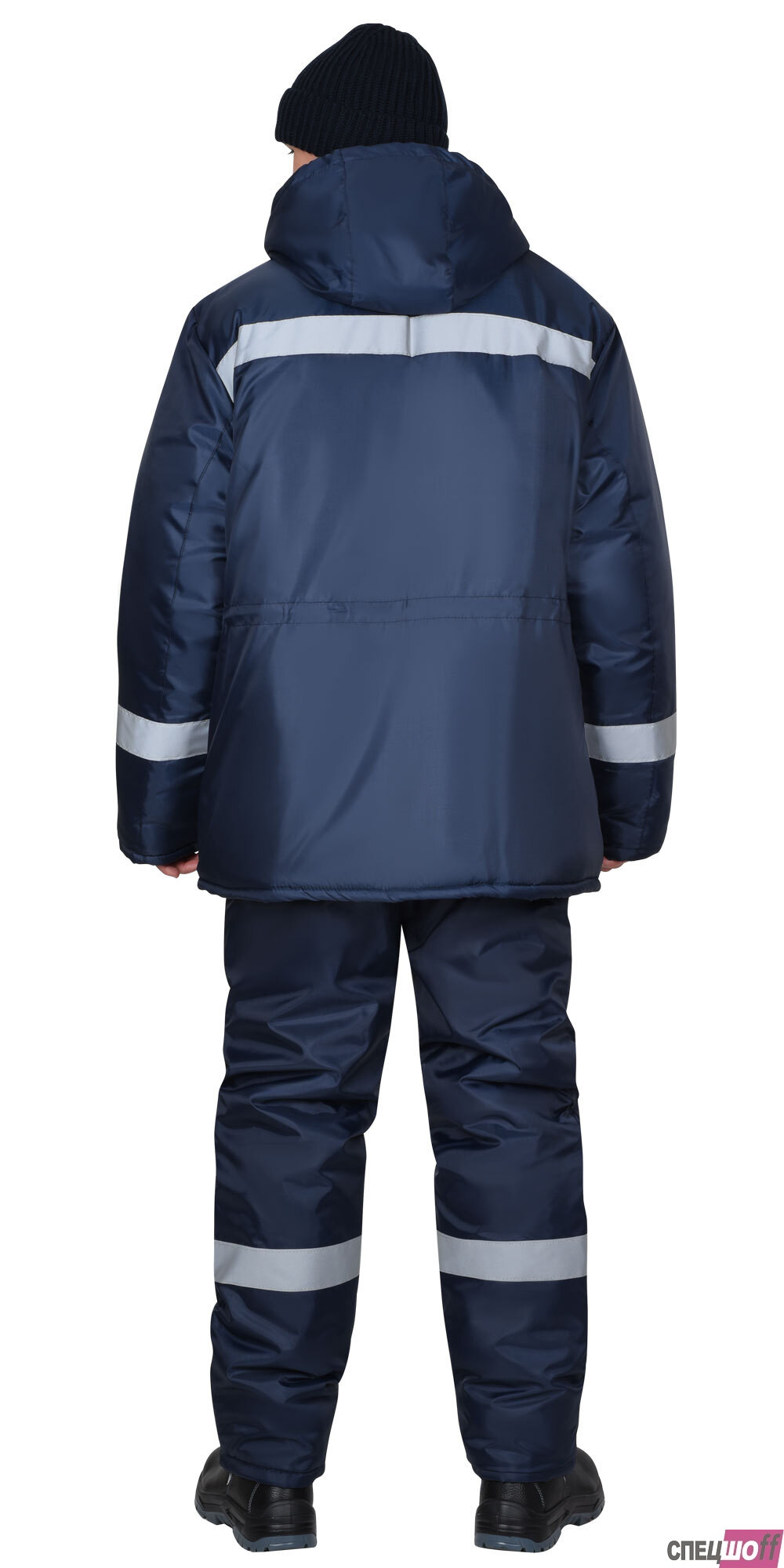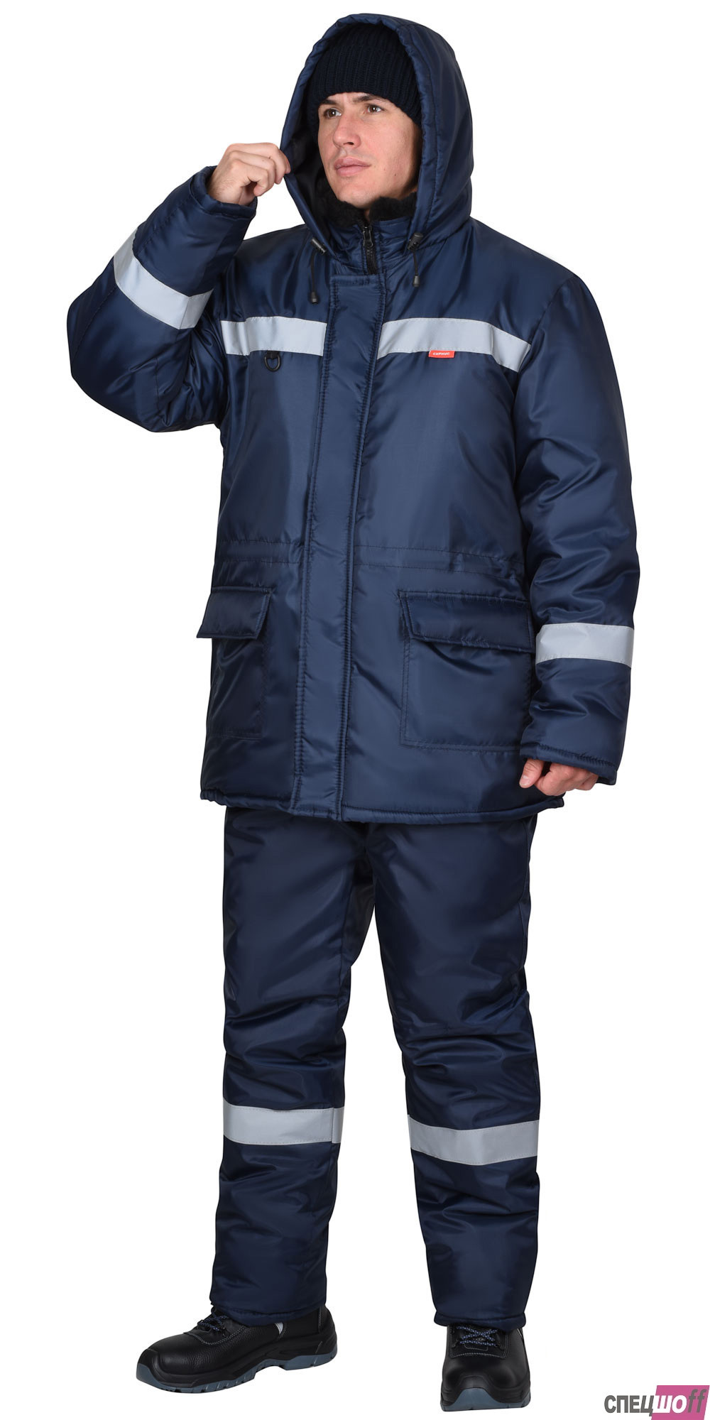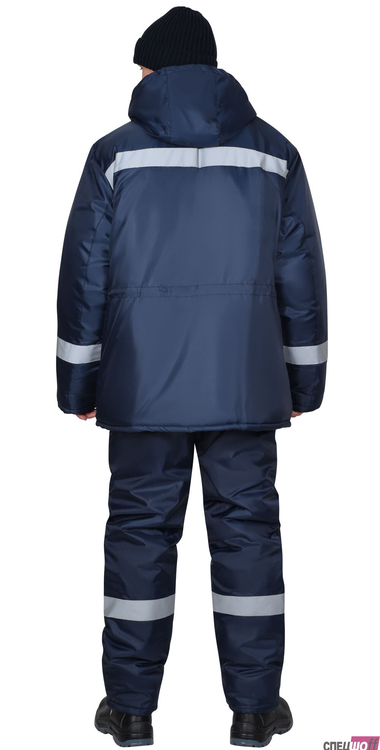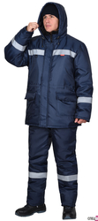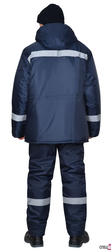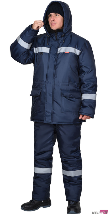 Куртка удлинённая, на утеплённой подкладке, с меховым воротником стойка, с центральной застёжкой на молнию под ветрозащитным клапаном с липучками, с втачным капюшоном. Куртка с нижними накладными карманами с клапанами и с внутренним карманом на подкладке. По талии куртки кулиска для регулирования объема. В куртке предусмотрено крепление бейджа и светоотражающая полоса 50 мм для обозначения видимости в любое время суток.