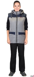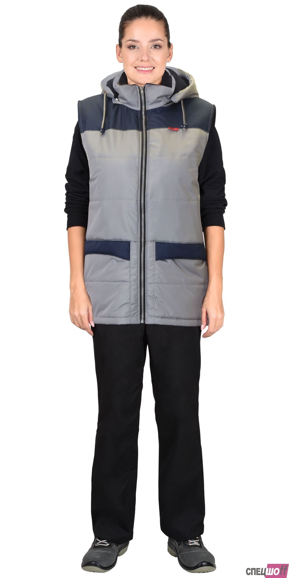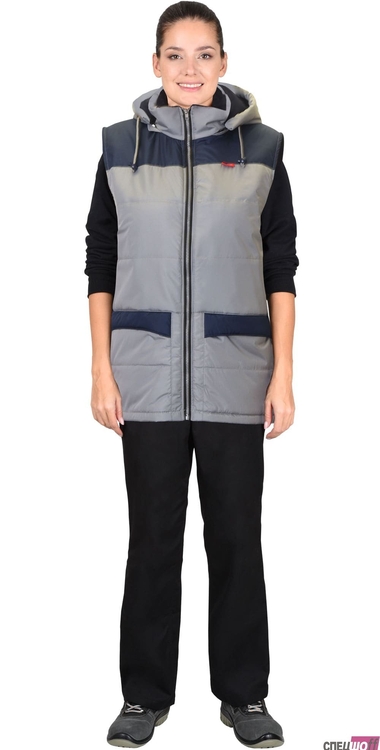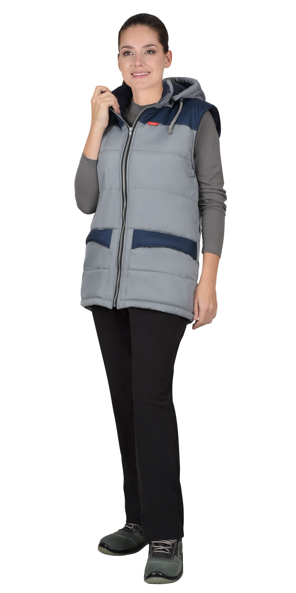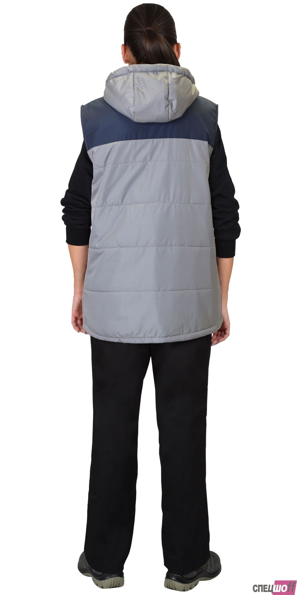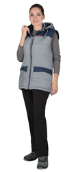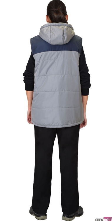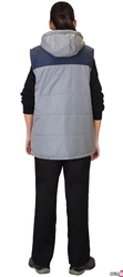Жилет утепленный; прямого силуэта, с воротником стойка, с центральной застежкой на тесьму «молния» до верха, с пристегиваемым капюшоном; полочка с двумя нижними карманами с декоративными клапанами, все детали жилета простеганы; с внутренней стороны на левой полочке расположен внутренний накладной карман на молнии; спинка удлиненная. ГОСТ 25295-2003