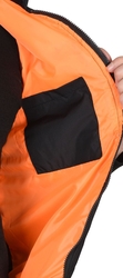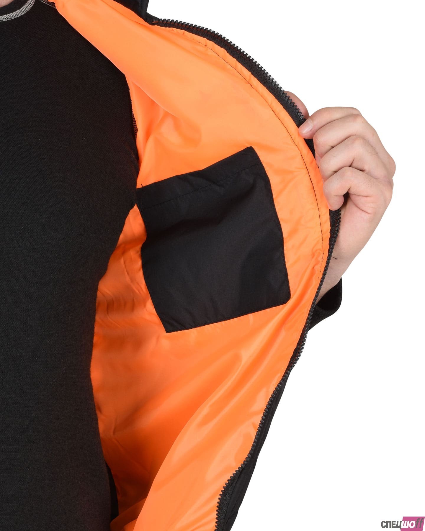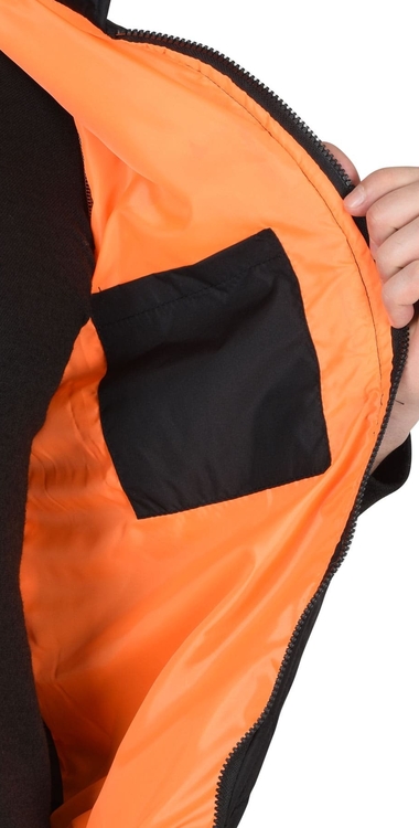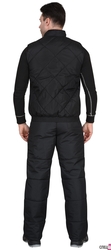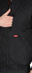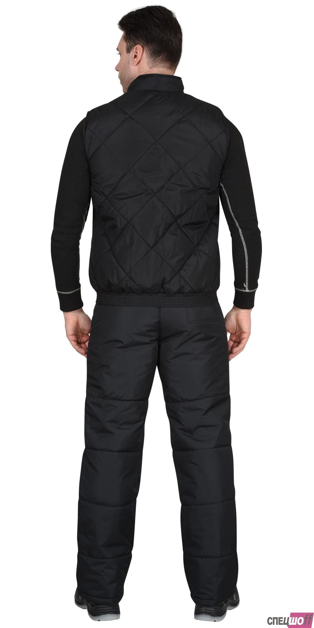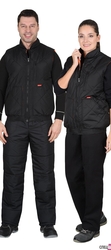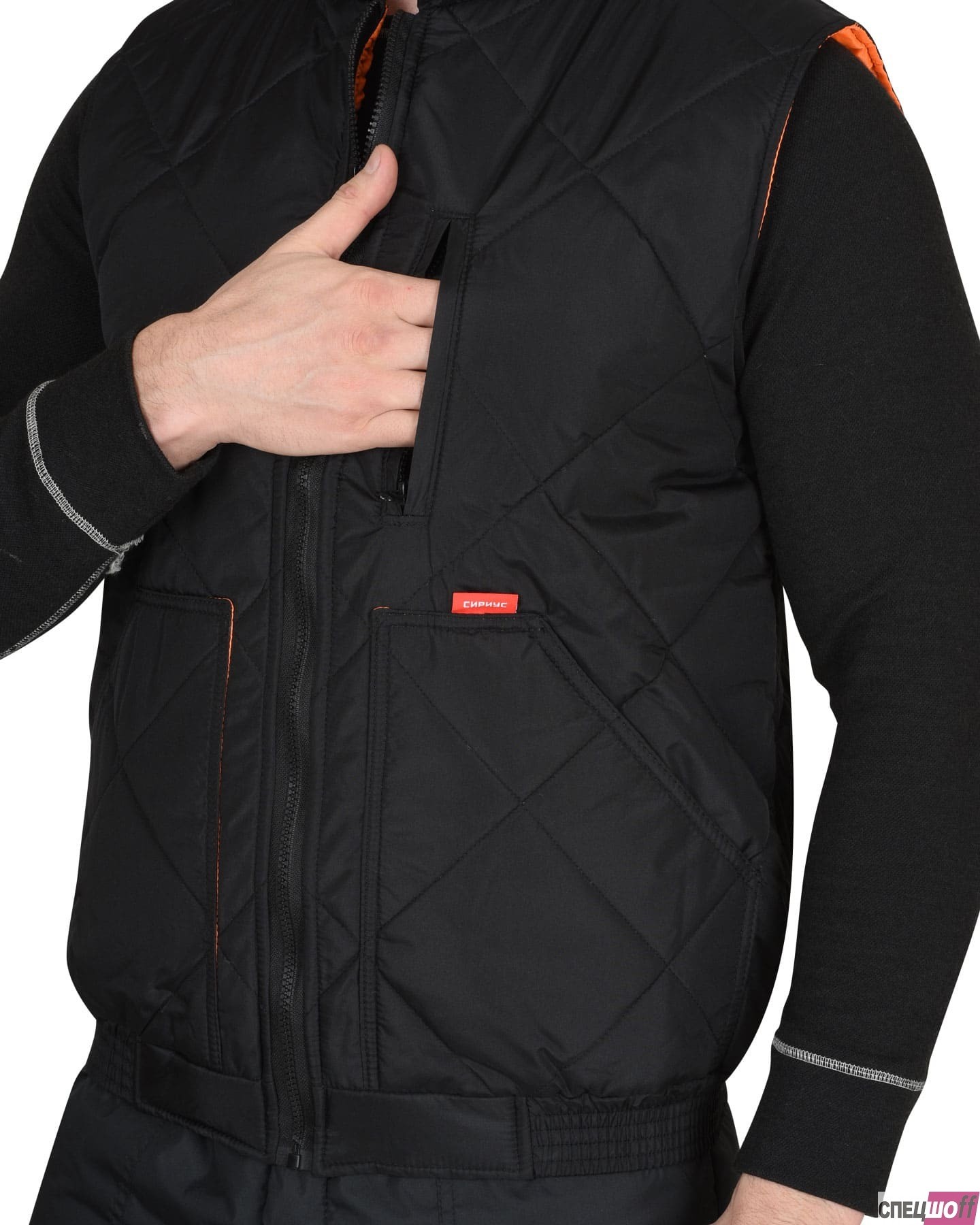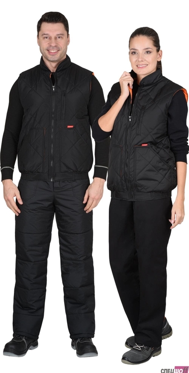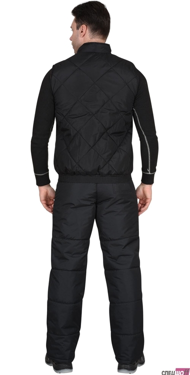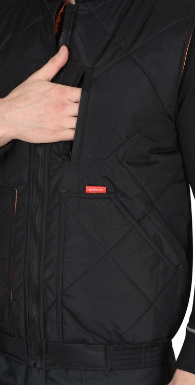 Жилет утепленный стеганный, на подкладке, прямой с углубленными проймами, с центральной бортовой застежкой на тесьму - «молния», воротником - «стойка», верхним прорезным карманом на «молнии» и нижними утепл.нными стеганными накладными карманами. Пояс притачной, с эластичной лентой.