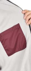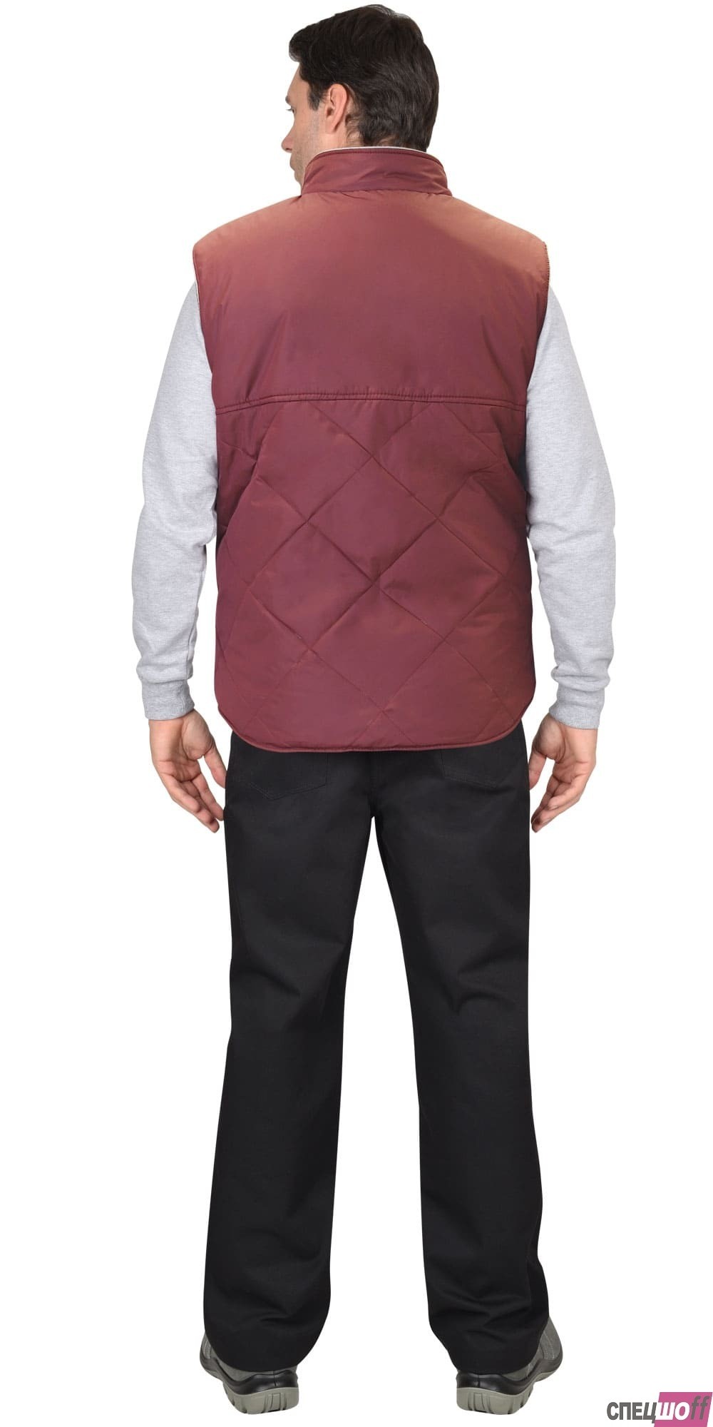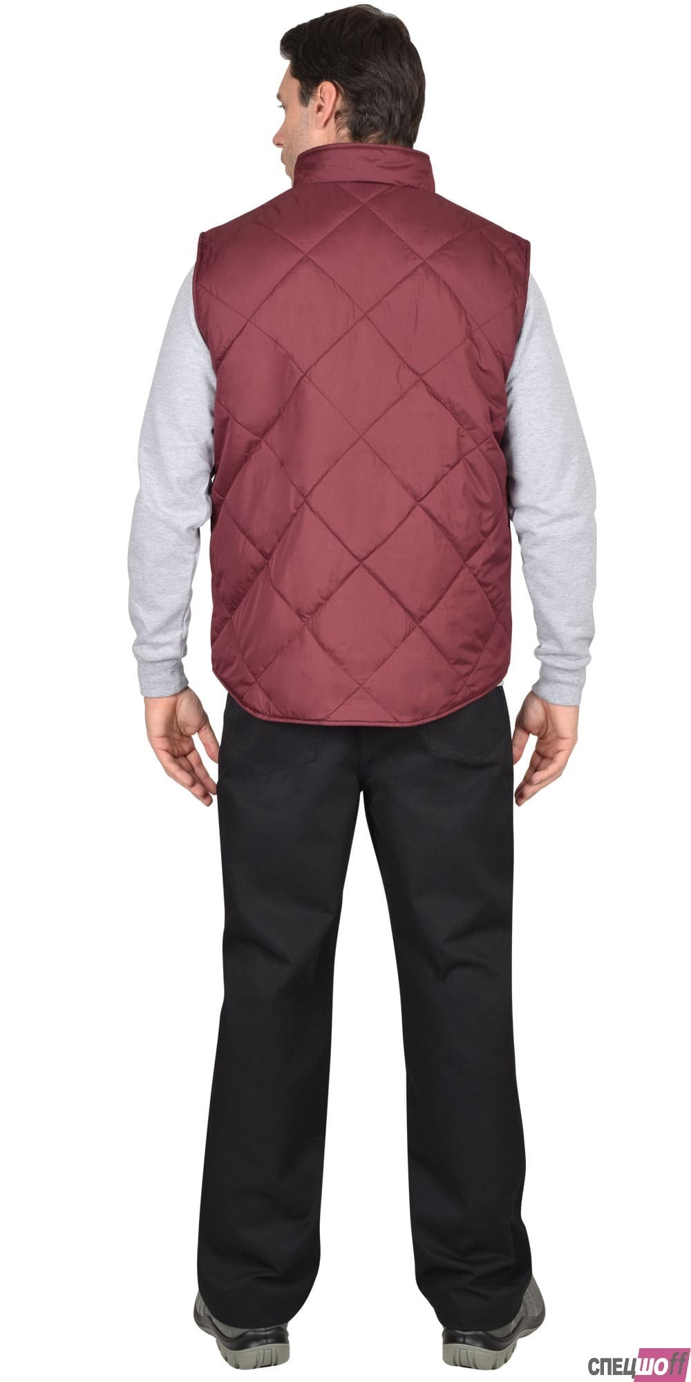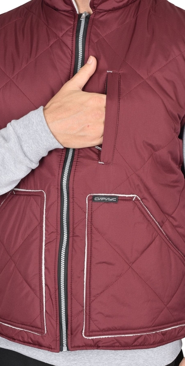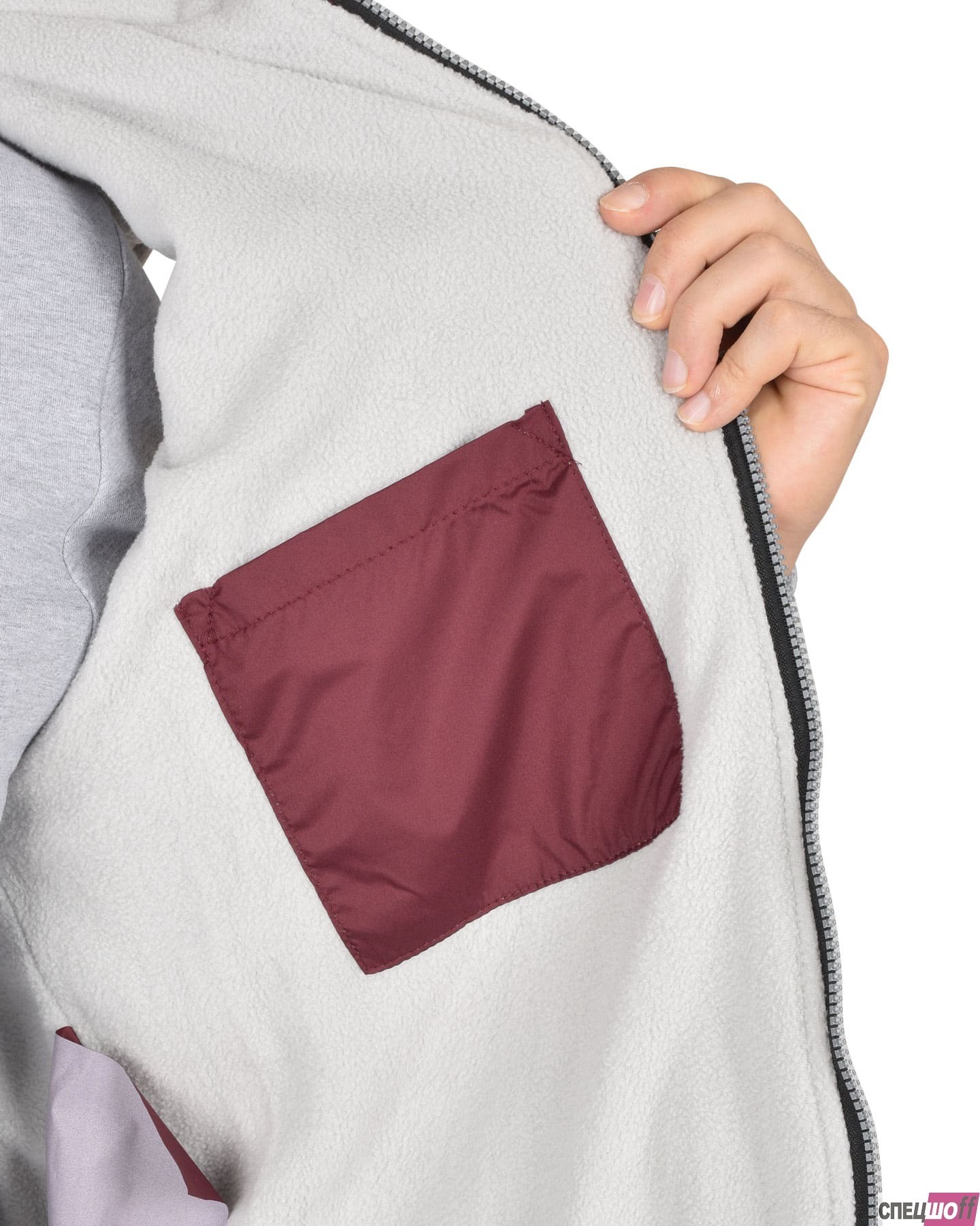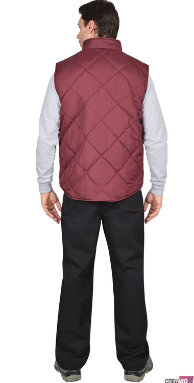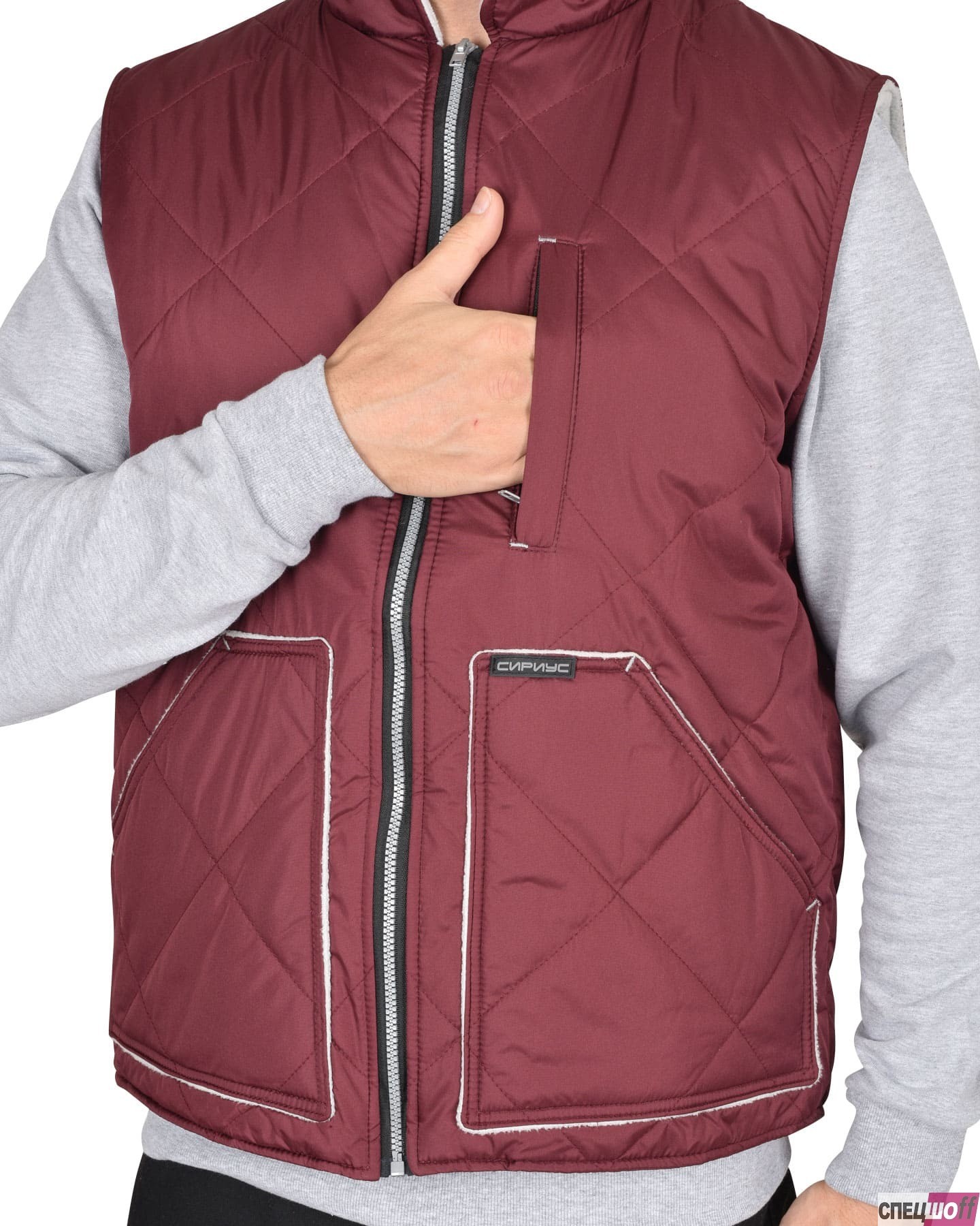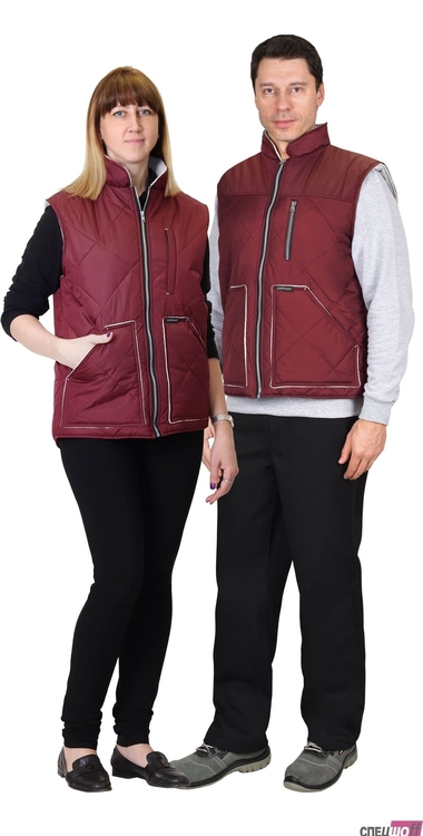 Жилет утеплённый с воротником стойка, с центральной застёжкой на тесьму "молния" до верха, с пристёгиваемым капюшоном. Полочка с двумя нижними карманами с клапанами, внутренней стороны на левой полочке расположен накладной карман на молнии, спинка удлинённая. Ткань верха: "Дюспо", плотностью 70 гр/м2 состав: 100% п/э. Основной цвет: серый (стальной) Ткань отделочная: "Дюспо" Цвет: жемчужный Ткань подкладочная: "Флис" сетлосерого цвета, "Таффета" состав: 100 п/э. Утеплитель: "Синтепон" один слой, итого - 150 гр/м2 состав: 100% п/э