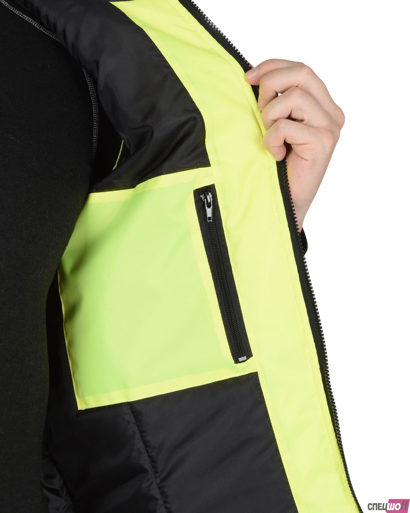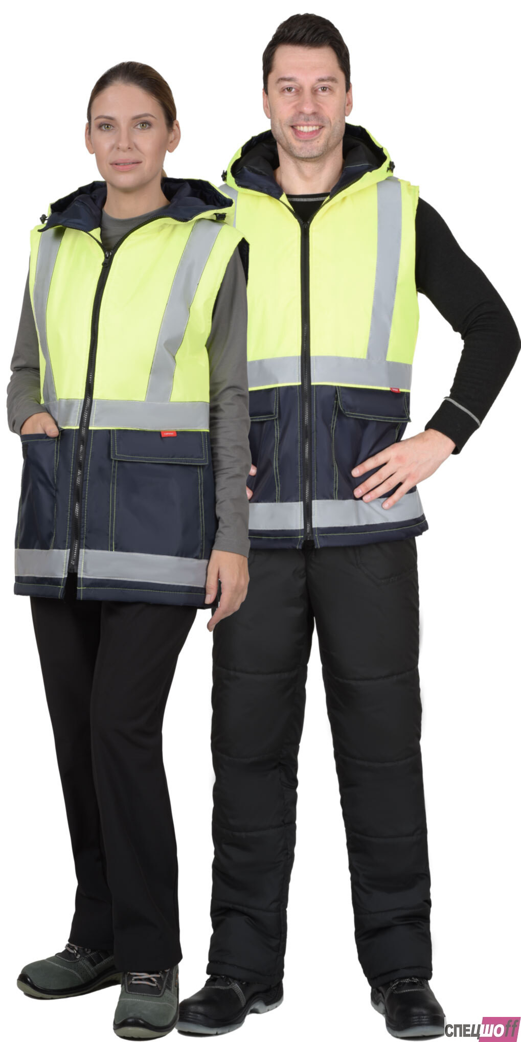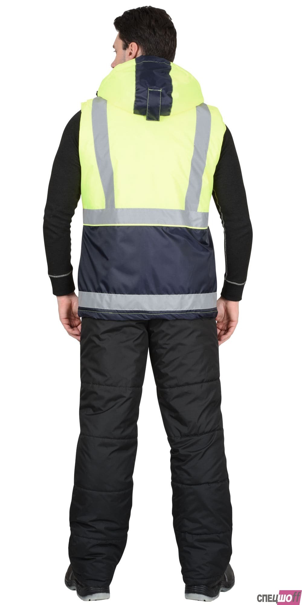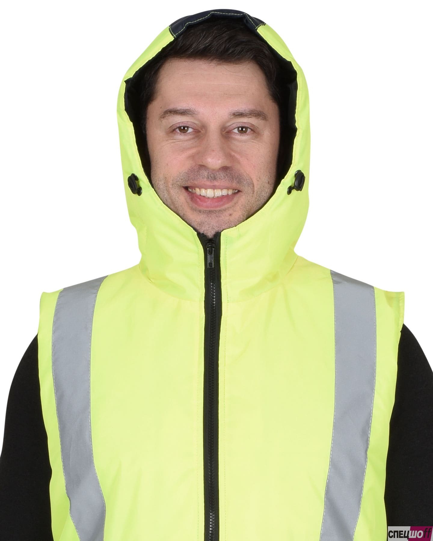 Жилет утепленный, с центральной бортовой застёжкой на тесьму - «молнию», с накладными карманами и клапанами застегивающиеся на потайную липучку 4,0см, с втачным капюшоном, с внутренним карманом застегивающийся на тесьму - «молния». В жилете предусмотрен лента светоотражающая (серая) 50мм 100% п/э для обеспечения сигнальной видимости в условиях пониженной видимости. Ткань верха: "Оксфорд", состав: 100% п/э, пл. 105 гр/м2 Ткань подкладочная: "Таффета", 100 % - п/э; на внутренней части воротника - "Флис" - 100% п/э, плотность 180 г/м2.Утеплитель: Синтепон, пл. 150 г/м2 - 1 слой.