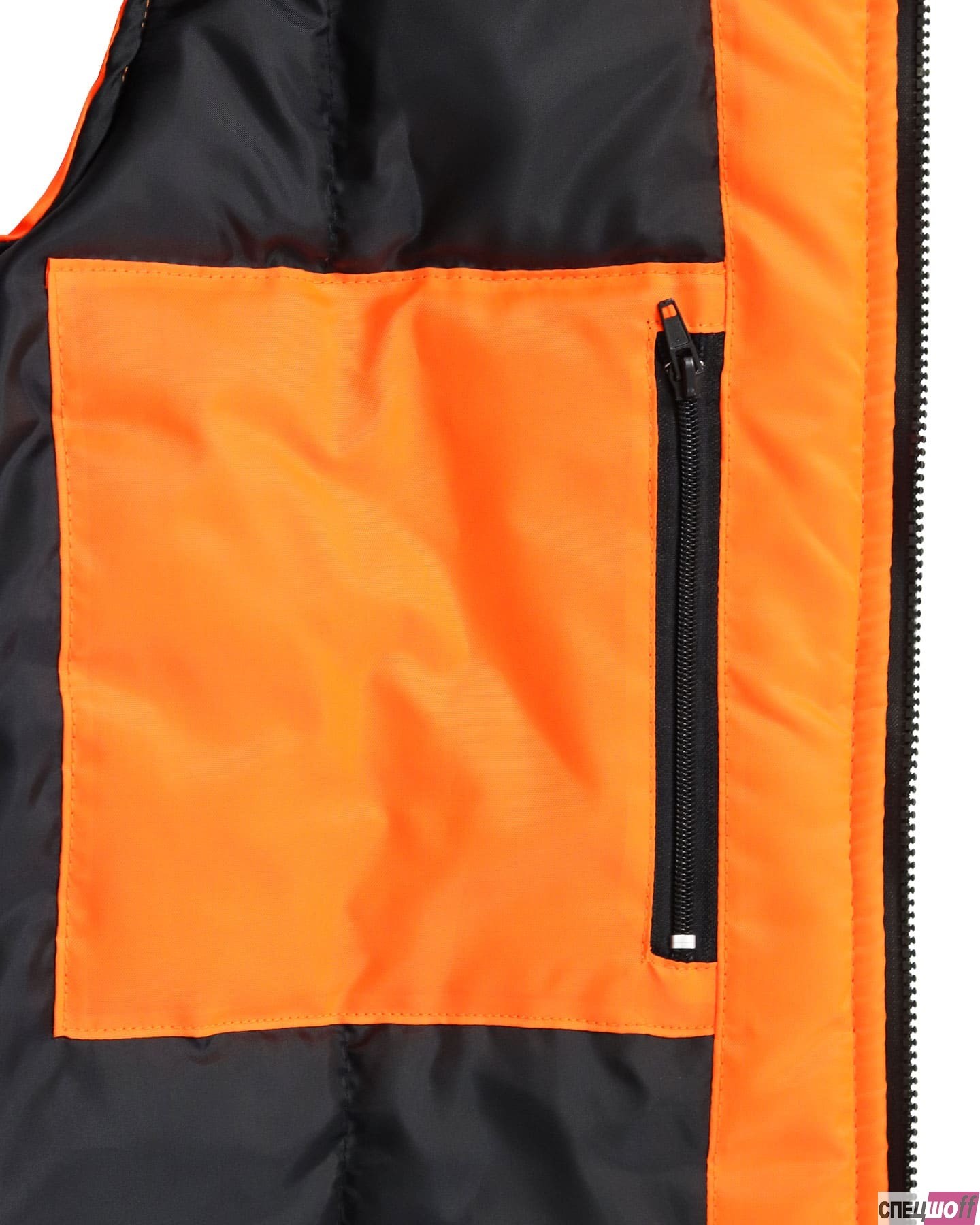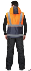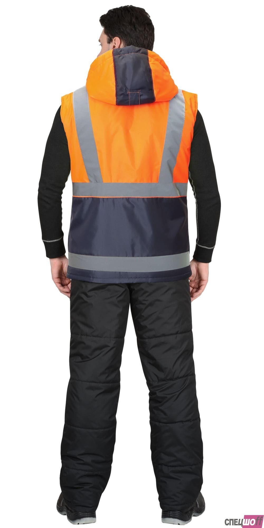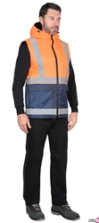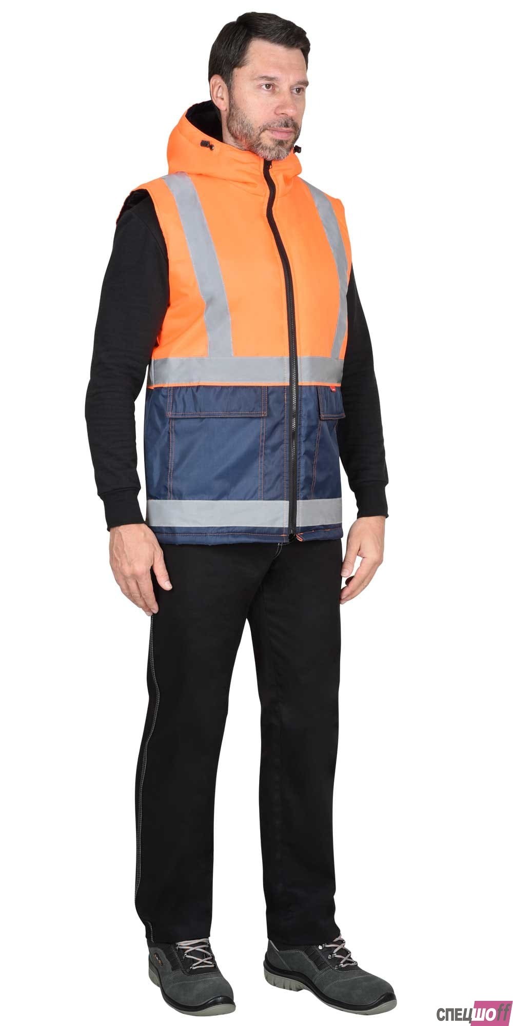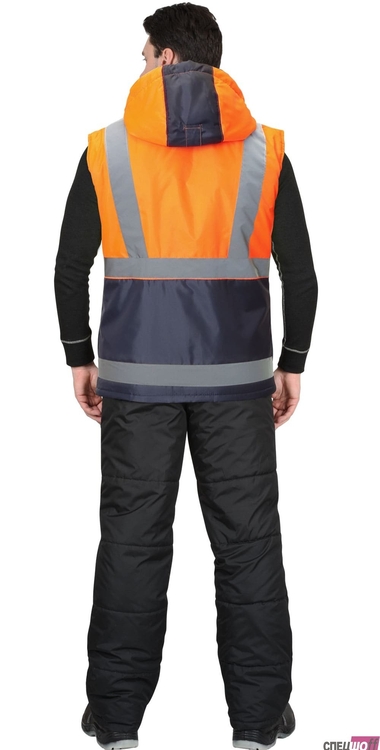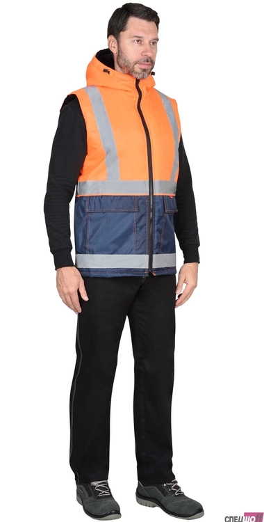 Жилет утепленный, с центральной бортовой застёжкой на тесьму - «молнию», с накладными карманами и клапанами застегивающиеся на потайную липучку 4,0см, с втачным капюшоном, с внутренним карманом застегивающийся на тесьму - «молния». В жилете предусмотрен лента светоотражающая (серая) 50мм 100% п/э для обеспечения сигнальной видимости в условиях пониженной видимости. Ткань верха: "Оксфорд", состав: 100% п/э, пл. 105 гр/м2 Ткань подкладочная: "Таффета", 100 % - п/э; на внутренней части воротника - "Флис" - 100% п/э, пл. 180 г/м2. ГОСТ 25295-2003