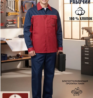 Костюм рабочий мужской "Смена": куртка и полукомбинезон цвет синий с бордовым ( размер 44-46 рост 182-188). Костюм "Смена" синий с бордовым состоит из куртки и полукомбинезона. Куртка с потайной застёжкой на пуговицы. Нагрудные карманы: один с клапаном, один потайной. Боковые карманы с косым входом и рукава с манжетами на пуговицах. Полукомбинезон с регулируемыми бретелями и застёжкой на пуговицы. На груди накладной карман с клапаном на липучке и дополнительным отделением. По бокам карманы с косым входом, а на задней части эластичная тесьма и карманы для инструментов.Костюм сшит из саржи (100 % хлопчатобумажная ткань) с водоотталкивающей пропиткой. Плотность ткани 230 г/кв.м. Изготовлен в соответствии с государственным стандартом ГОСТ 27575-87.