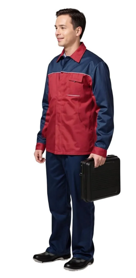 Костюм рабочий мужской "Смена": куртка и полукомбинезон цвет синий с бордовым ( размер 44-46 рост 182-188). Костюм "Смена" синий с бордовым состоит из куртки и полукомбинезона. Куртка с потайной застёжкой на пуговицы. Нагрудные карманы: один с клапаном, один потайной. Боковые карманы с косым входом и рукава с манжетами на пуговицах. Полукомбинезон с регулируемыми бретелями и застёжкой на пуговицы. На груди накладной карман с клапаном на липучке и дополнительным отделением. По бокам карманы с косым входом, а на задней части эластичная тесьма и карманы для инструментов.Костюм сшит из саржи (100 % хлопчатобумажная ткань) с водоотталкивающей пропиткой. Плотность ткани 230 г/кв.м. Изготовлен в соответствии с государственным стандартом ГОСТ 27575-87.