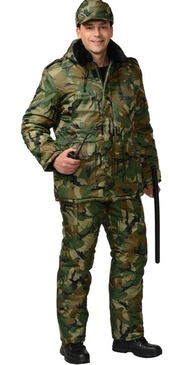 Костюм мужской утеплённый: куртка длинная, полукомбинезон. Куртка на молнии с ветрозащитным клапаном, съёмным капюшоном, накладными и прорезными карманами. Притачной меховой воротник, кулиска по линии талии, трикотажные манжеты внутри рукавов обеспечивают дополнительную теплозащиту. Полукомбинезон с центральной застёжкой-"молнией" и двумя боковыми накладными карманами.Тк. "Оксфорд", 100% п/э. Утеплитель: синтепон 150 гр/м2, в куртке 450 г/кв.м., в полукомбинезоне 300 г/кв.м. Подкладка: 100% п/э. Меховой воротник. ГОСТ 12.4.303-2016