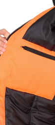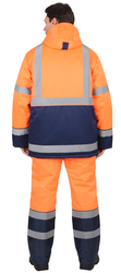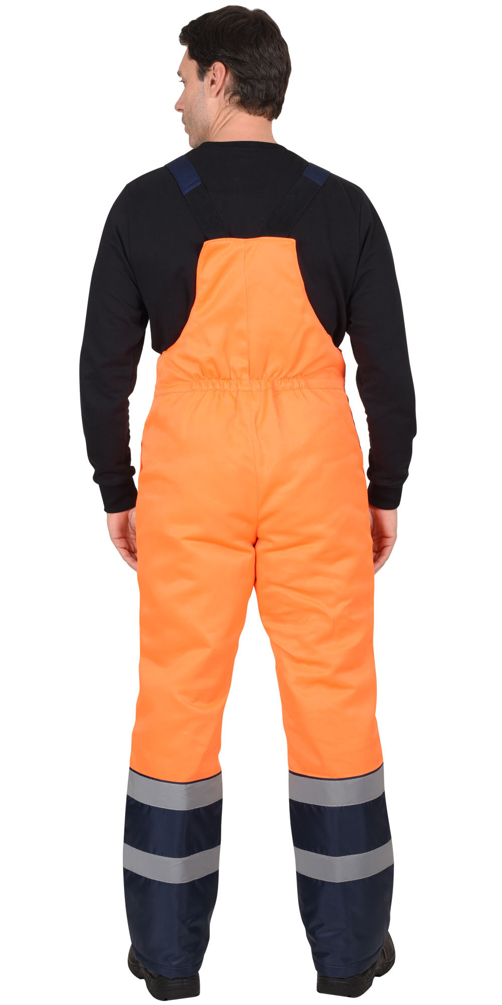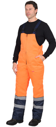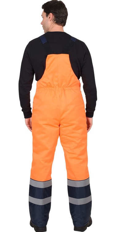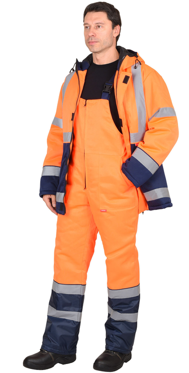По полочкам, спинки в области груди, талии, низа и низа рукавов настрачивается СОП 50 мм для обозначения сигнальной видимости. Полукомбинезон прямой, с отрезной грудкой и спинкой, с центральной застёжкой на двухзамковую тесьму - «молния», с накладными боковыми карманами, с эластичной лентой по спинке, для лучшего прилегания. Бретели регулируются при помощи эластичной ленты и пряжек фастексов.