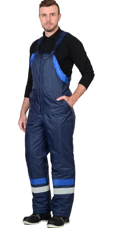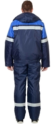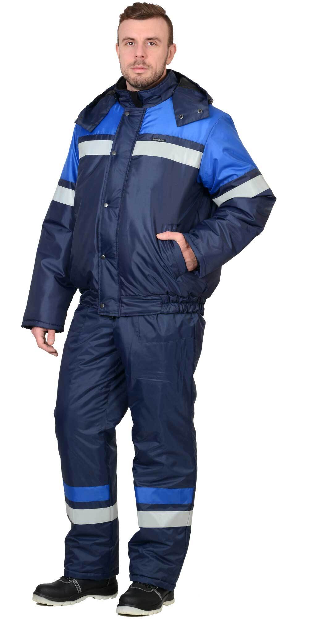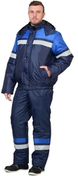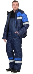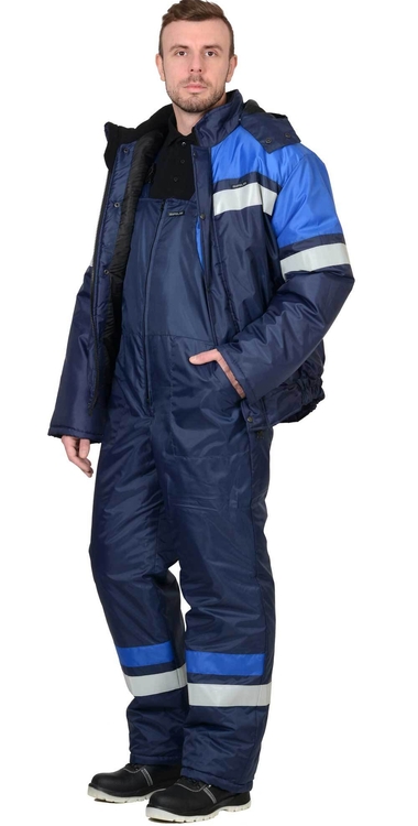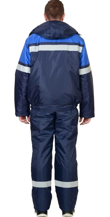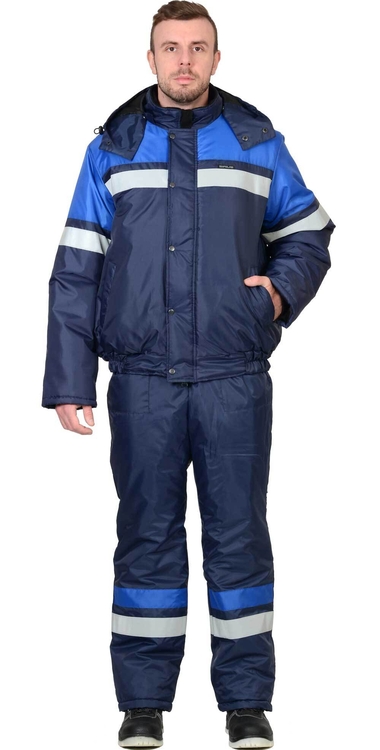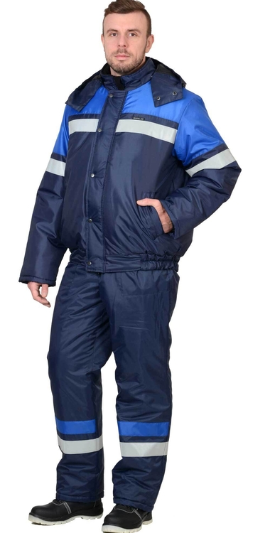 Костюм состоит из куртки и п/комбинезона.Куртка короткая; с центральной застежкой на молнию накрытую внешним ветрозащитным клапаном, с карманами листочка, воротником – стойка, пристегивающимся капюшоном, притачным поясом, частично стянутым резинкой, с внутренним карманом на подкладке. Рукава с внутренними трикотажными манжетами.Полукомбинезон с регулируемыми за счет эластичной тесьмы и фастексов бретелями; с центральной застежкой на молнию; с притачными нагрудником и спинкой; с эластичной тесьмой по талии спинки; с накладными боковыми карманами с наклонным входом на передних половинках; на нагруднике выполнены карманы в рельефеВ костюме предусмотрен СОП шириной 50мм для обеспечения сигнальной видимости в условиях пониженной видимости.