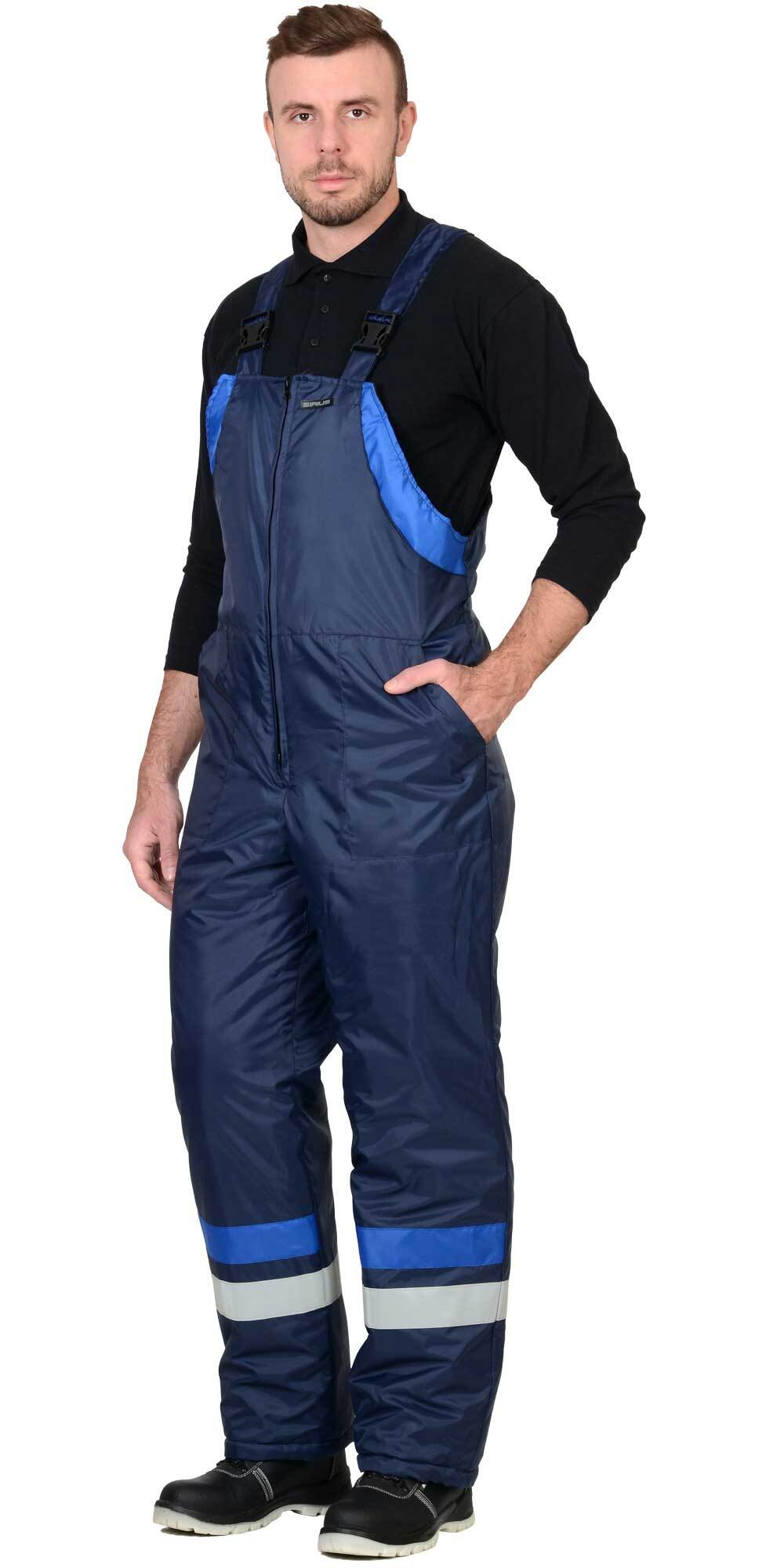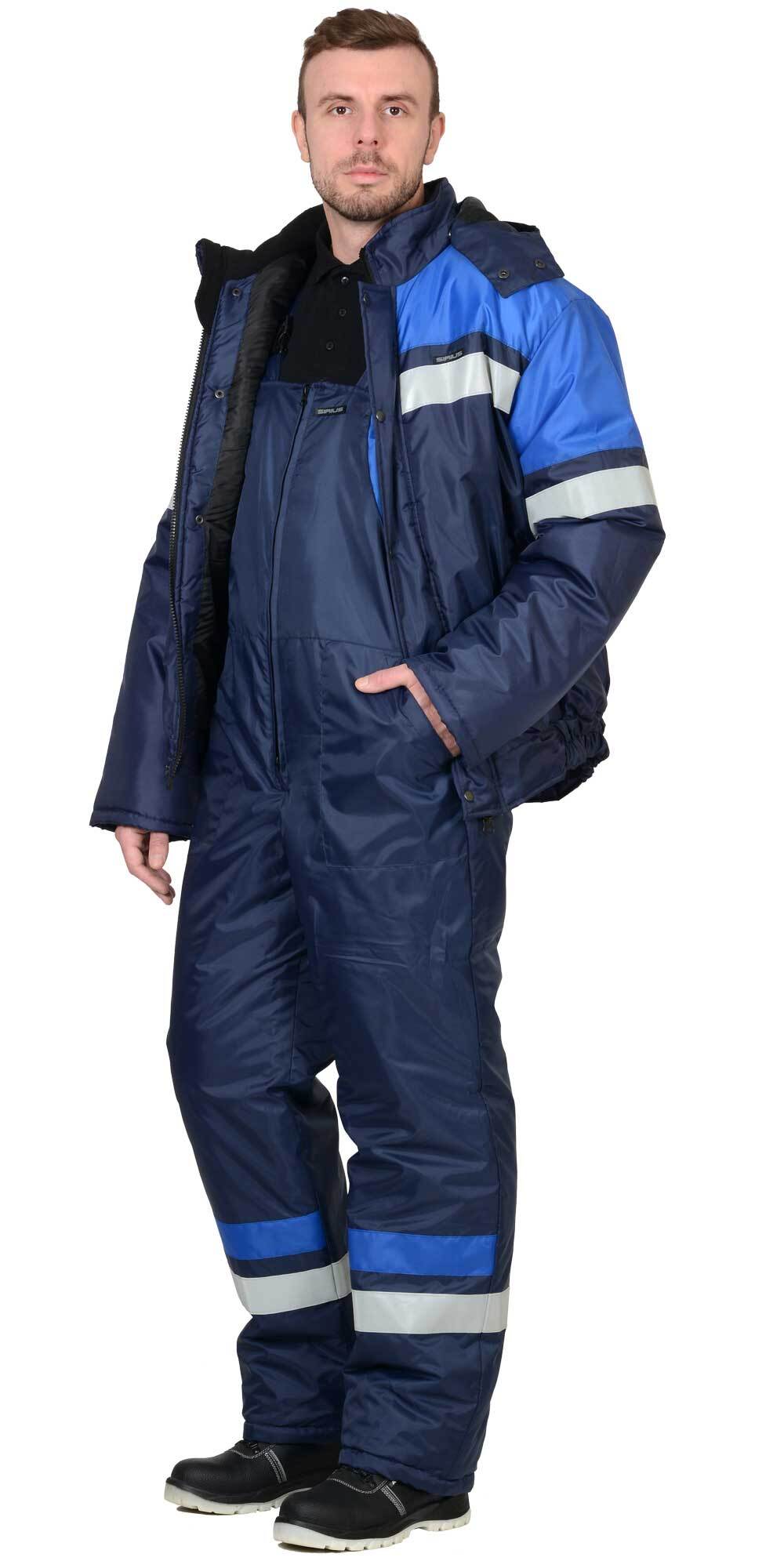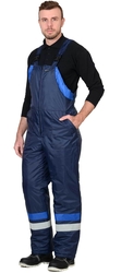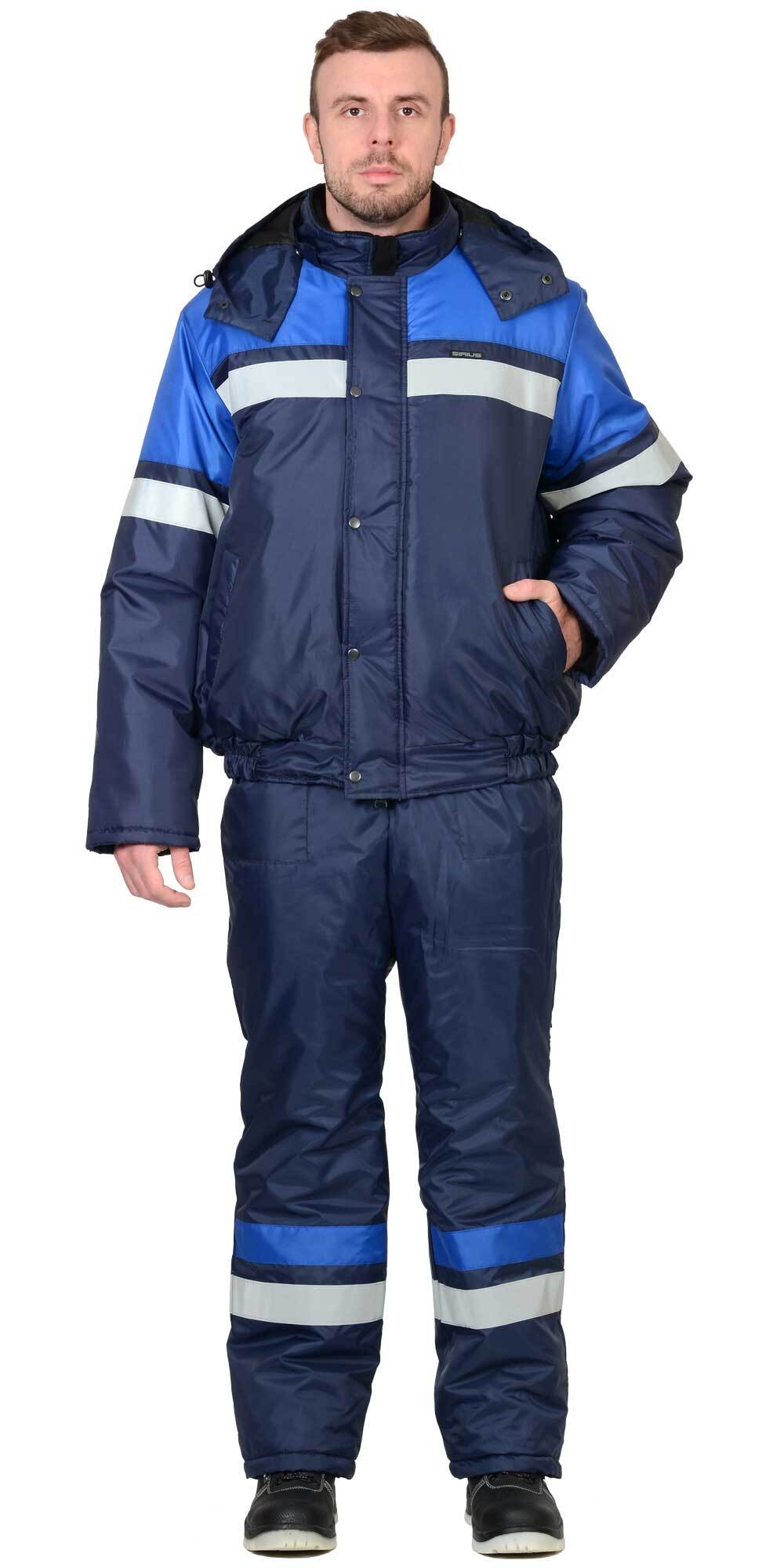 Костюм состоит из куртки и п/комбинезона.Куртка короткая; с центральной застежкой на молнию накрытую внешним ветрозащитным клапаном, с карманами листочка, воротником – стойка, пристегивающимся капюшоном, притачным поясом, частично стянутым резинкой, с внутренним карманом на подкладке. Рукава с внутренними трикотажными манжетами.Полукомбинезон с регулируемыми за счет эластичной тесьмы и фастексов бретелями; с центральной застежкой на молнию; с притачными нагрудником и спинкой; с эластичной тесьмой по талии спинки; с накладными боковыми карманами с наклонным входом на передних половинках; на нагруднике выполнены карманы в рельефеВ костюме предусмотрен СОП шириной 50мм для обеспечения сигнальной видимости в условиях пониженной видимости.