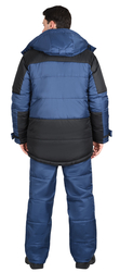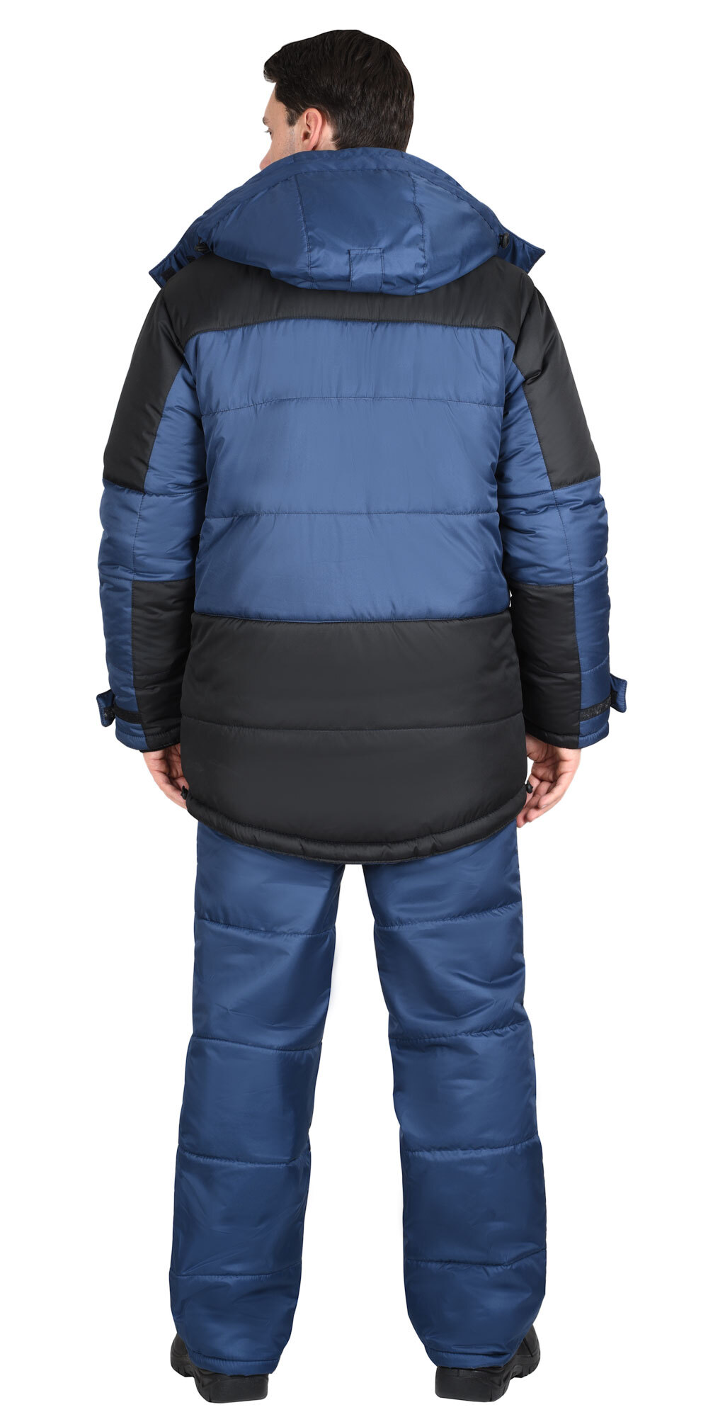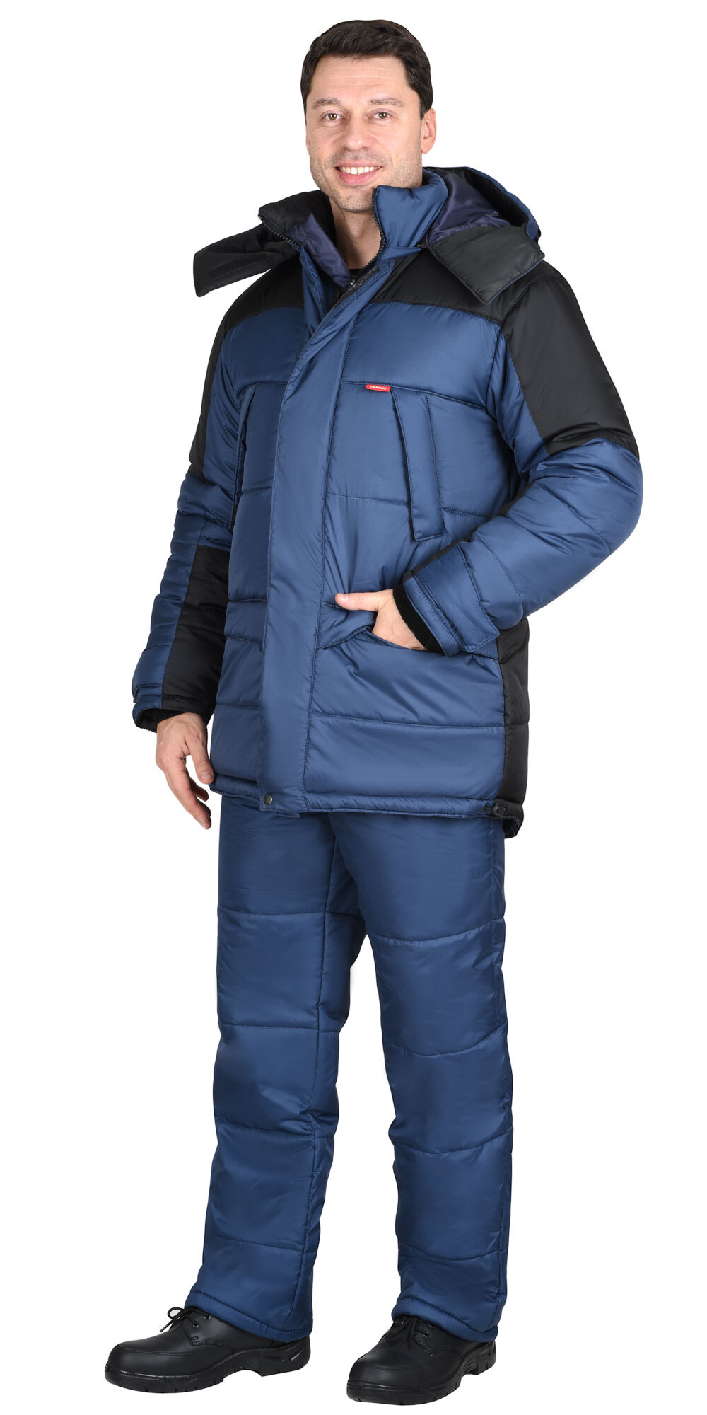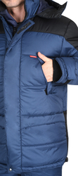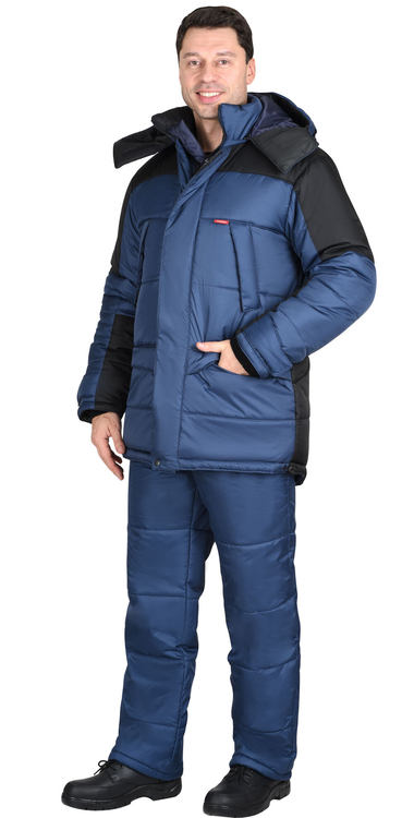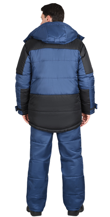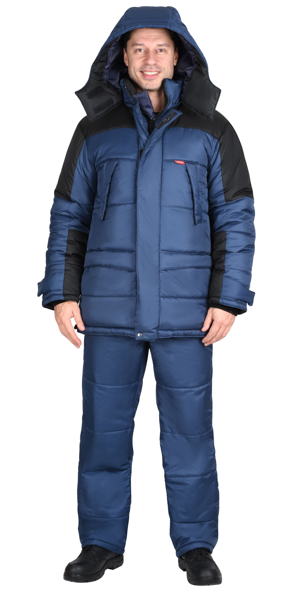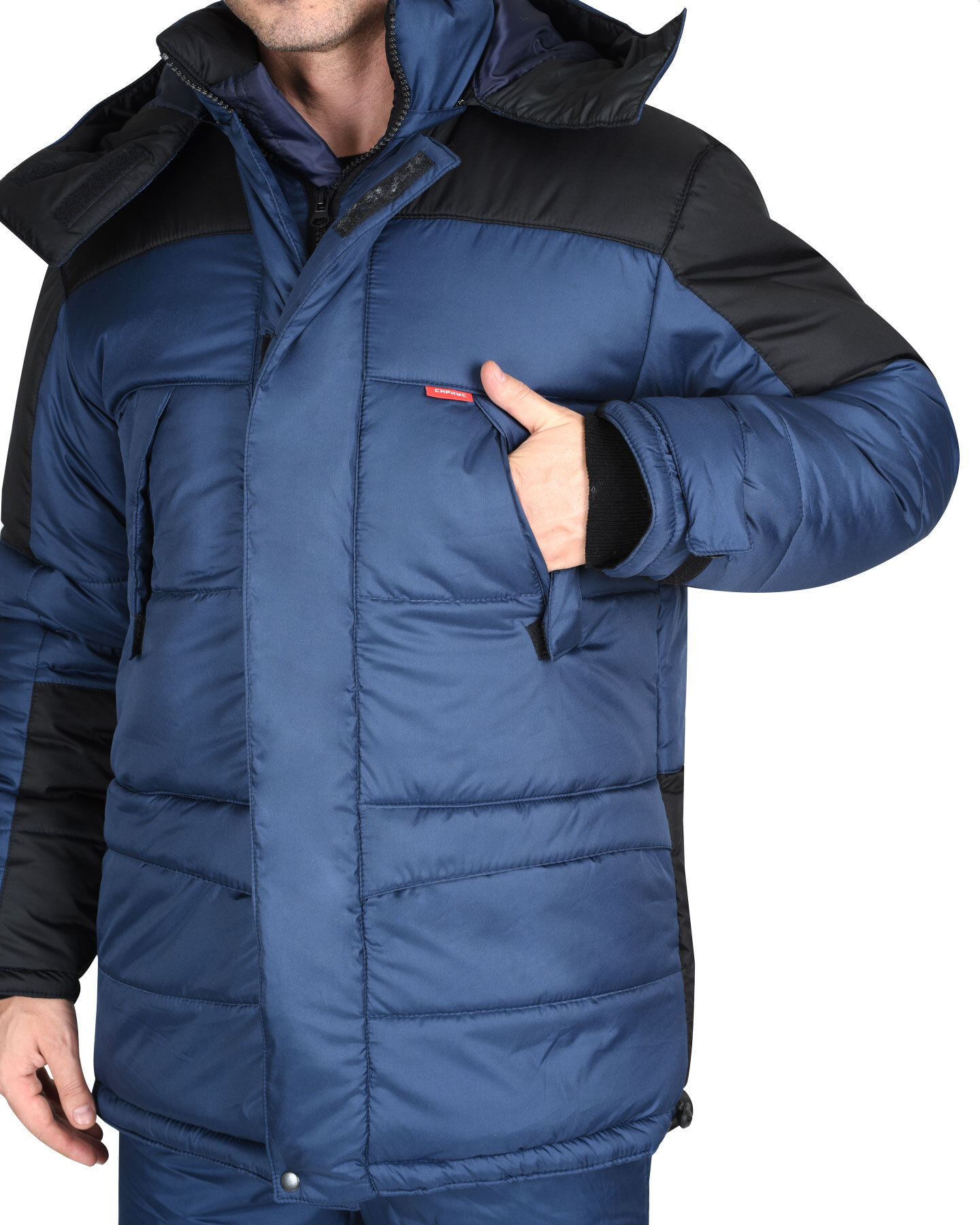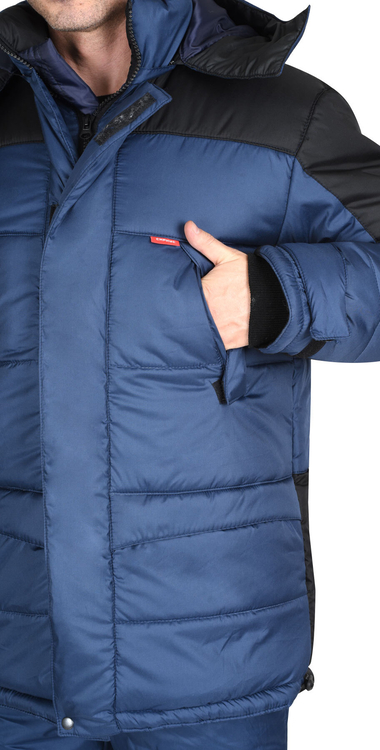 Куртка прямого силуэта; с горизонтальными строчками настрачивания слоя утеплителя на детали полочек, спинки, рукавов; воротник - «стойка»; с тесьмой «молния» по горловине, скрытой под планкой, для пристёгивания капюшона; с центральной бортовой застёжкой на двухзамковую тесьму «молния» и двумя внешними ветрозащитными клапанами, застёгивающимися на 4 текстильные застёжки «липучки» длиной 9,5см и одну кнопку, по низу планки; с внутренним ветрозащитным клапаном правой полочки (от верхнего края воротника до низа куртки), из ткани подкладка.