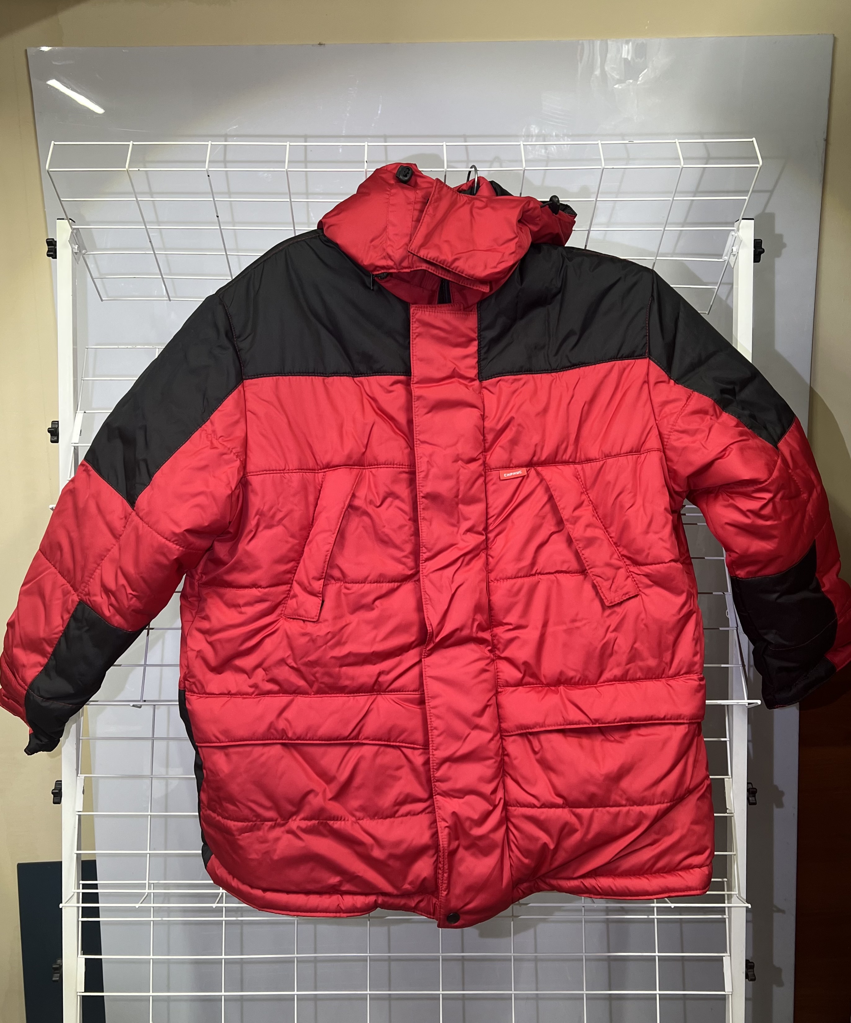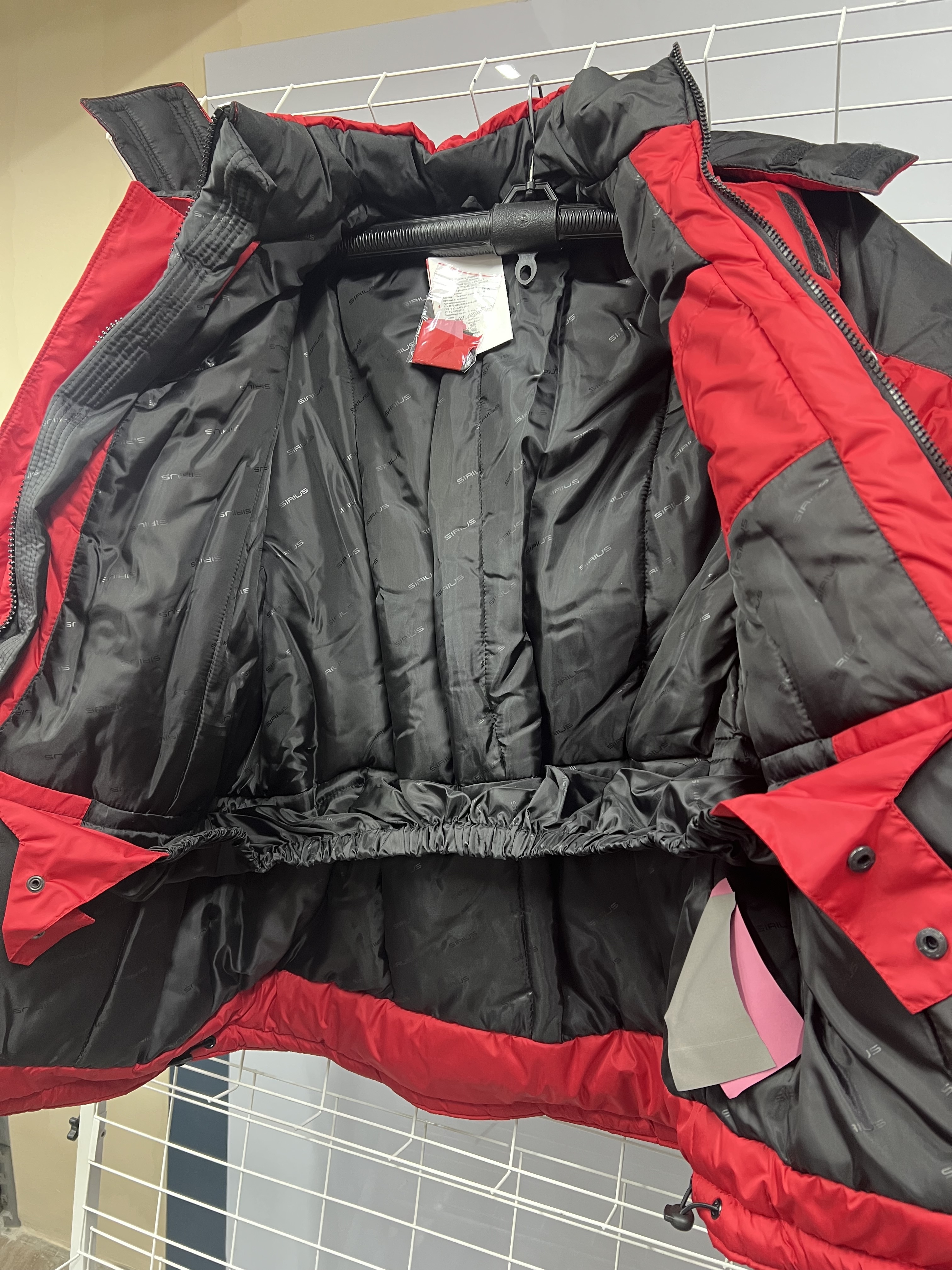 Зимняя куртка прямого силуэта; с горизонтальными строчками настрачивания слоя утеплителя на детали полочек, спинки, рукавов; воротник - «стойка»; с тесьмой «молния» по горловине, скрытой под планкой, для пристёгивания капюшона; с центральной бортовой застёжкой на двухзамковую тесьму «молния» и двумя внешними ветрозащитными клапанами, застёгивающимися на 4 текстильные застёжки «липучки» длиной 9,5см и одну кнопку, по низу планки; с внутренним ветрозащитным клапаном правой полочки (от верхнего края воротника до низа куртки), из ткани подкладка.