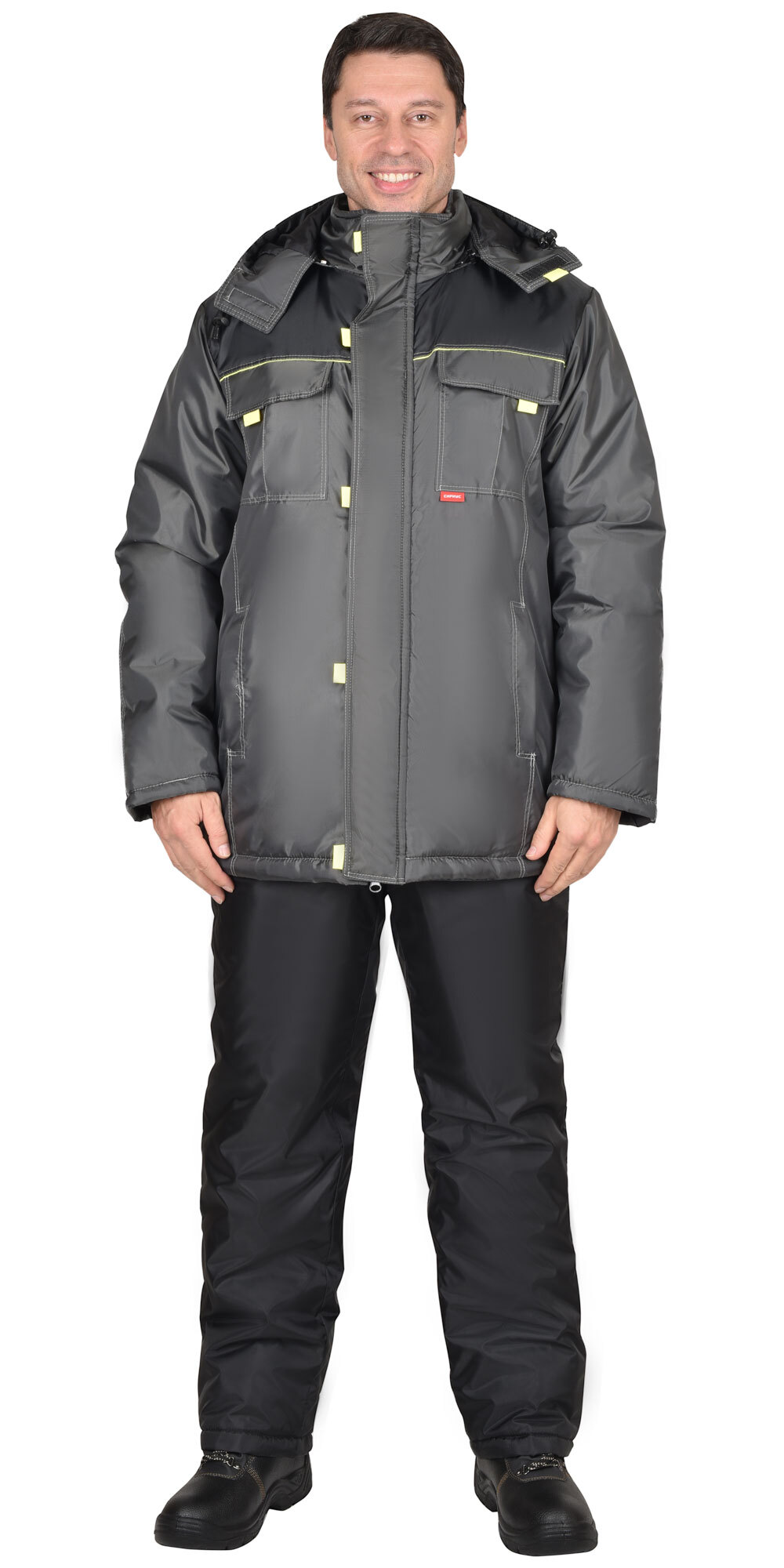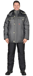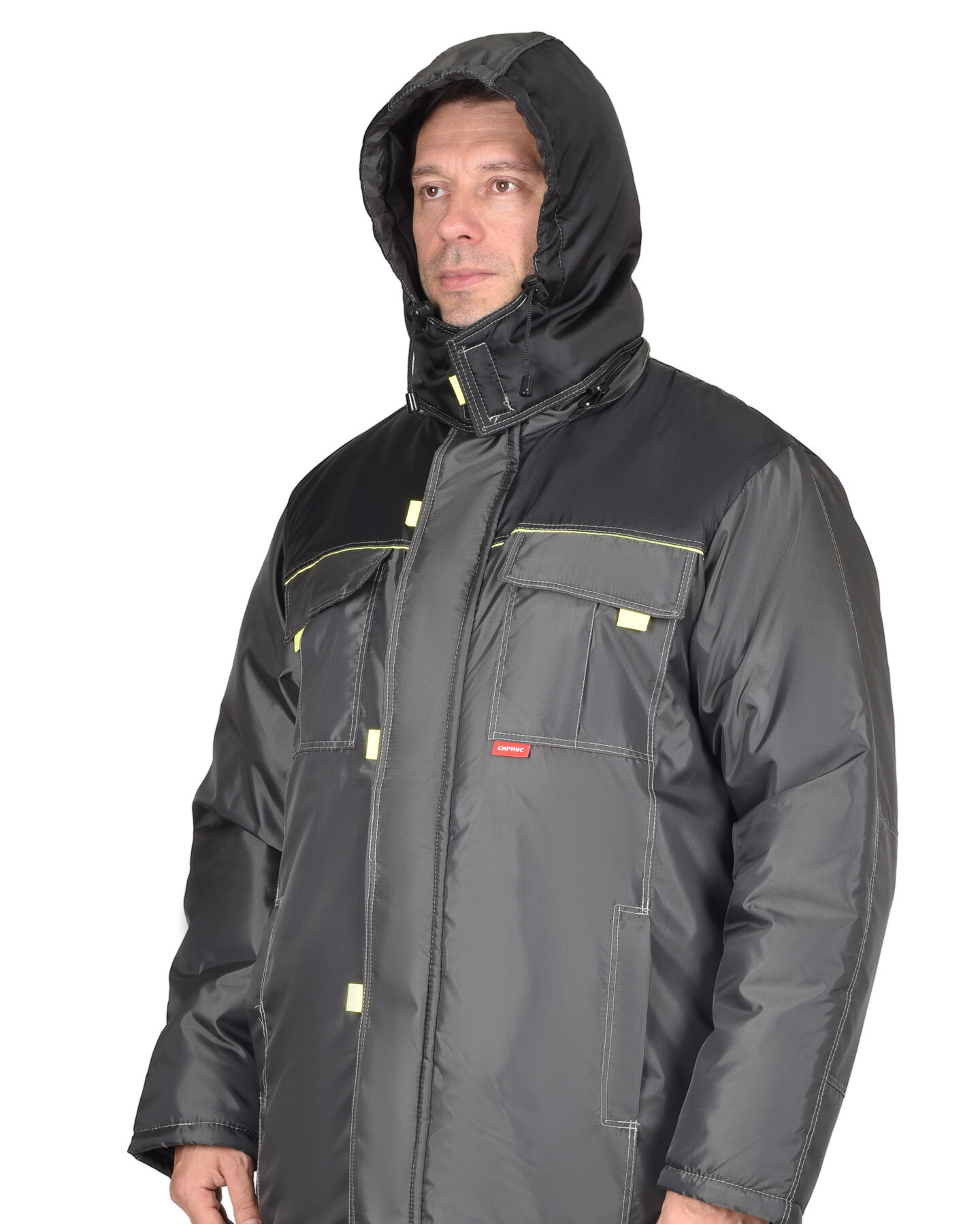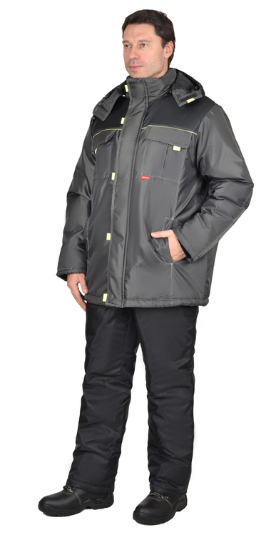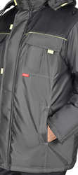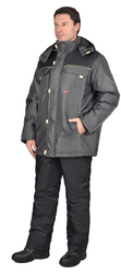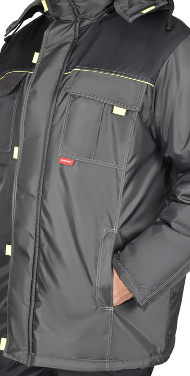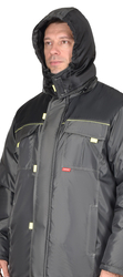 Куртка длинная прямого силуэта, с притачной утеплённой подкладкой, с центральной застёжкой на тесьму - «молния», ветрозащитной планкой на левой полочке застегивающиеся на потайную липучку и 5-ю малыми декоративными патами, с подпланкой правой полочки и воротником - «стойка».