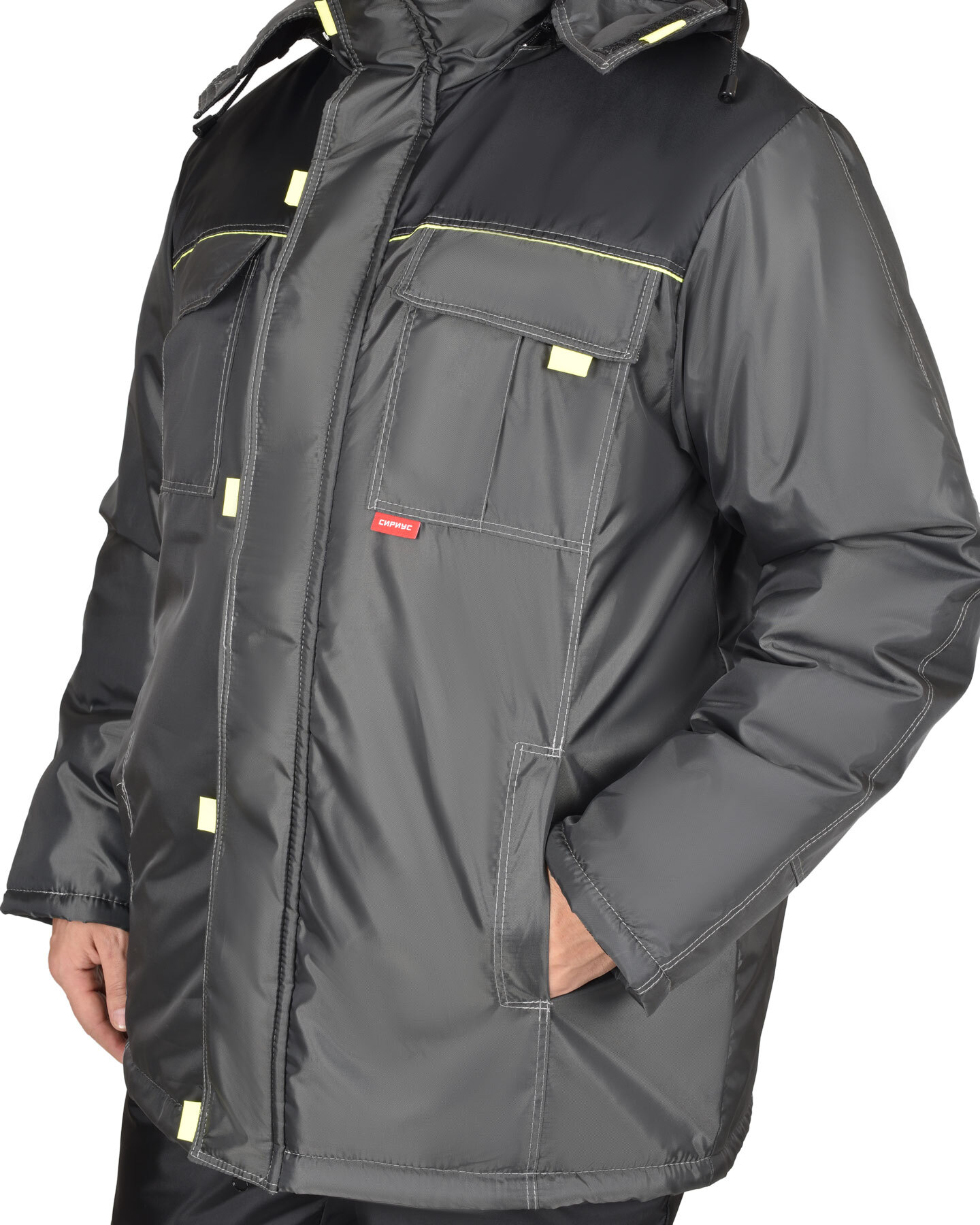 Рукава втачные с налокотниками и внутренним трикотажным напульсником.
