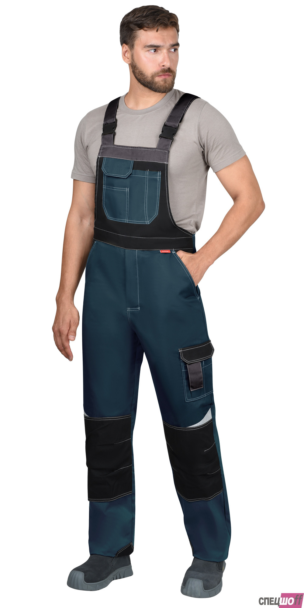 Полукомбинезон прямой с застёжкой спереди - гульфик с молнией и с застёжкой в правом боковом шве на пуговицы, с отрезной грудкой, с бретелями, с боковыми внутренними карманами на передних половинках, с накладными карманами на правой задней половинке и на левом боковом шве. Полукомбинезон с объемными наколенниками с нижним входом для амортизационного вкладыша. Бретели регулируются при помощи застежек-фастексов и резинки. В полукомбинезоне предусмотрены светоотражающие элементы, для обозначения сигнальной видимости.