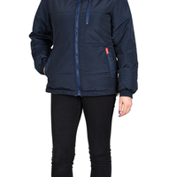 Куртка короткая прямого силуэта, с центральной застёжкой на молнию с ветрозащитной планкой с кнопками и липучками, с поясом. Воротник стойка с декоративной шлевкой сзади. Полочки с нагрудными накладными карманами с клапанами на липучки, карманы со складками из отделочной ткани. На правом нагрудном кармане, по середине декоративная лента с пластмассовым полукольцом. Нижние карманы в рельефах с отстрочкой в виде "листочки". Рукава с манжетами на кнопках и с накладными карманами с клапанами на липучках, левый карман со складкой. Куртка по низу регулируется сзади патами с кнопками. Предусмотрены световозвращающие элементы для обозначения сигнальной видимости.
