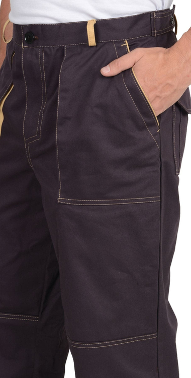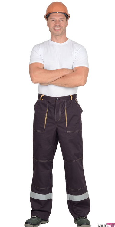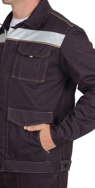 Куртка укороченная, с отложным воротником, с центральной потайной застежкой на пуговицы, пояс регулируется по ширине патами и пуговицами. Брюки с усилительными накладками в области колен. Костюм с контрастными строчками и СОП шириной 50 мм. ГОСТ 12.4.280-2014.