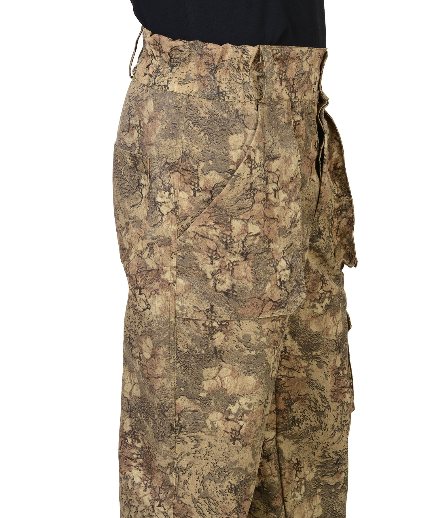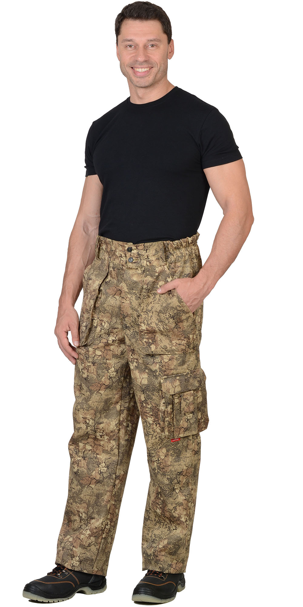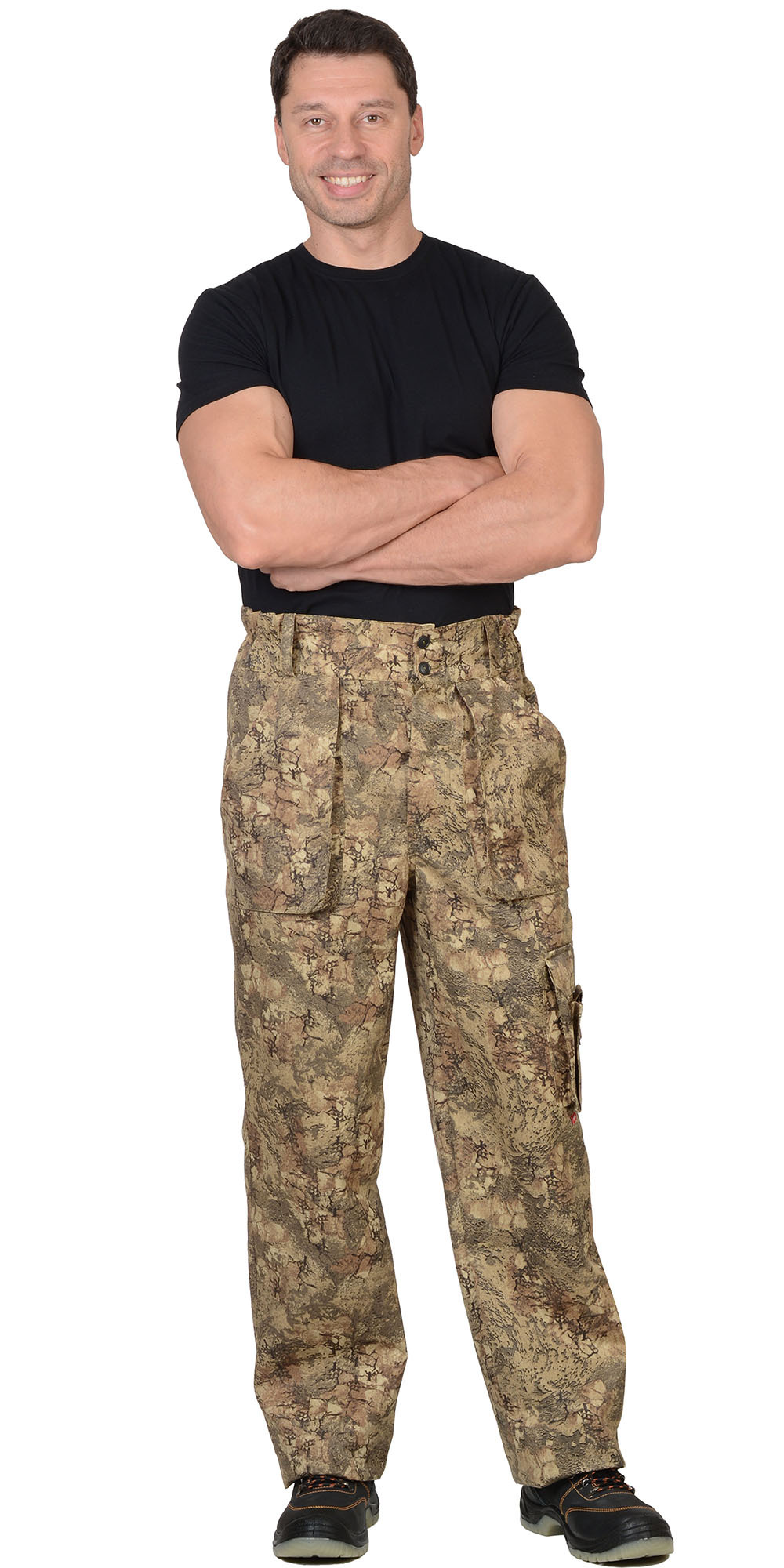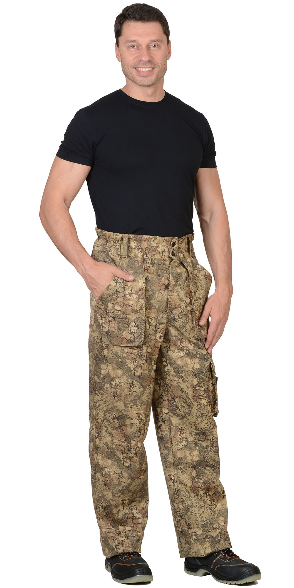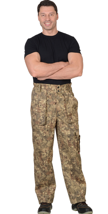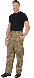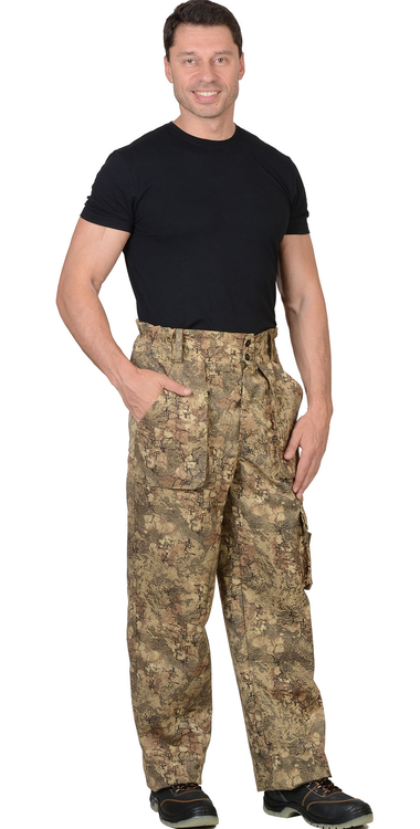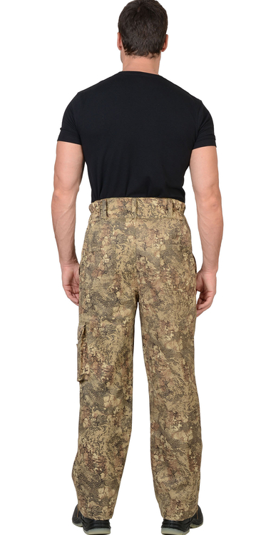 Брюки прямые, с застёжкой спереди на 3 петли и 3 пуговицы, на притачном поясе, частично стянутым на эластичную тесьму и застёгивающимся на 2 петли и 2 пуговицы. Брюки с накладными, объёмными карманами на передних половинках и на левом боковом шве, задние половинки с двумя фигурными накладными карманами. Тк."Рип-Стоп", ВО, 65% п/э., 35% х/б, 215г/кв.м. ГОСТ 12.4.280-2014