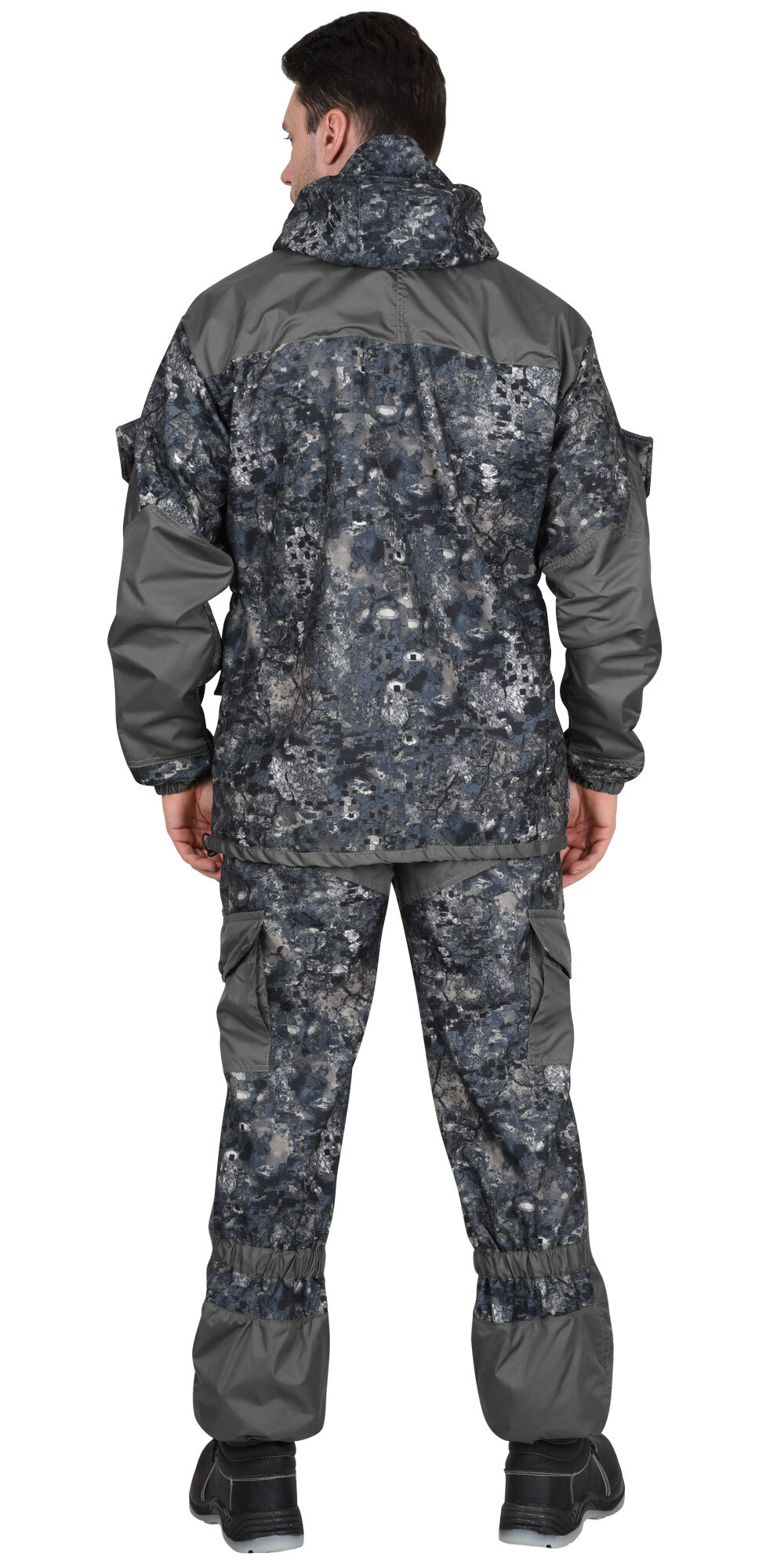 Куртка удлиненная, прямого силуэта, с центральной супатной застежкой на петли и пуговицы, нижняя петля сквозная, с карманами листочка и фигурным клапанами на пуговице и с внутренним карманом. Рукава с полуобъемными накладными карманами и фигурными клапанами, которые застегиваются на потайную липучку, имеют притачную нижнюю деталь на резинке и налокотники. Капюшон с козырьком, двумя кулисами для регулировки, застежкой на 2 петли и пуговицы. В области талии резинка для частичной стяжки. Низ куртки регулируется шляпной резинкой. Брюки с центральной застежкой гульфика на три петли и пуговицы, пояс цельнокроеный с застежкой на одну петлю и пуговицу, с пятью узкими шлевками, с эластичной тесьмой по всей ширине цельнокроеного пояса, со съёмными бретелями, с карманами в боковых швах, с задними накладными карманами, застегивающимися на пуговицу, с накладными карманами с объёмом на боковых швах с фигурными клапанами застегивающиеся на пуговицу и наколенниками. По низу брюк пуфта с завязками. Ткань верха: "Полофлис", состав: 100 % п/э, пл. 280 г/м2. Ткань отделочная: "Дюспа", состав: 100 % п/э, пл. 90 г/м2.