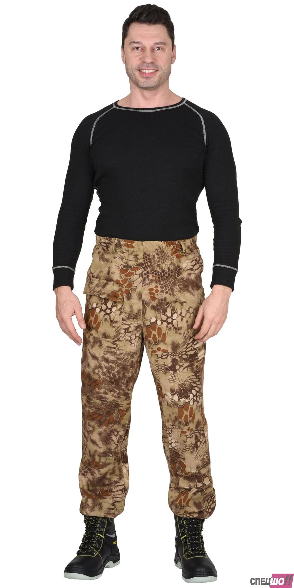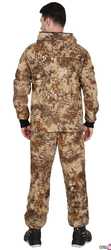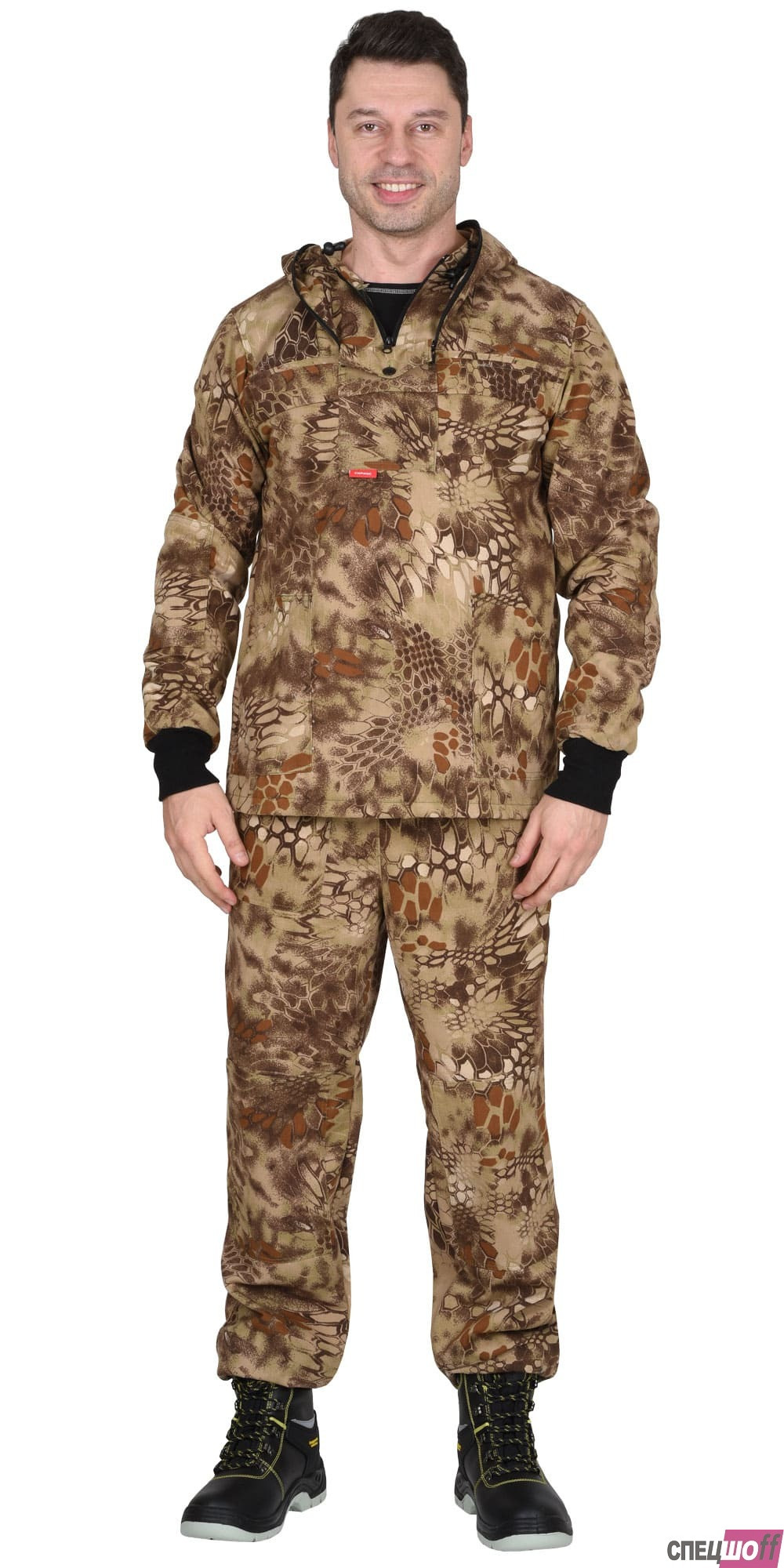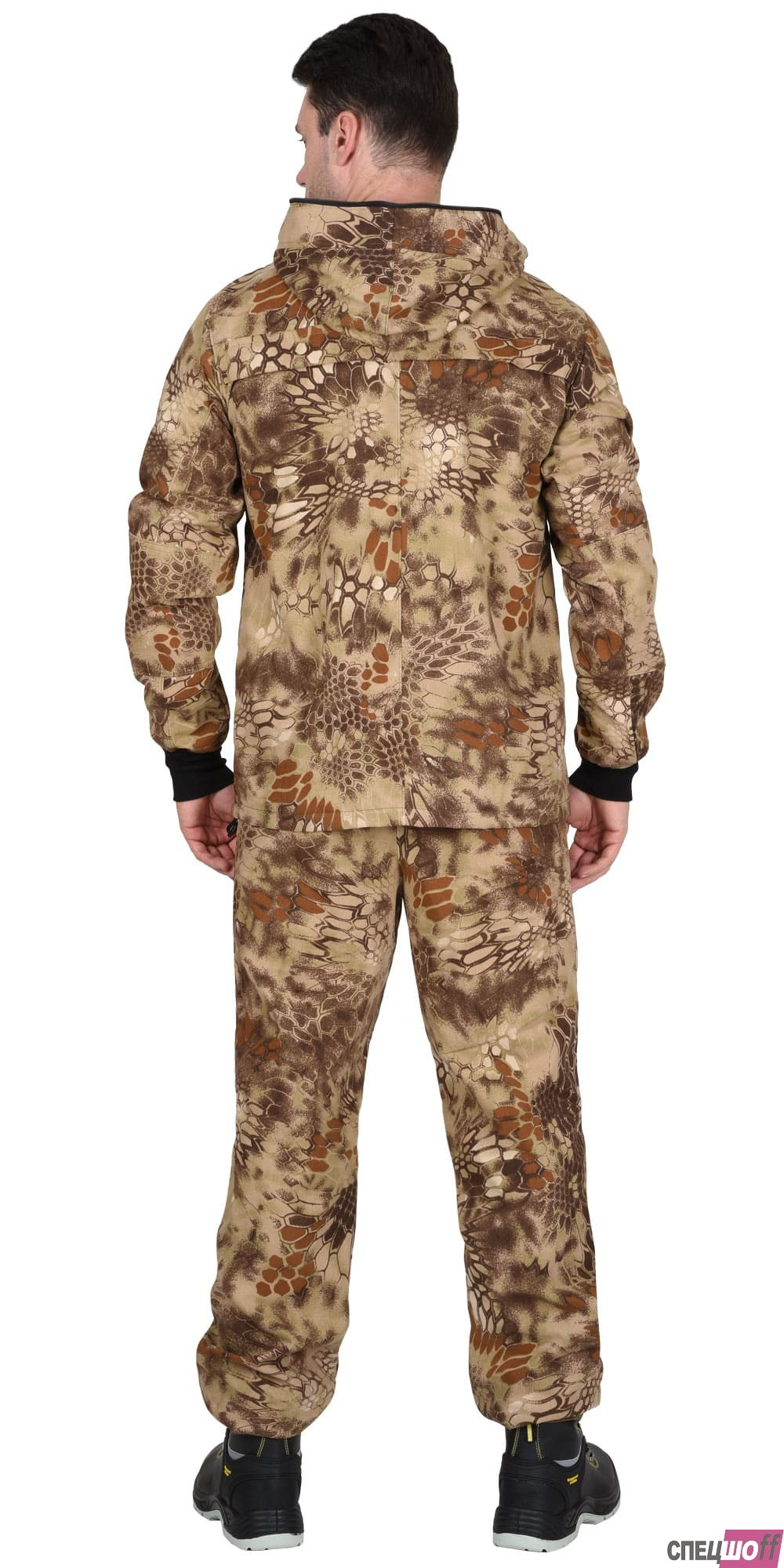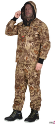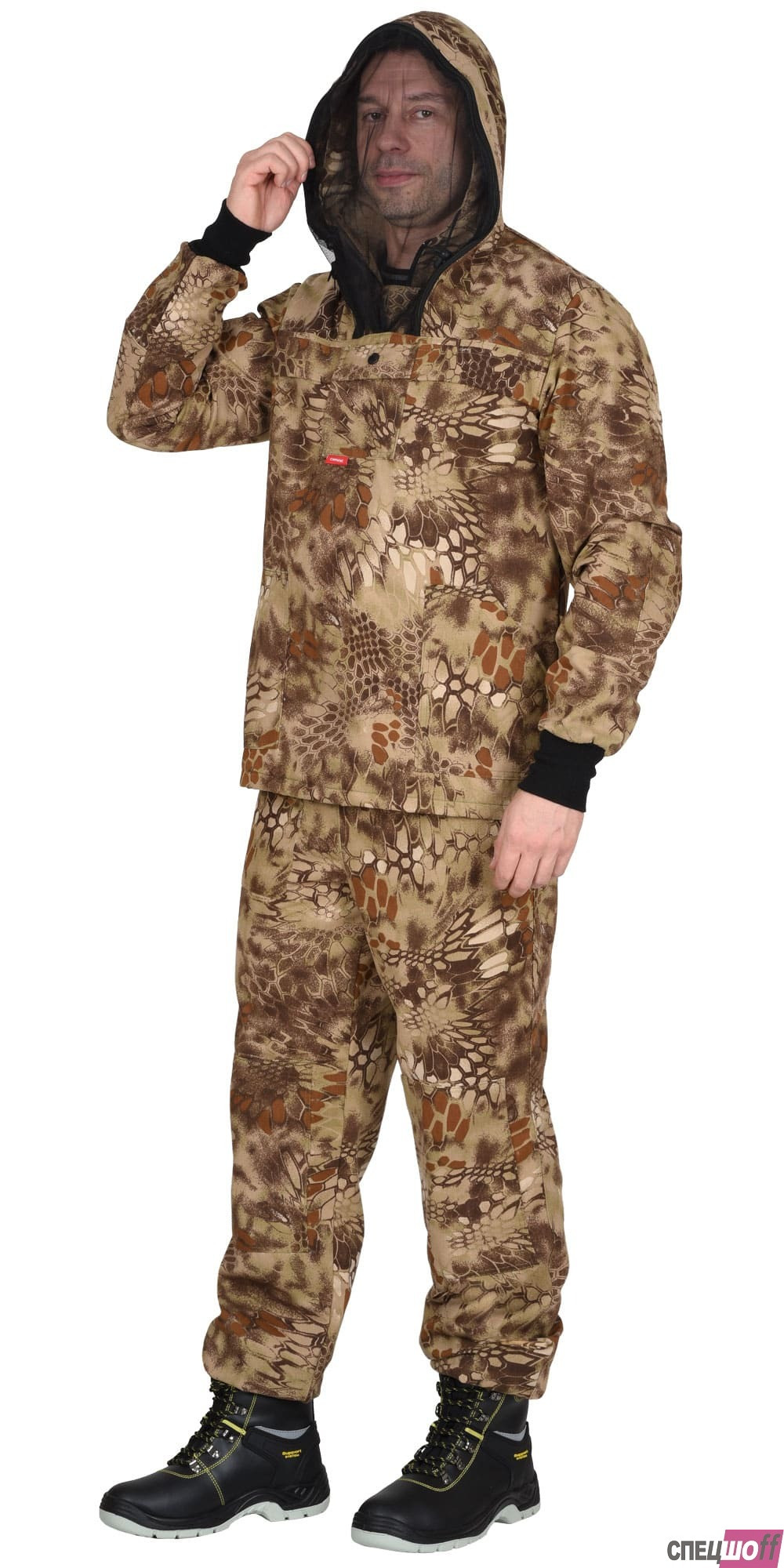 Куртка с притачным капюшоном с противомоскитной сеткой и накладным нагрудным карманом, в который при необходимости можно спрятать противомоскитную сетку. Рукава с трикотажной манжетой, ширина куртки внизу регулируется.Брюки с цельнокроеным поясом, стянутым эластичной лентой, с 4-мя шлёвками, с наколенниками, с накладным карманом с клапаном, застёгивающимся на ленту "контакт", низ брюк с трикотажными манжетами.