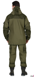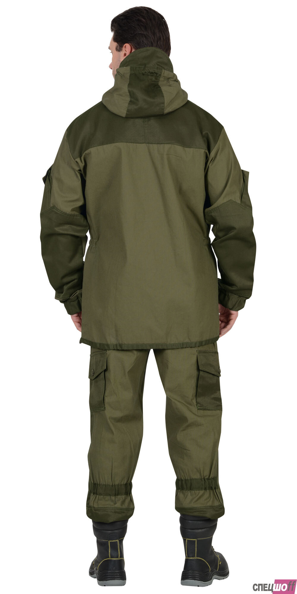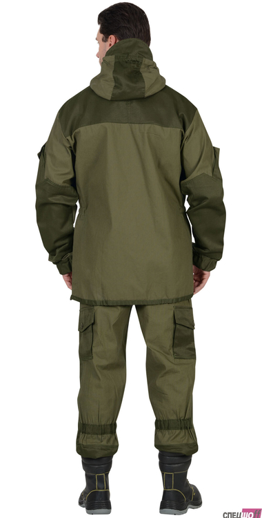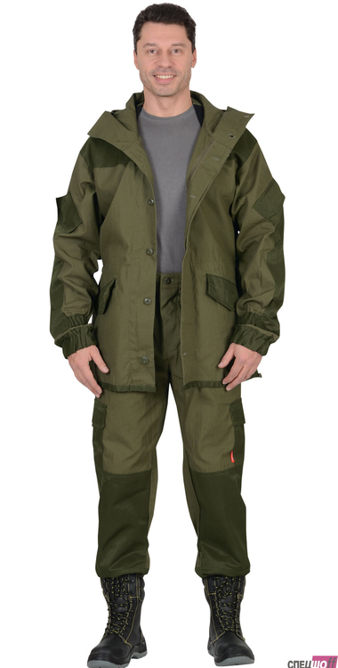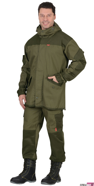 Куртка удлиненная прямого силуэта, с супатной застежкой на пуговицы, с втачным капюшоном с козырьком, с усилительными накладками, с прорезными карманами листочка и фигурными клапанами на пуговицу, с внутренним карманом. Рукава с накладными полуобъёмными карманами и фигурными клапанами на липучку, с манжетами частично стянутыми резинкой. Куртка по линии талии частично стянута резинкой, по низу куртка регулируется шнуром.