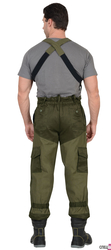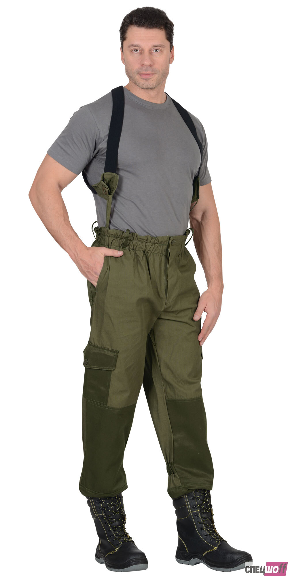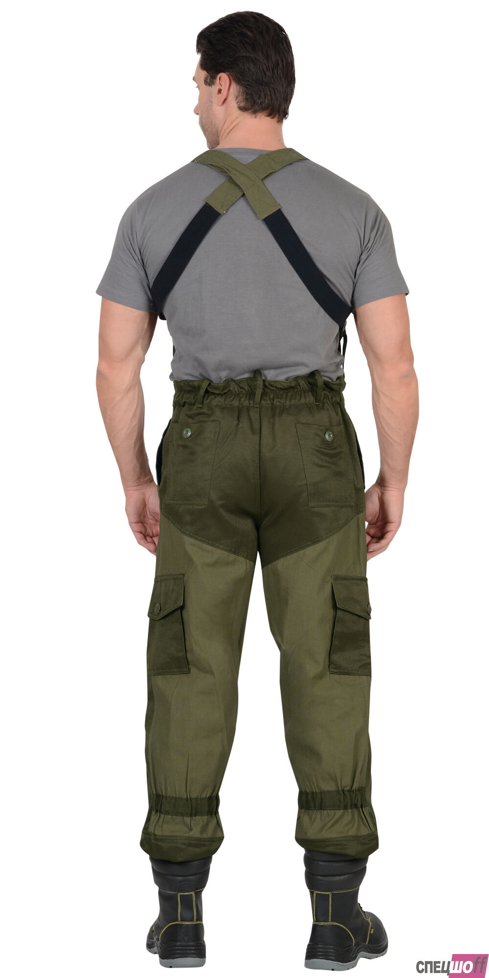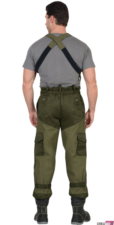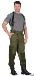 Брюки прямого силуэта, с пристёгивающимися помочами (подтяжки), с гульфиком застегивающимся на пуговицы, с цельнокроеным поясом частично стянутым резинкой и застегивающимся на пуговицы, с разными многофункциональными карманами. С усилительными накладками. Пылезащитная юбка из бязи по низу брюк. Низ брюк на резинке.