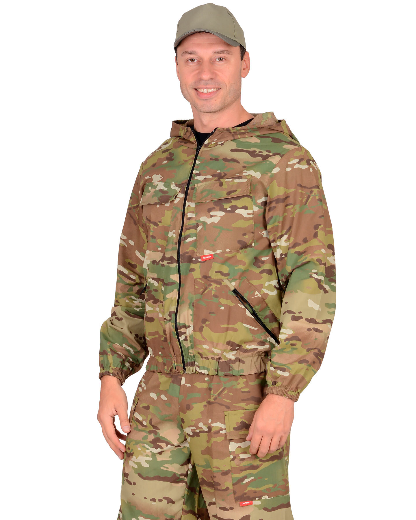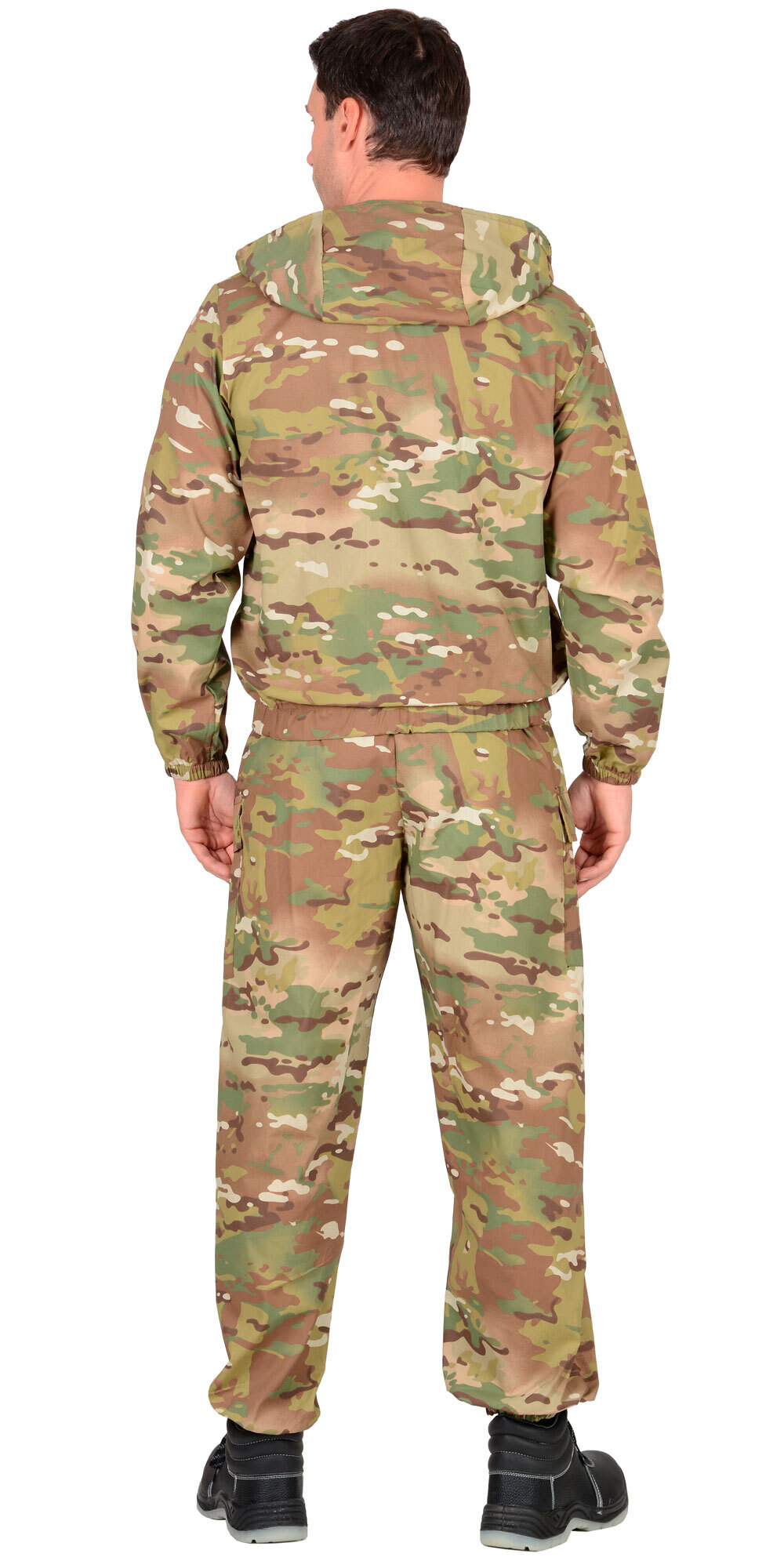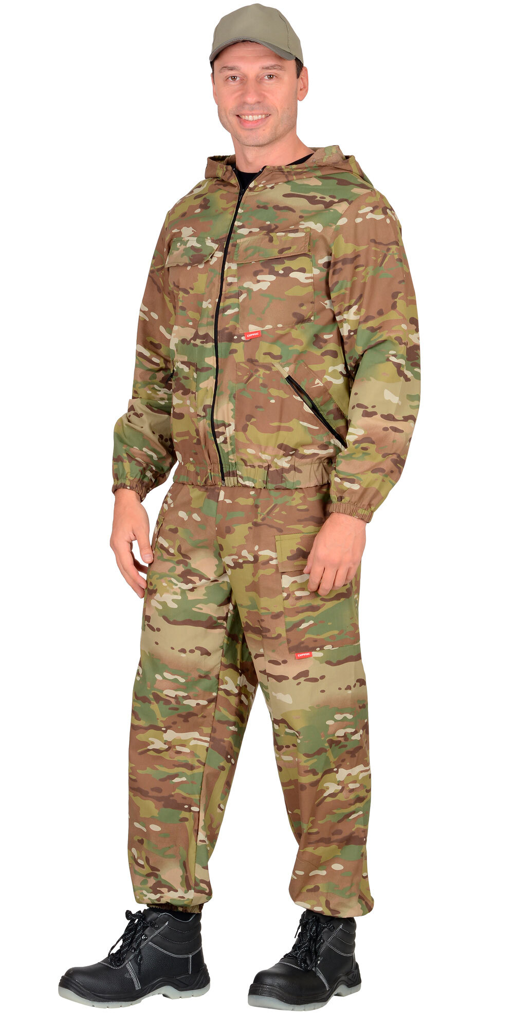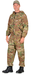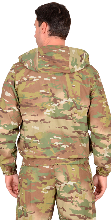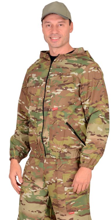 Куртка короткая, прямого силуэта, с центральной застёжкой на молнию накрытой ветрозащитным клапаном, воротник стойка, пристёгивающимся капюшоном, различными многофункциональными накладными карманами с клапанами. Рукава с манжетами и патой регулирующий ширину. Низ куртки с притачным поясом стянутым, частично, резинкой.Брюки прямые с притачным поясом стянутым, частично резинкой и застёгивающимся на пуговицу, со шлёвками, застёжкой гульфика на молнию, с различными функциональными карманами. Низ брюк регулируется эластичным шнуром.Ткань: «Родос» 65% п/э, 35 % х/б, пл. 245 г/м.ГОСТ 12.4.280-2014