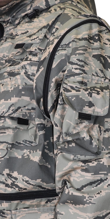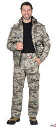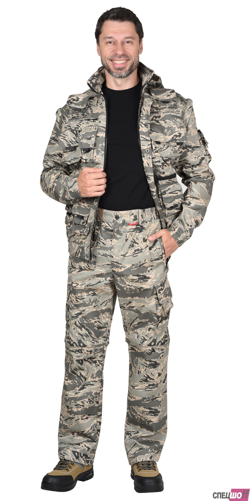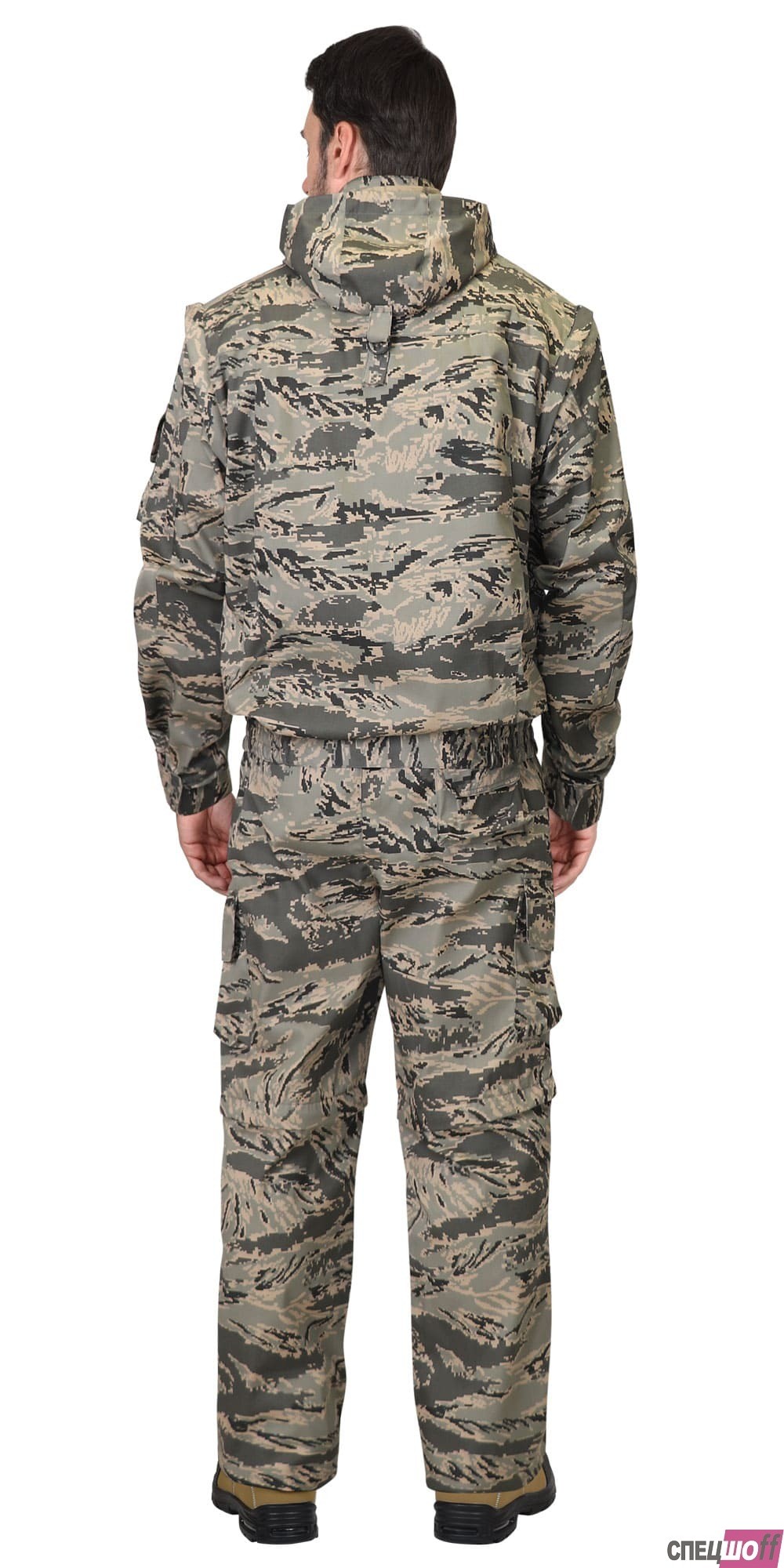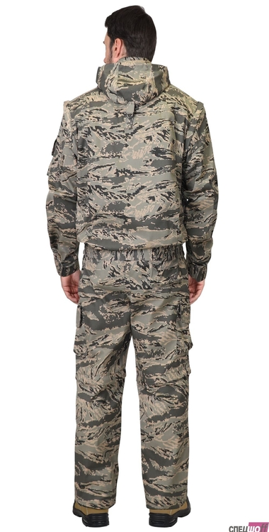Костюм "Тигр" состоит из куртки и брюк. Куртка короткая прямого силуэта, с центральной застёжкой на молнию, накрытую ветрозащитным клапаном на кнопки. Изделие с воротником стойка и со съёмным капюшоном, с различными многофункциональными карманами с молнией и с клапанами на «липучках». Рукава съёмные, пристёгиваются на молнию, манжеты рукавов с патой регулирующие ширину при помощи липучки. Низ куртки с притачным поясом частично стянутым, резинкой. Брюки прямые с застёжкой гульфика на тесьму «молния», с различными многофункциональными карманами, с притачным поясом частично стянутым резинкой и застёгивающимся на пуговицу, пояс с 5-ю шлёвками. Низ брюк отстёгивается для трансформации брюк в шорты.